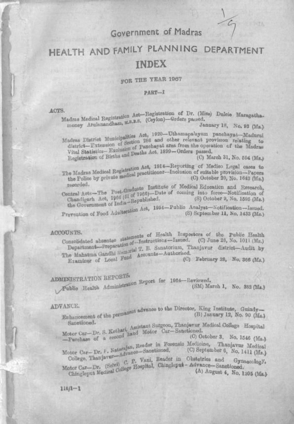 Index to the proceedings of the Madras Government in the Agriculture department, for the year 1967 - Part 1