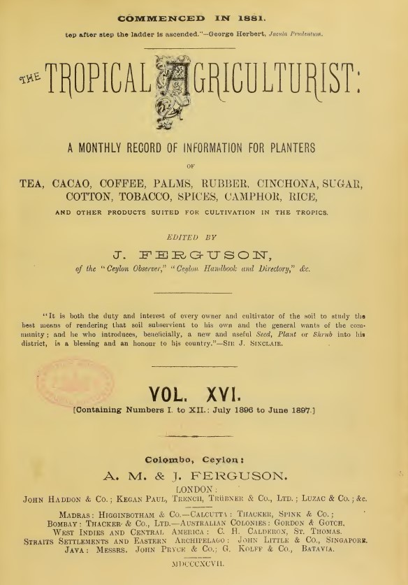 The tropical agriculturist : a monthly record of information for planters of tea, cacao, coffee, palms, rubber, cinchona, sugar, cotton, tobacco, spices, camphor, rice, and other products suited for cultivation in the tropics