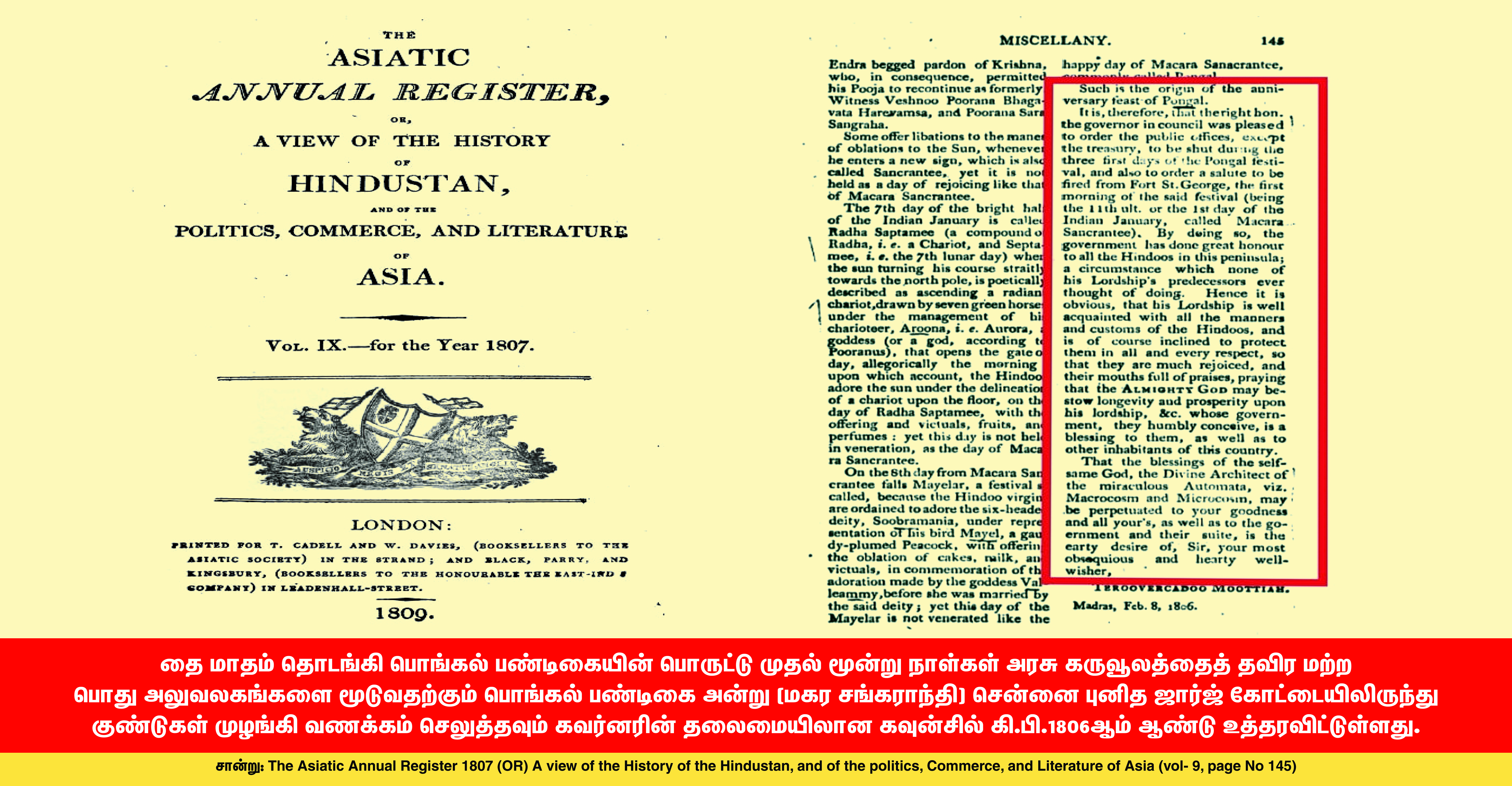 Governor's Council announcing a three-days holiday for Pongal in 1806