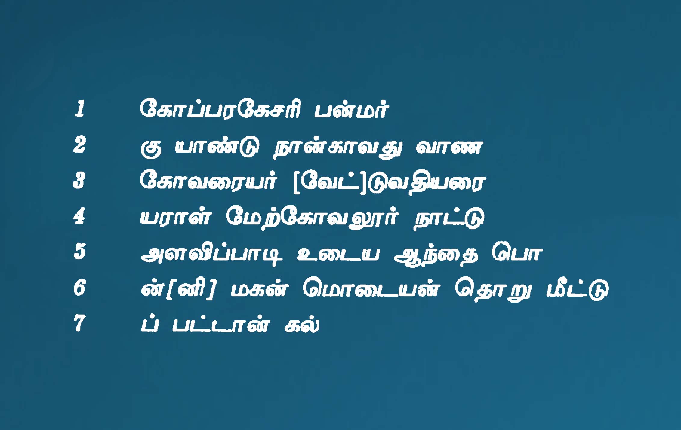 | கல்வெட்டுமின்னுருவாக்கப்பட்டது/ சேகரிக்கப்பட்டதுநிறுவனத்தின்பெயர் | தமிழ்நாடு அரசு தொல்லியல் துறை |