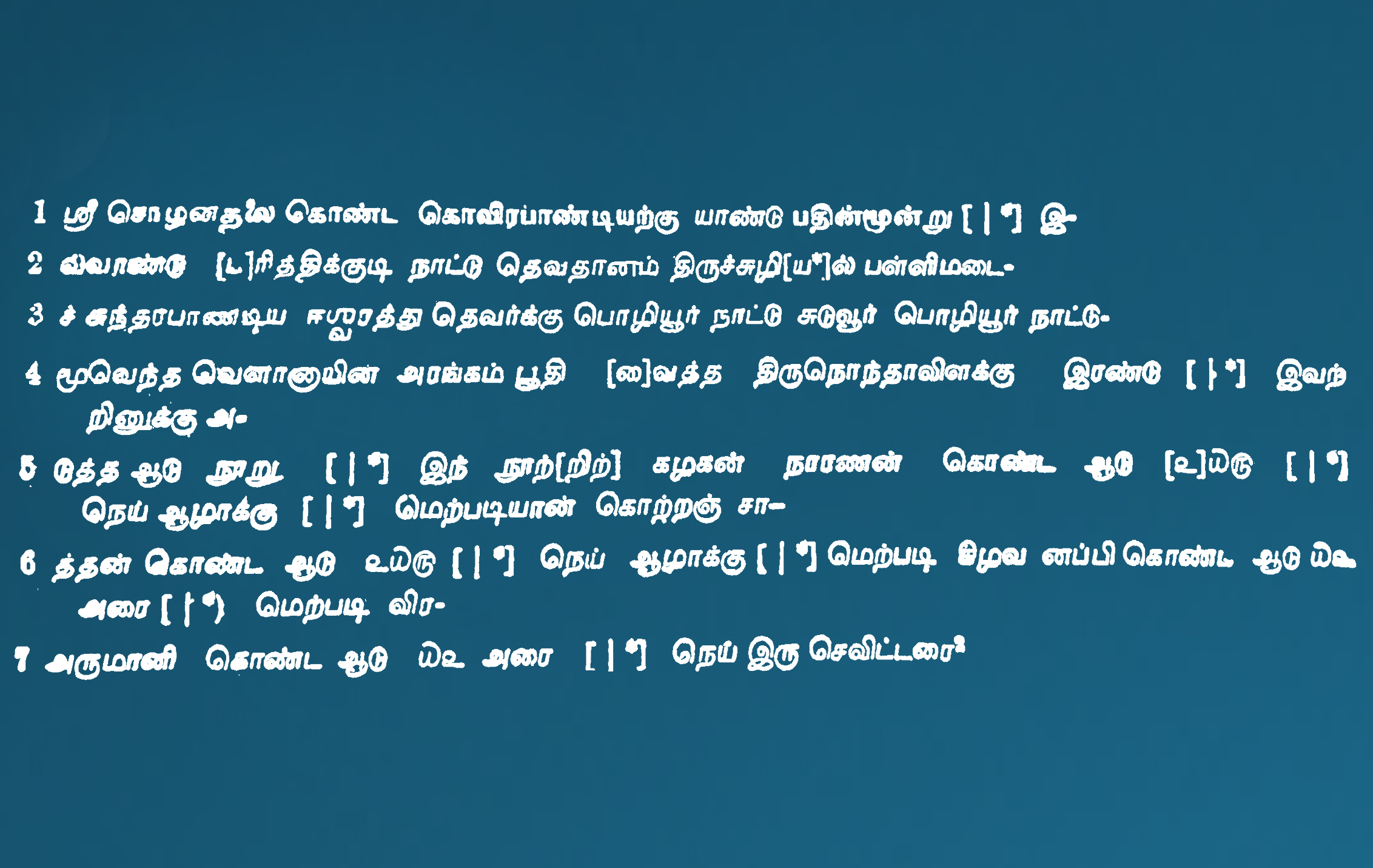 | கல்வெட்டுமின்னுருவாக்கப்பட்டது/ சேகரிக்கப்பட்டதுநிறுவனத்தின்பெயர் | தமிழ்நாடு அரசு தொல்லியல் துறை |