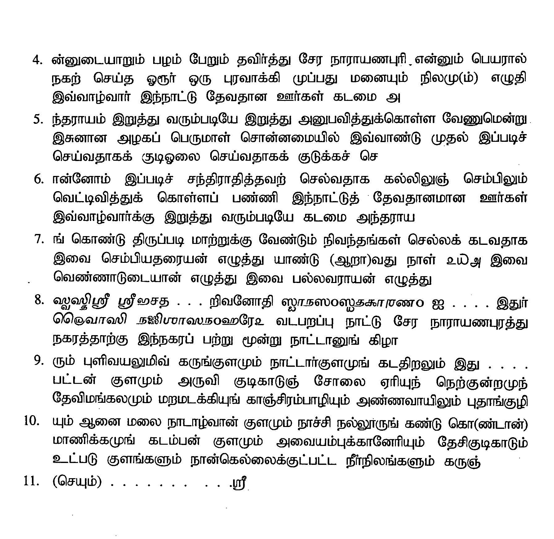 ‘பூவின் கிழத்தி' எனத் தொடங்கும் மெய்க்கீர்த்தியினனான சடையவர்மன் குலசேகரனின் கல்வெட்டாகும். கீழிரணிய முட்டத்தைச் சேர்ந்த திருமாலிருஞ்சோலை நின்றருளிய பரமசுவாமிகளாகிய இவ்வூர் இறைவர்க்கு திருப்படி மாற்றுள்ளிட்டு வேண்டும் என கோயில் ஸ்ரீகாரியம் செய்வனும் ஸ்ரீவைஷ்ணவரும் கேட்டுக்கொண்டதற்கிணங்க, மன்னன் திருவாய் மொழிந்தருளினபடி நிவந்தங்களுக்கு விடப்பட்ட நிலதானம் பற்றிய செய்தியினை இக்கல்வெட்டு தருகின்றது. இத்தானம் பதின்மூன்றாம் ஆண்டு தொடங்கி தொடர்ந்து நடந்தது என்பதை எதிராமாண்டு, எதிராமாண்டின் எதிராமாண்டு எனக் குறித்து கல்வெட்டப்பட்டுள்ளது. இத்தேவதான நிலங்கள் அடங்கிய ஊர்க்கு திருமலையுடையான் விளாகம் என்று பெயரிடப்பட்டதையும் அறியமுடிகின்றது.