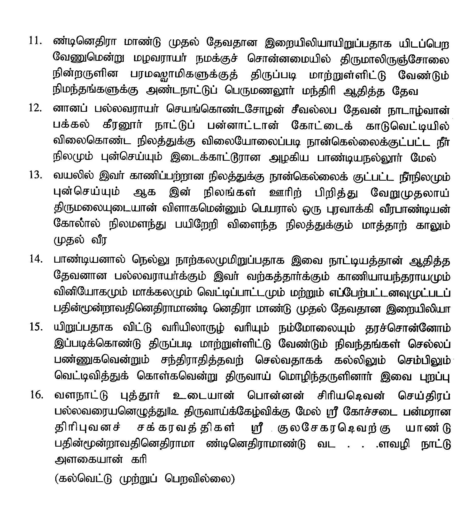 பூவின் கிழத்தி எனத் தொடங்கும் மெய்க்கீர்த்திக்கு உரியவனான குலசேகரனின் கல்வெட்டாகும். இவ்விறைவர்க்கும், இக்கோயில் ஸ்ரீவைஷ்ணவர்களுக்கும், நம்பு செய்வானுக்கும் நிலத்தானம் கொடுக்கப்பட்டது. இவ்விறைவர்க்கு ஆடித்திருநாள், ஐப்பசித் திருநாள், மார்கழித் திருநாள் சிறப்புற நடத்துவதற்கு மடப்புற இறையிலியாக நிலம் தானமாக வழங்கப்பட்டது. மேலும் இவ்விறைவனுக்கு திருப்பள்ளித் தொங்கல்புறமாக இரண்டு வேலி நிலம் தானமாக வழங்கப்ட்டதையும் தெரிவிக்கின்றது.