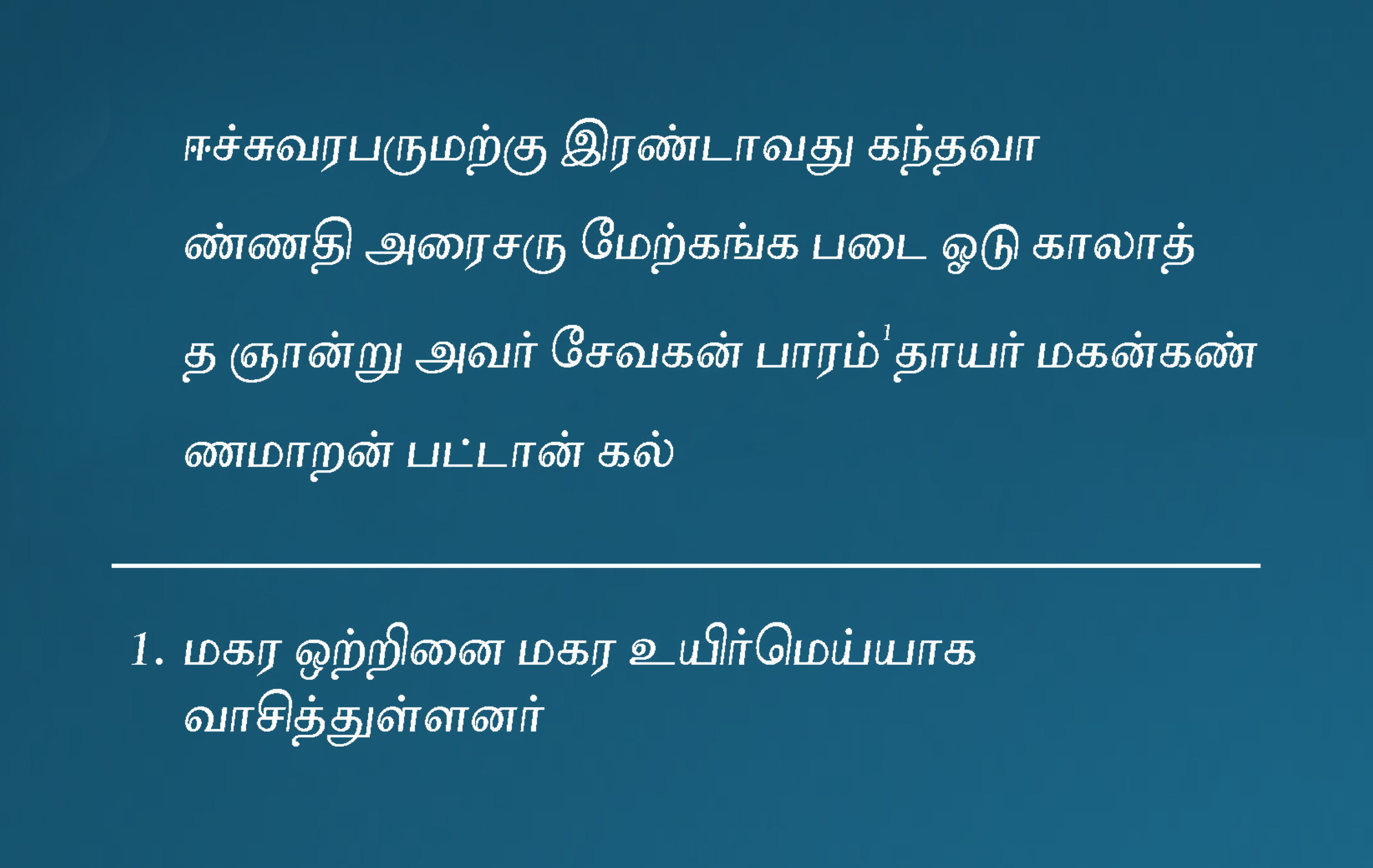 | கல்வெட்டுமின்னுருவாக்கப்பட்டது/ சேகரிக்கப்பட்டதுநிறுவனத்தின்பெயர் | தமிழ்நாடு அரசு தொல்லியல் துறை |