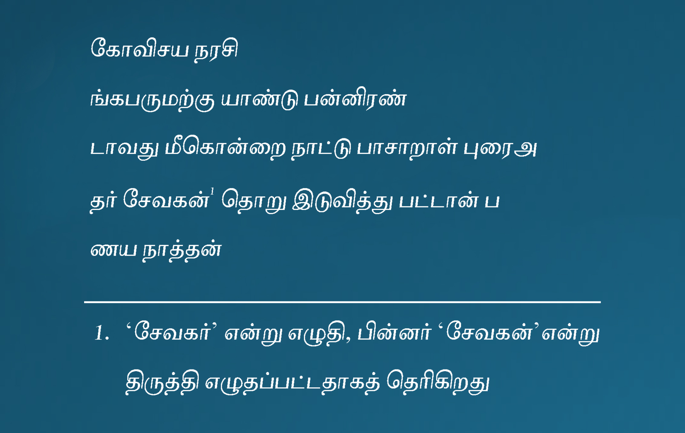 | கல்வெட்டுமின்னுருவாக்கப்பட்டது/ சேகரிக்கப்பட்டதுநிறுவனத்தின்பெயர் | தமிழ்நாடு அரசு தொல்லியல் துறை |