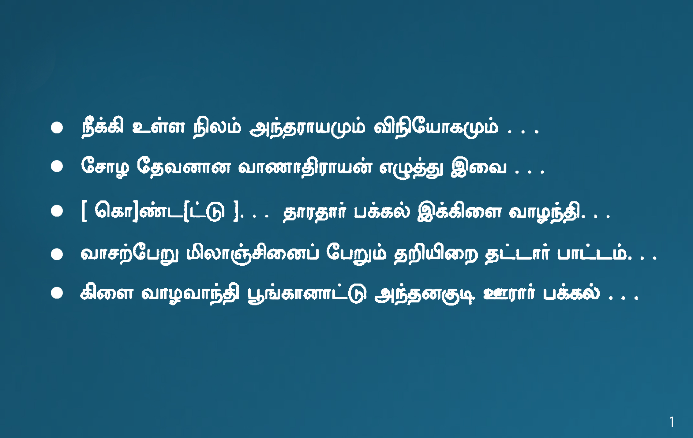 | கல்வெட்டுமின்னுருவாக்கப்பட்டது/ சேகரிக்கப்பட்டதுநிறுவனத்தின்பெயர் | தமிழ்நாடு அரசு தொல்லியல் துறை |