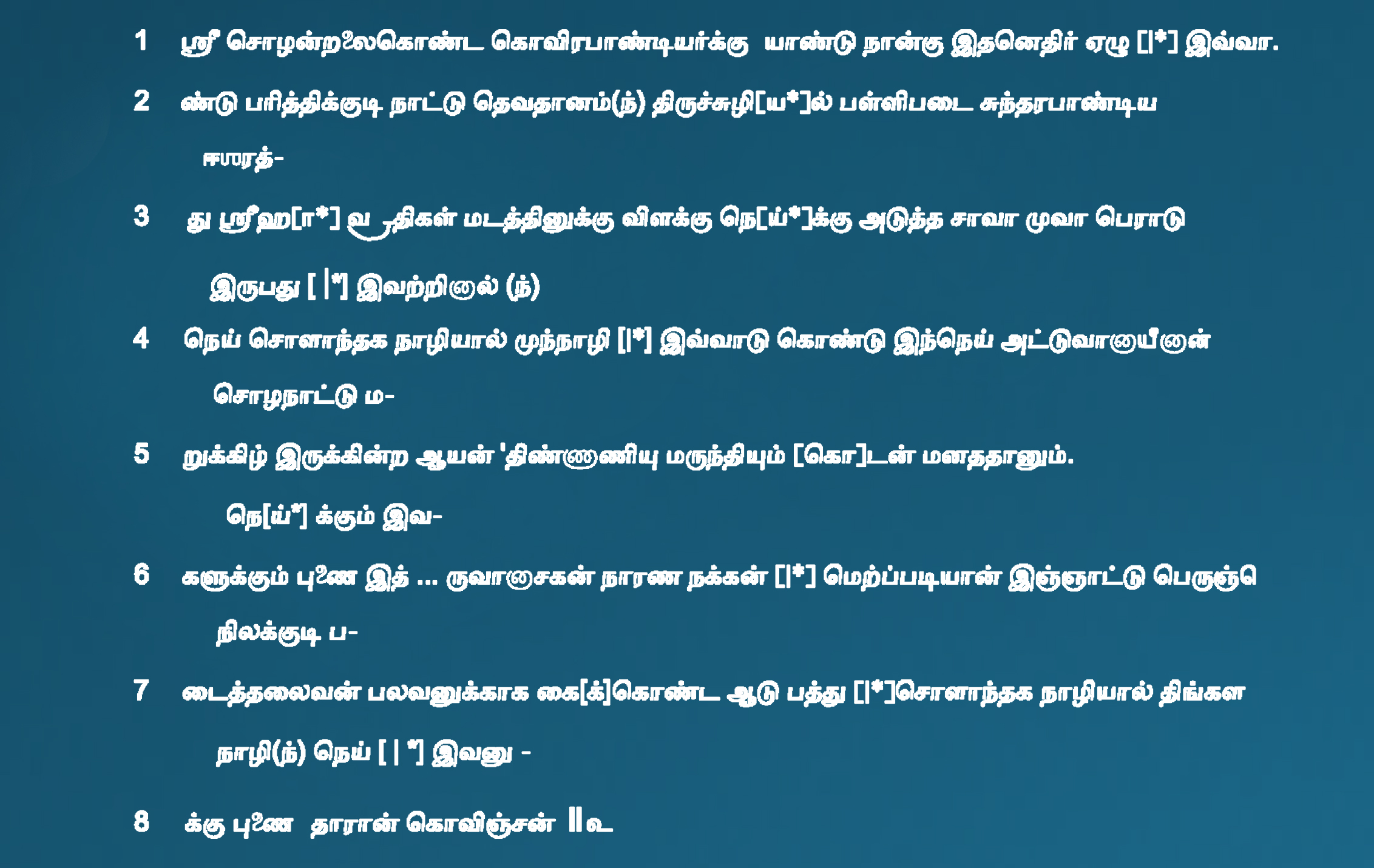 | கல்வெட்டுமின்னுருவாக்கப்பட்டது/ சேகரிக்கப்பட்டதுநிறுவனத்தின்பெயர் | தமிழ்நாடு அரசு தொல்லியல் துறை |