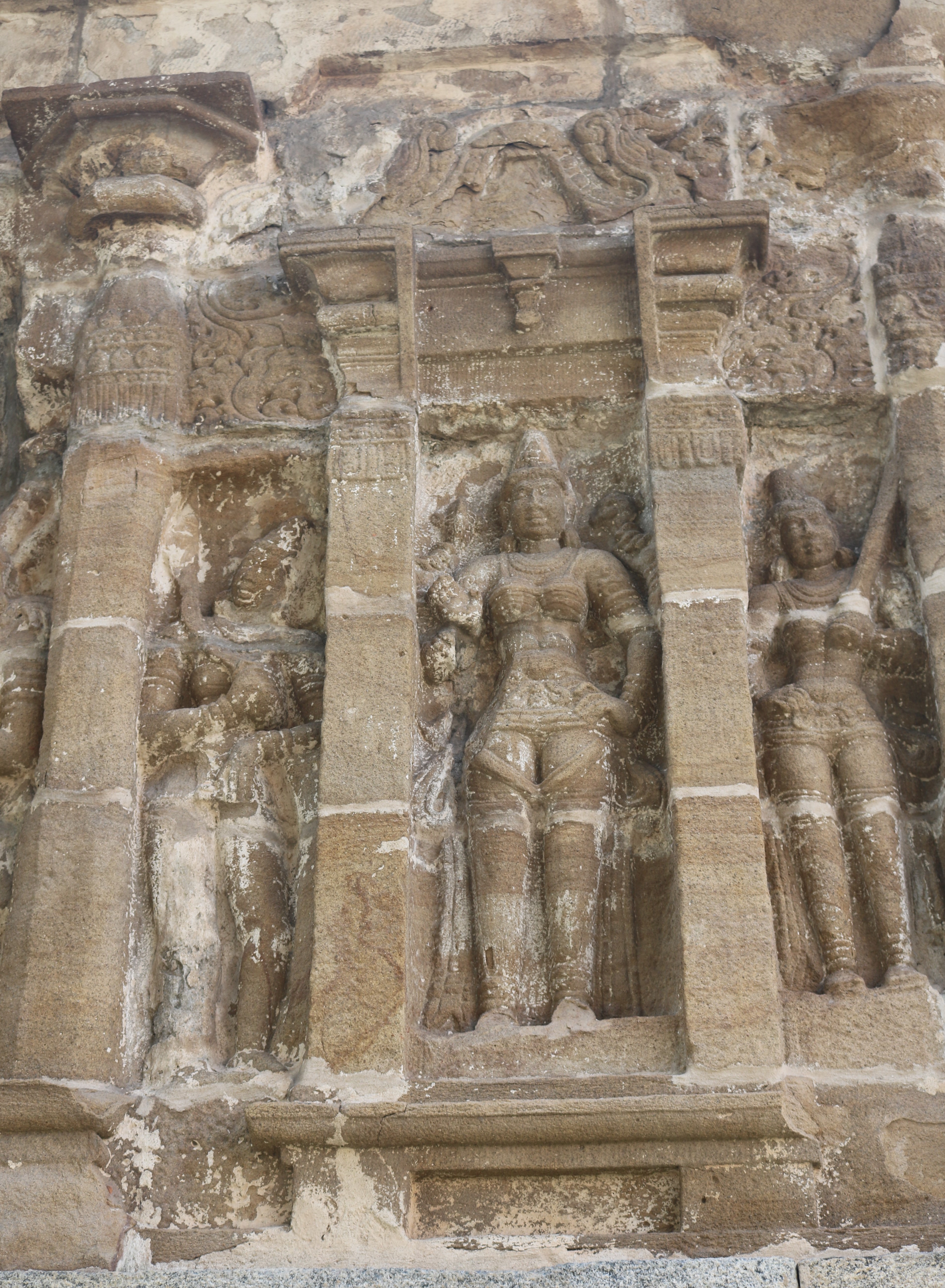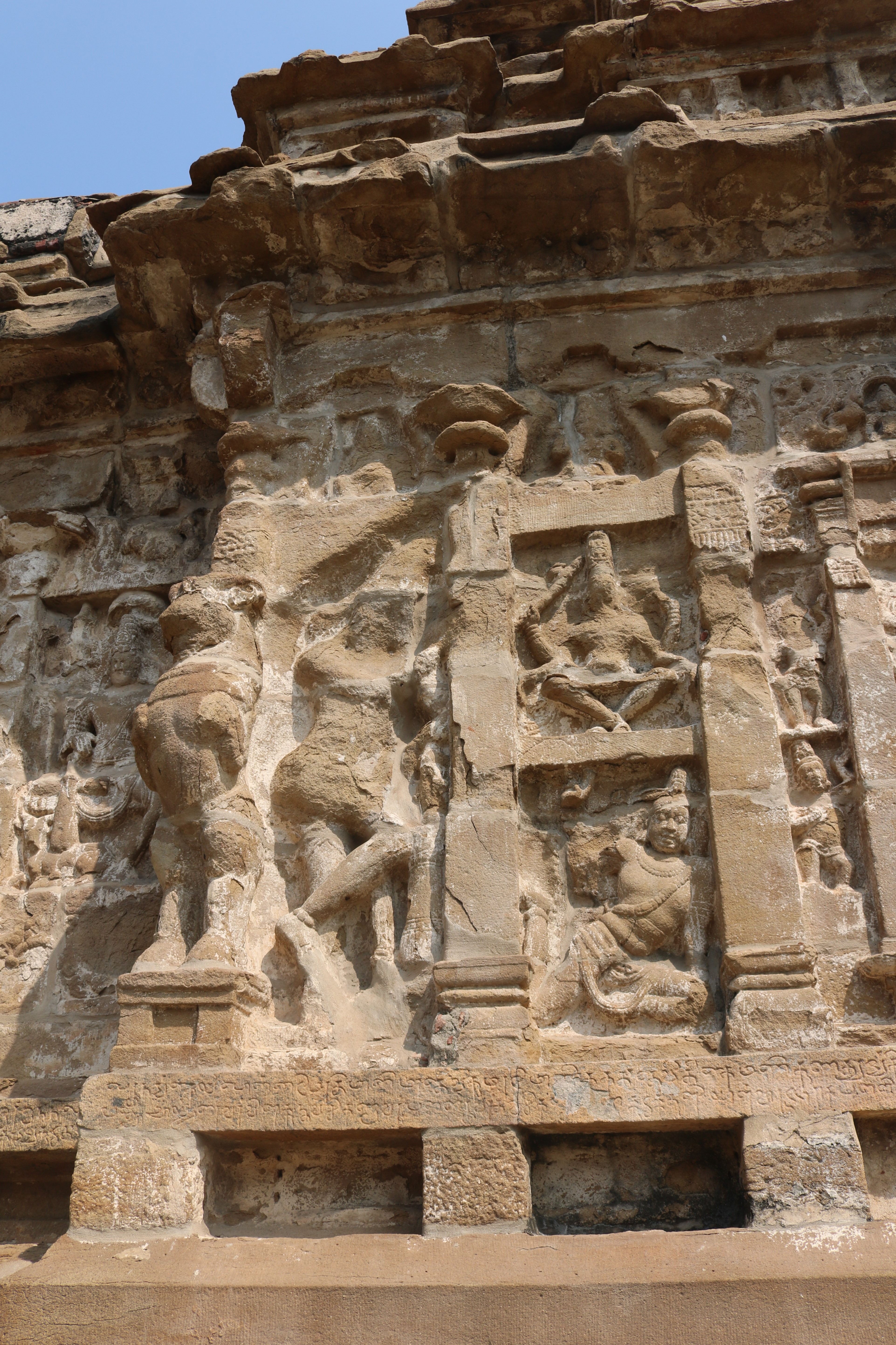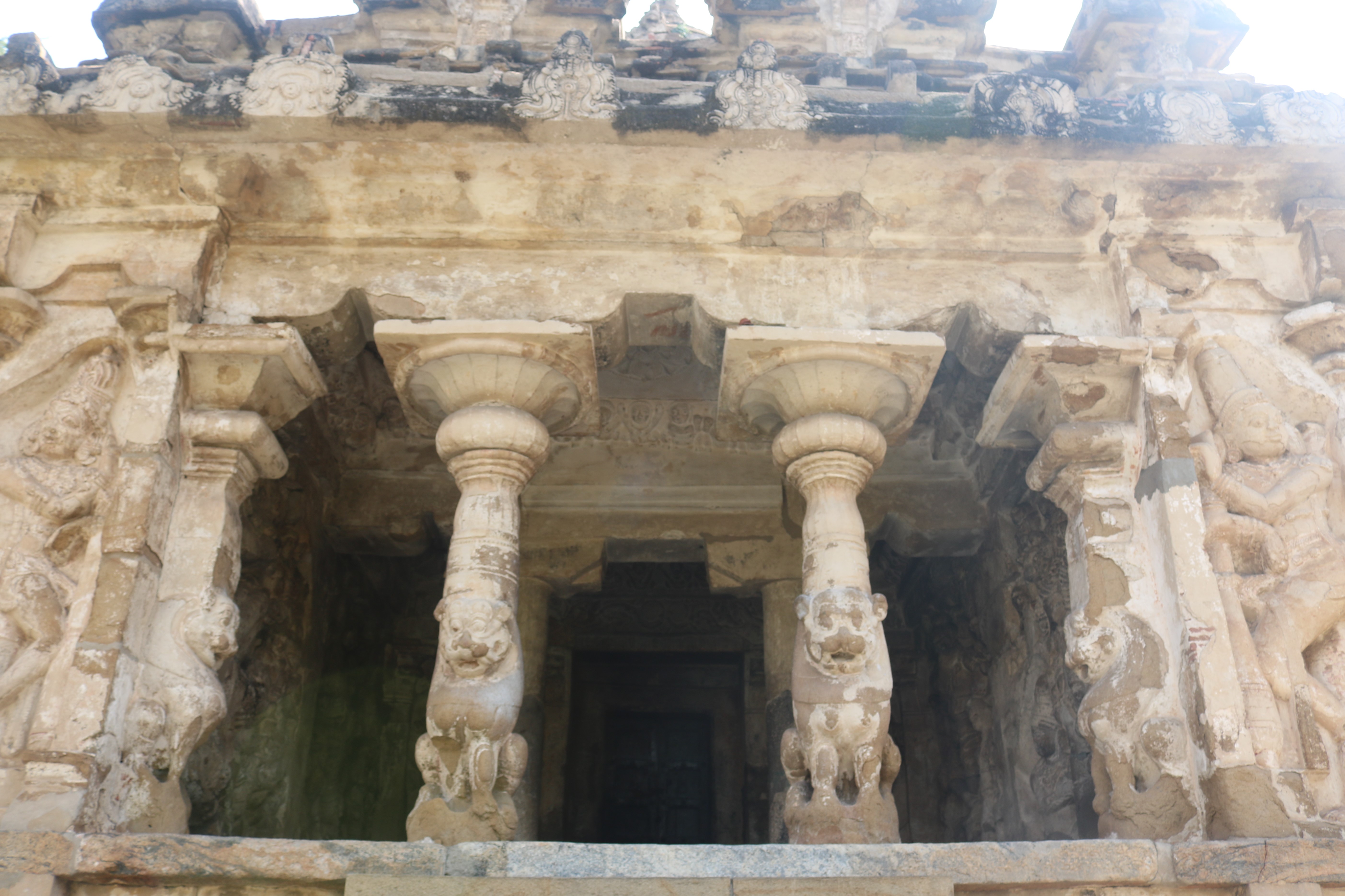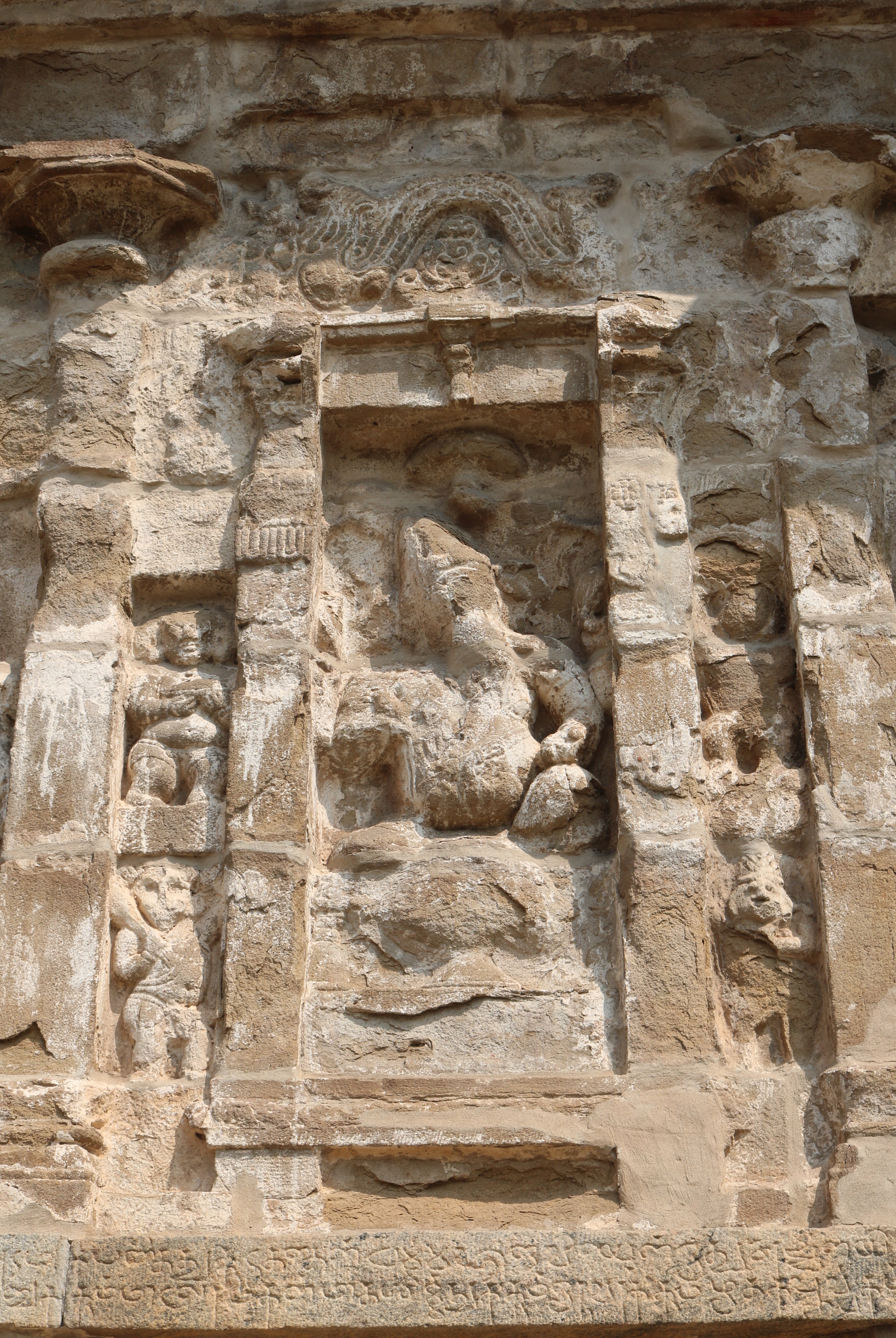 | சிற்பங்கள் | கருவறைக் கோட்டங்களின் வெளிப்புறச் சுவரில் தெற்கில் தென்முகக் கடவுள் (தட்சிணாமூர்த்தி) தனது பரிவாரங்களுடன் உள்ளார். மேற்கில் ஆனையுரித்த பிரான் (கஜசம்ஹாரமூர்த்தி), ஆடல்வல்லான், சண்டேசருக்கு அருள்பாலித்த சண்டேச அனுக்கிரக மூர்த்தி உள்ளார். வடக்கில் காலனை வதைத்த காலாரி (காலாந்த மூர்த்தி), இராவணனுக்கு அருள் செய்த இராவணானுக்கிரக மூர்த்தி, கங்கையை சடையில் தாங்கிய கங்காதர மூர்த்தி உள்ளார். அர்த்த மண்டபக் கோட்டங்களில் தெற்கில் விநாயகர் தனது பரிவாரங்களுடனும், வடக்கில் எருமைத்தலையனை வென்ற தேவி விஷ்ணு துர்க்கை அமைக்கப்பட்டுள்ளனர். |