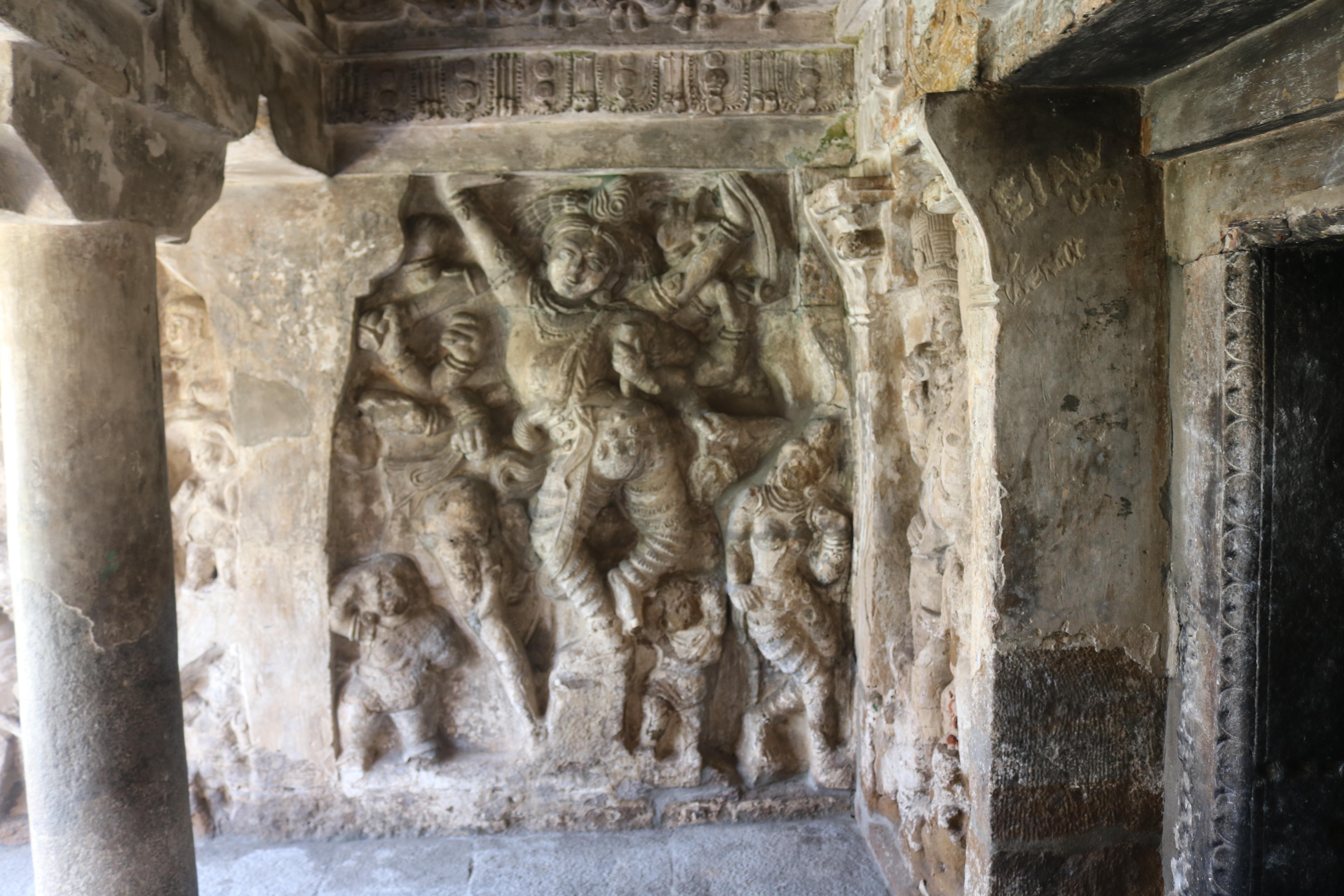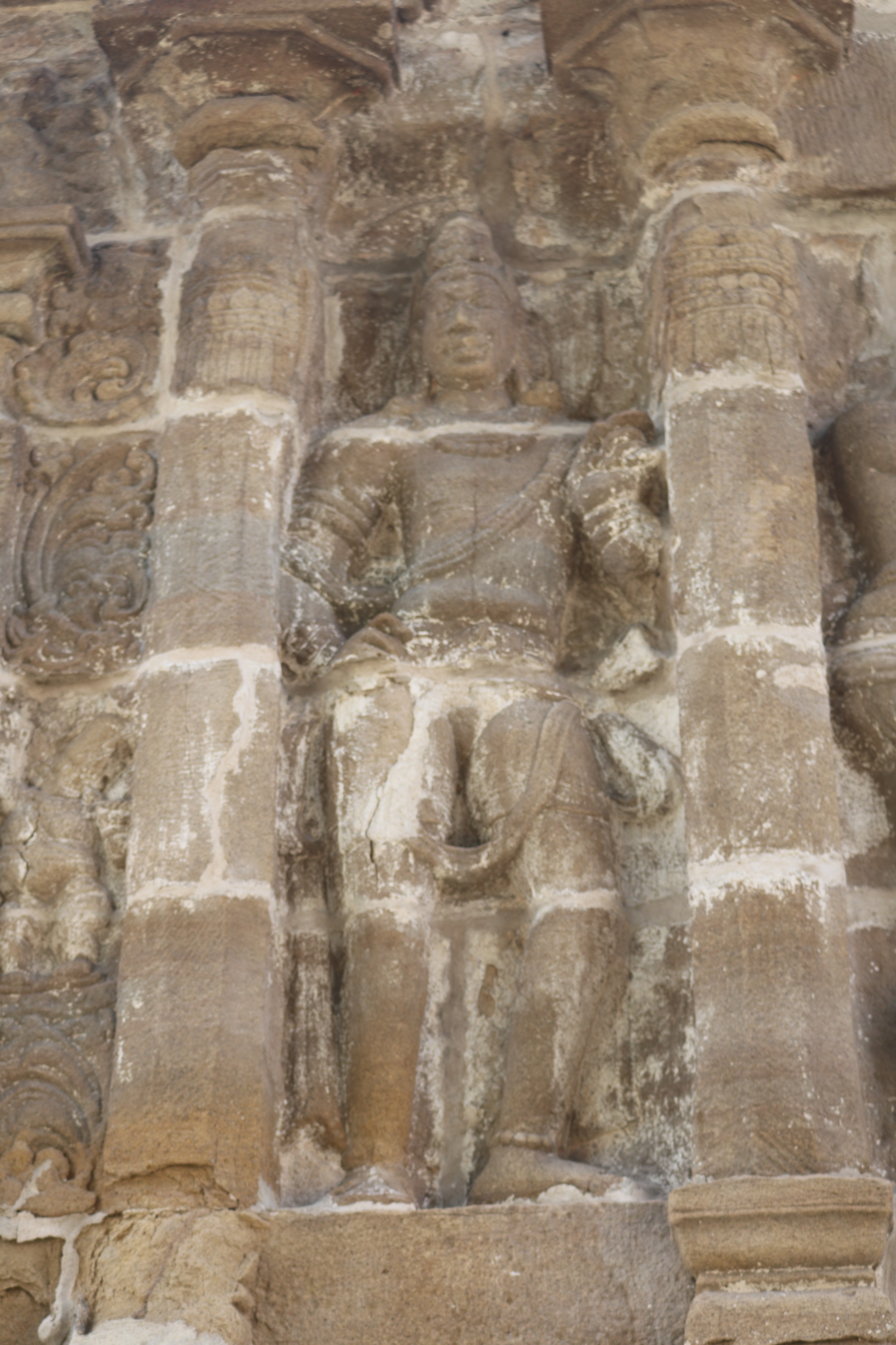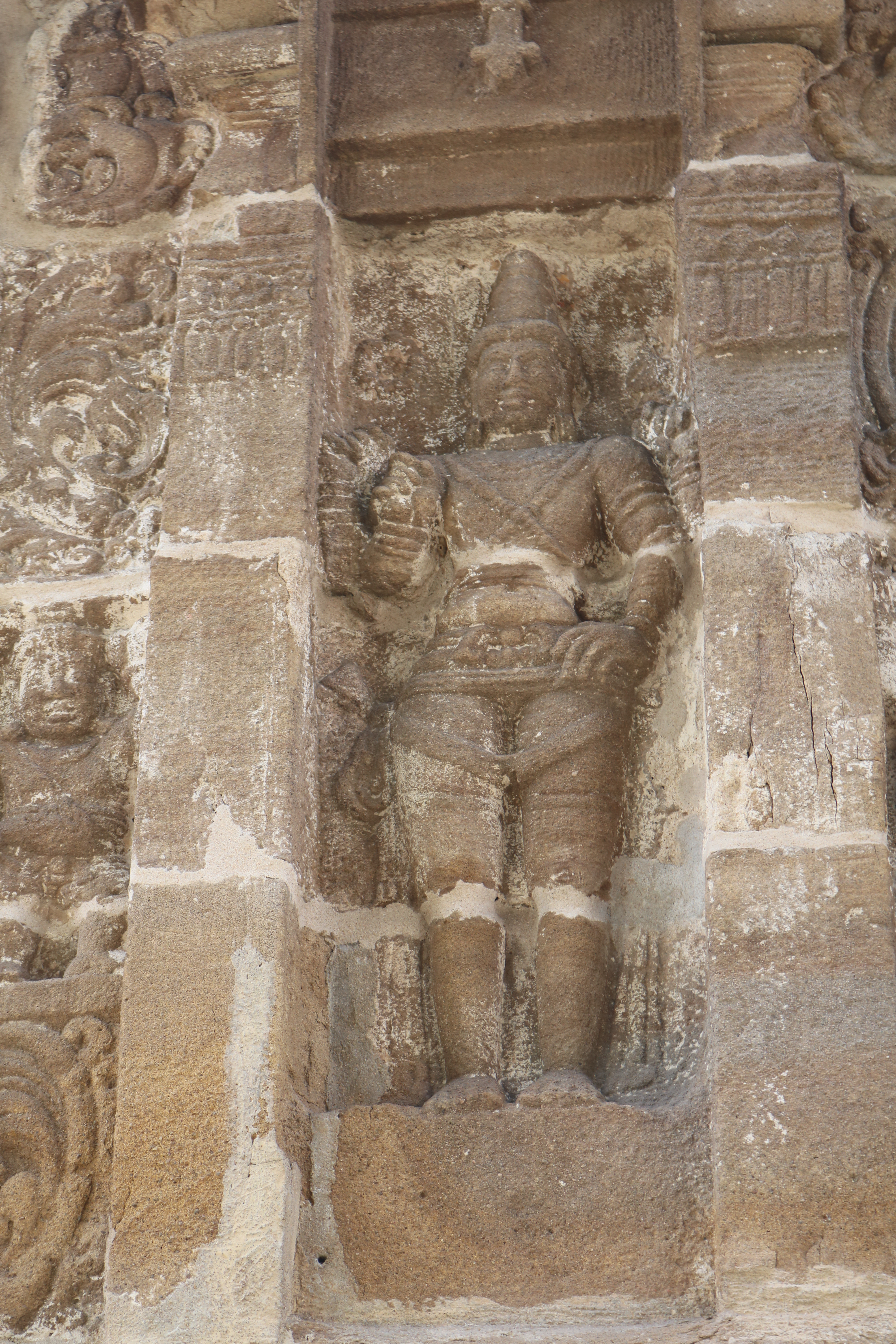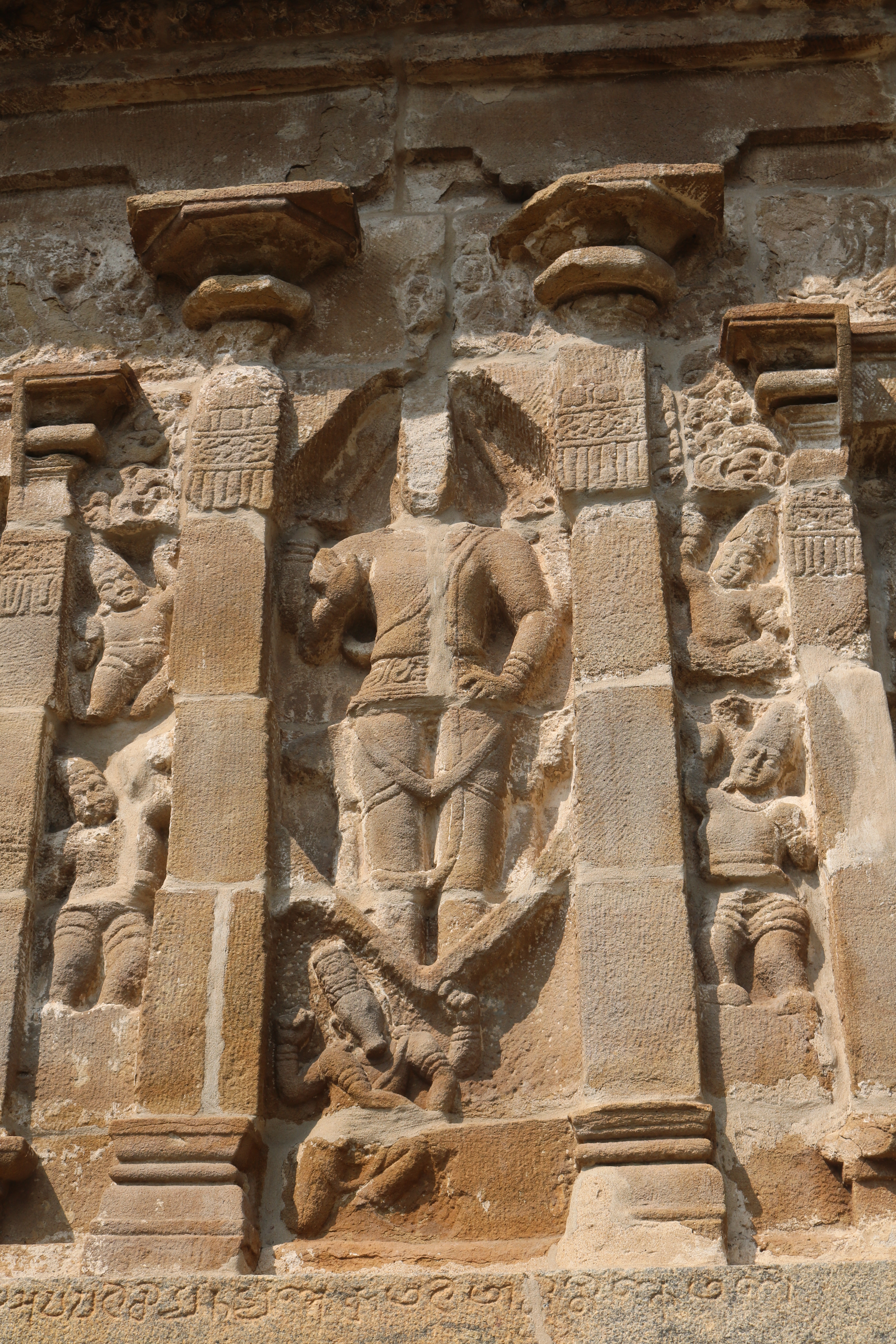 | சிற்பங்கள் | கருவறைக் கோட்டங்களின் வெளிப்புறச் சுவரில் தெற்கில் தென்முகக் கடவுள் (தட்சிணாமூர்த்தி) தனது பரிவாரங்களுடன் உள்ளார். மேற்கில் ஆனையுரித்த பிரான் (கஜசம்ஹாரமூர்த்தி), ஆடல்வல்லான், சண்டேசருக்கு அருள்பாலித்த சண்டேச அனுக்கிரக மூர்த்தி உள்ளார். வடக்கில் காலனை வதைத்த காலாரி (காலாந்த மூர்த்தி), இராவணனுக்கு அருள் செய்த இராவணானுக்கிரக மூர்த்தி, கங்கையை சடையில் தாங்கிய கங்காதர மூர்த்தி உள்ளார். அர்த்த மண்டபக் கோட்டங்களில் தெற்கில் விநாயகர் தனது பரிவாரங்களுடனும், வடக்கில் எருமைத்தலையனை வென்ற தேவி விஷ்ணு துர்க்கை அமைக்கப்பட்டுள்ளனர். |