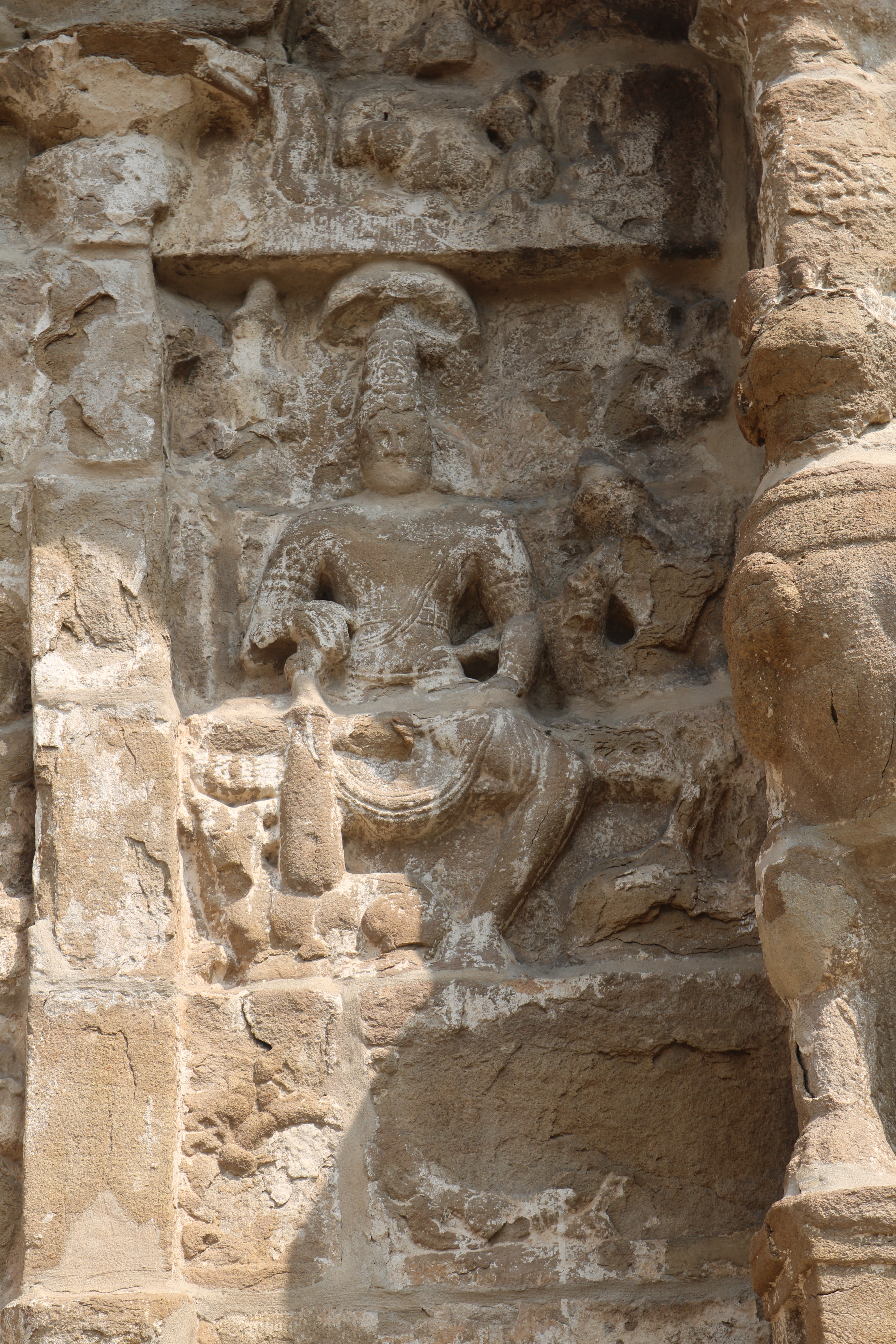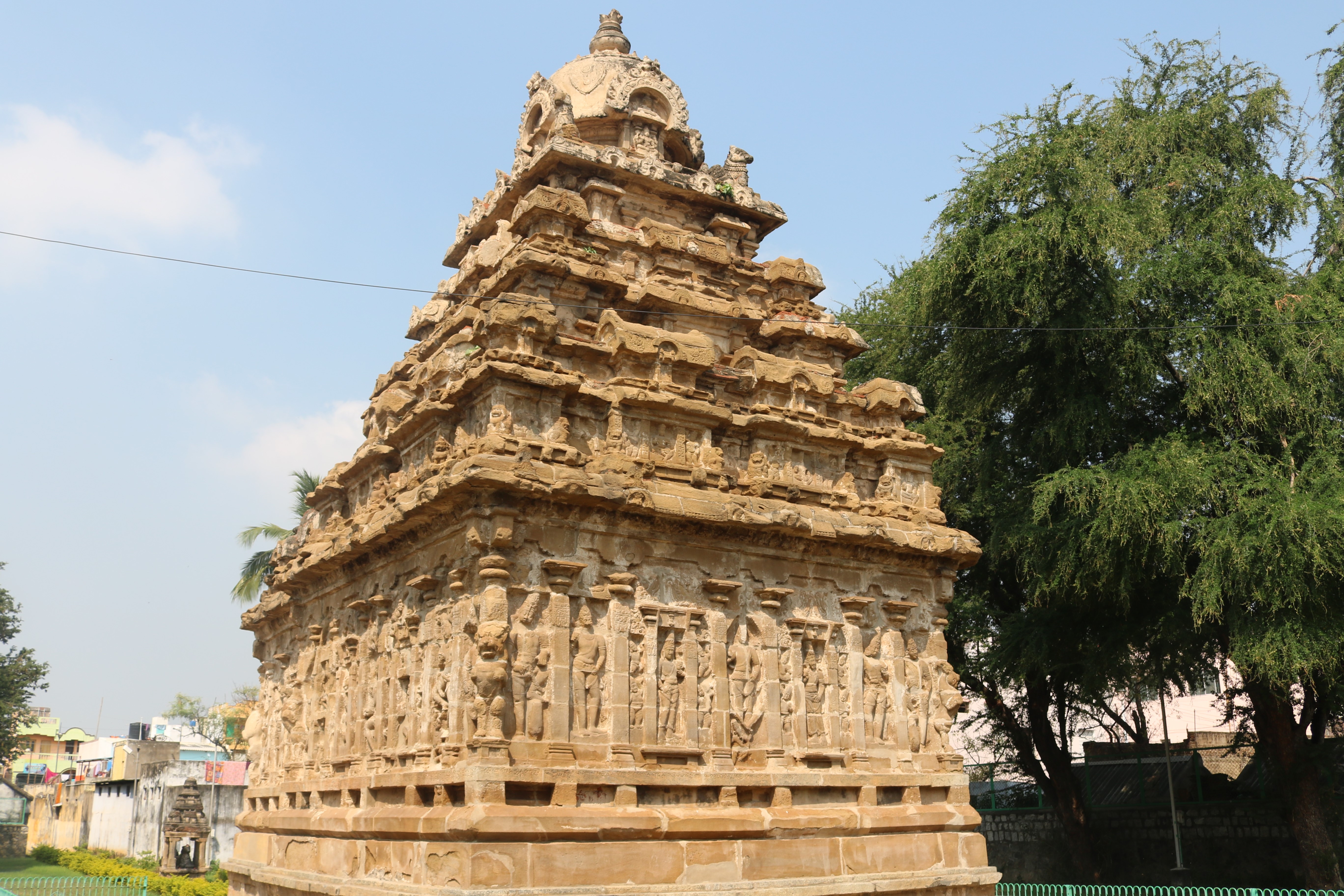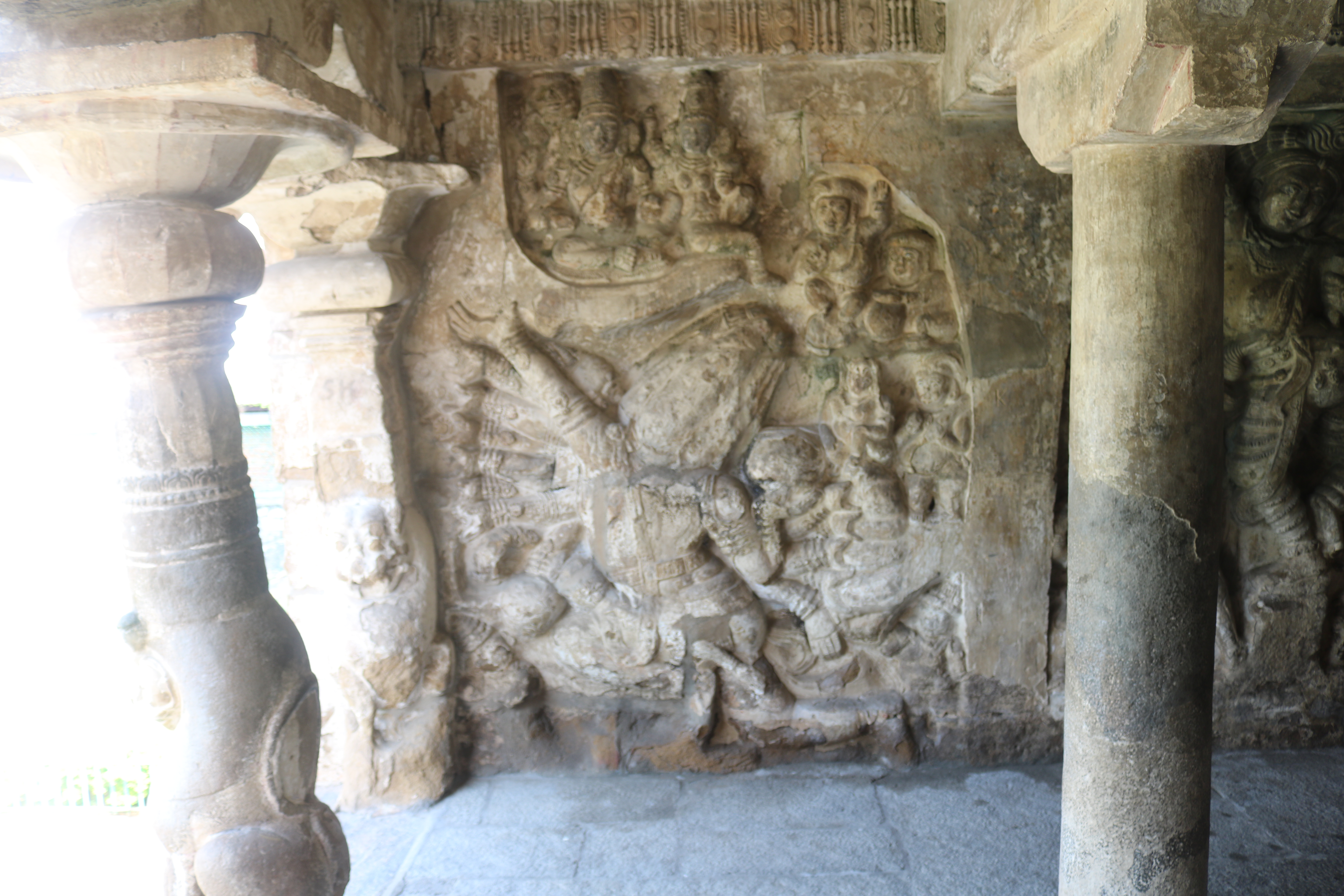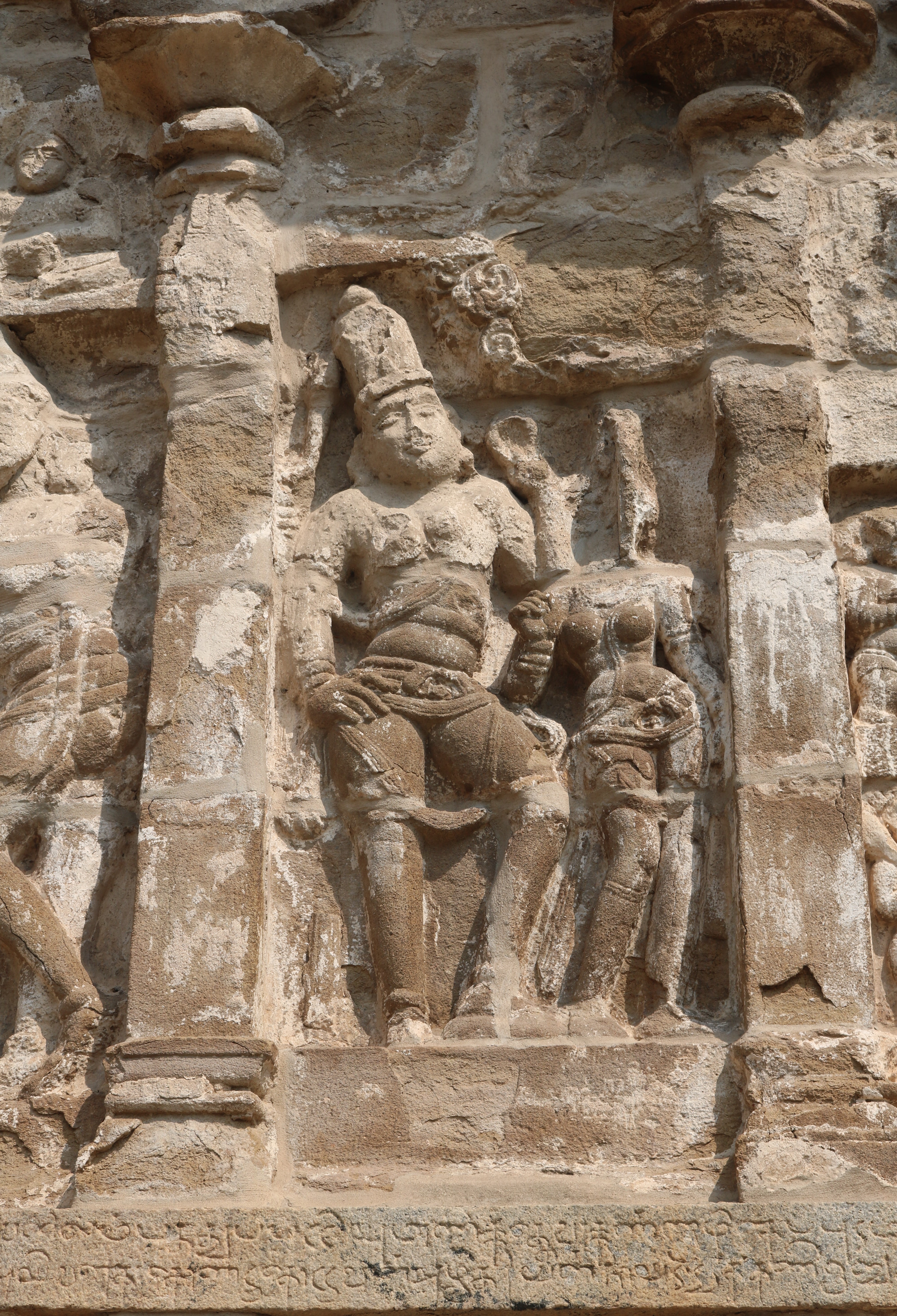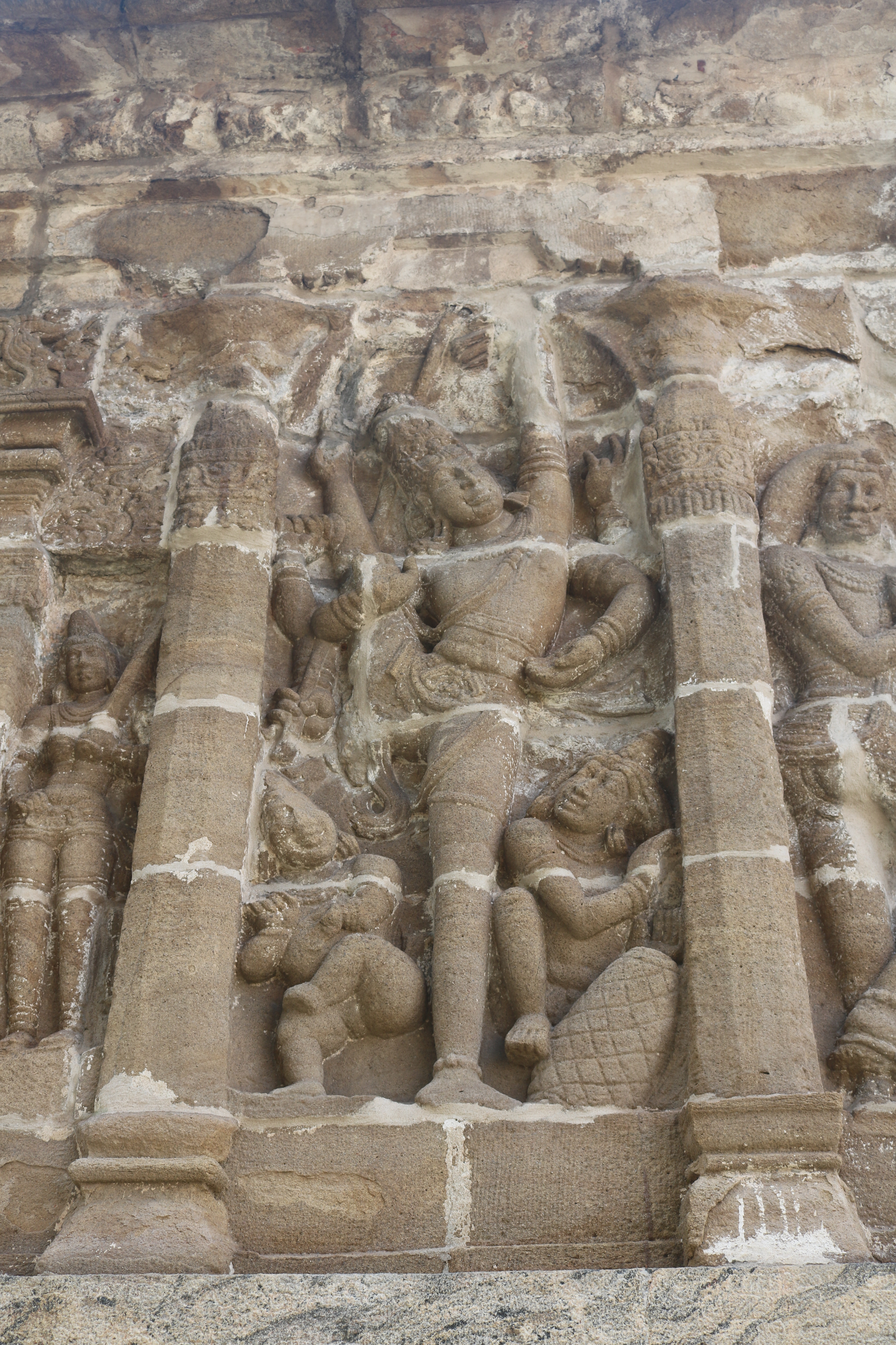 | சிற்பங்கள் | கருவறைக் கோட்டங்களின் வெளிப்புறச் சுவரில் தெற்கில் தென்முகக் கடவுள் (தட்சிணாமூர்த்தி) தனது பரிவாரங்களுடன் உள்ளார். மேற்கில் ஆனையுரித்த பிரான் (கஜசம்ஹாரமூர்த்தி), ஆடல்வல்லான், சண்டேசருக்கு அருள்பாலித்த சண்டேச அனுக்கிரக மூர்த்தி உள்ளார். வடக்கில் காலனை வதைத்த காலாரி (காலாந்த மூர்த்தி), இராவணனுக்கு அருள் செய்த இராவணானுக்கிரக மூர்த்தி, கங்கையை சடையில் தாங்கிய கங்காதர மூர்த்தி உள்ளார். அர்த்த மண்டபக் கோட்டங்களில் தெற்கில் விநாயகர் தனது பரிவாரங்களுடனும், வடக்கில் எருமைத்தலையனை வென்ற தேவி விஷ்ணு துர்க்கை அமைக்கப்பட்டுள்ளனர். |