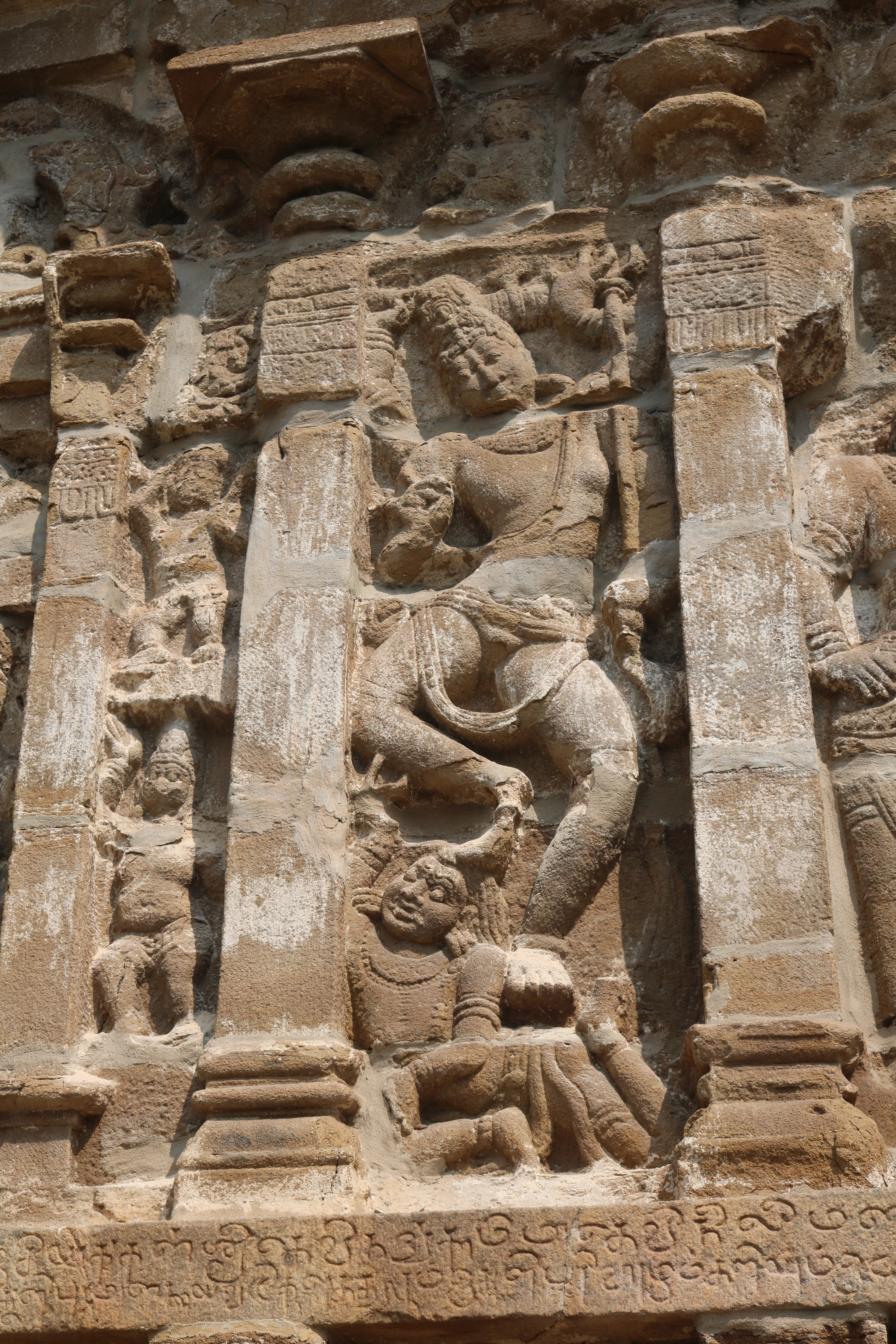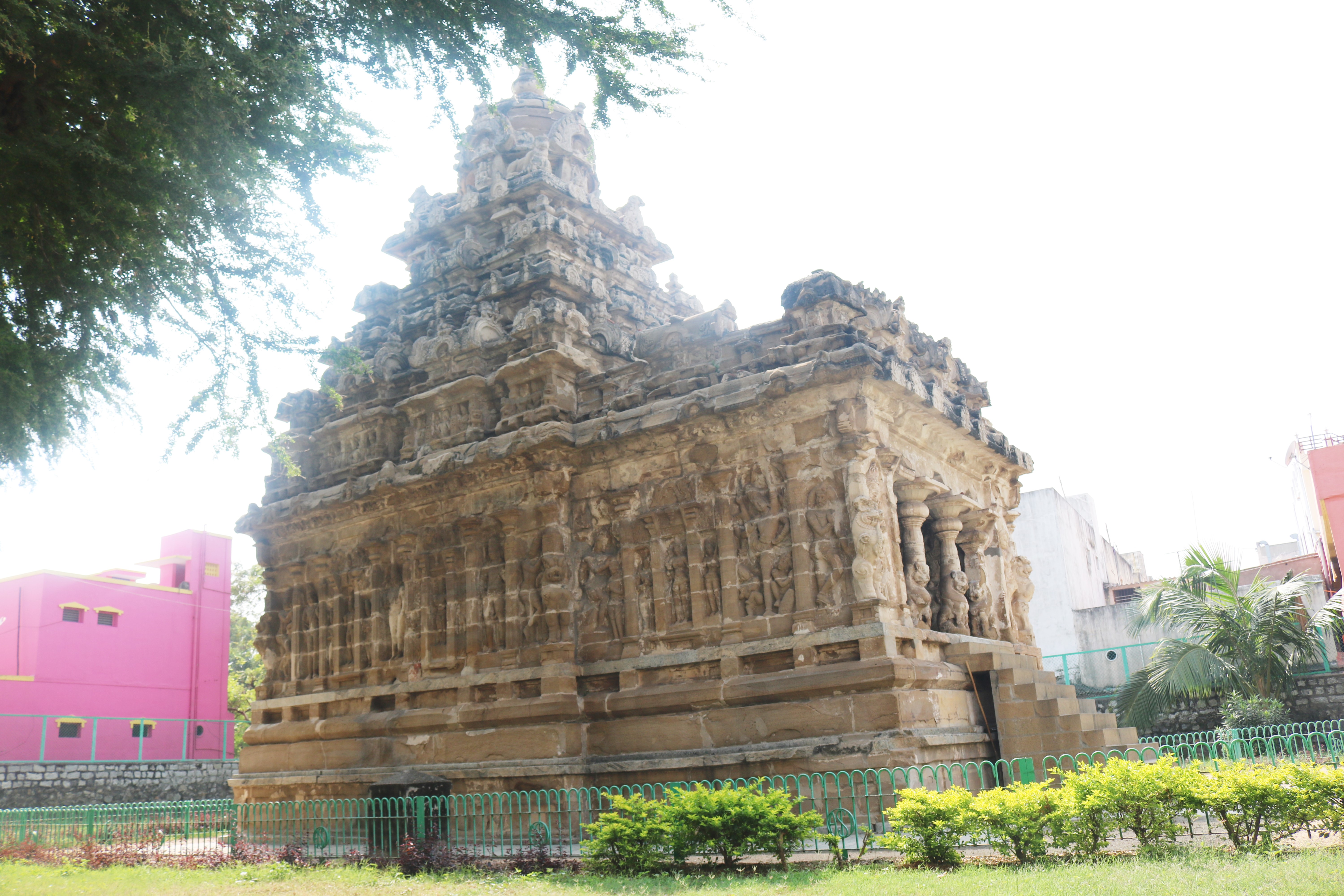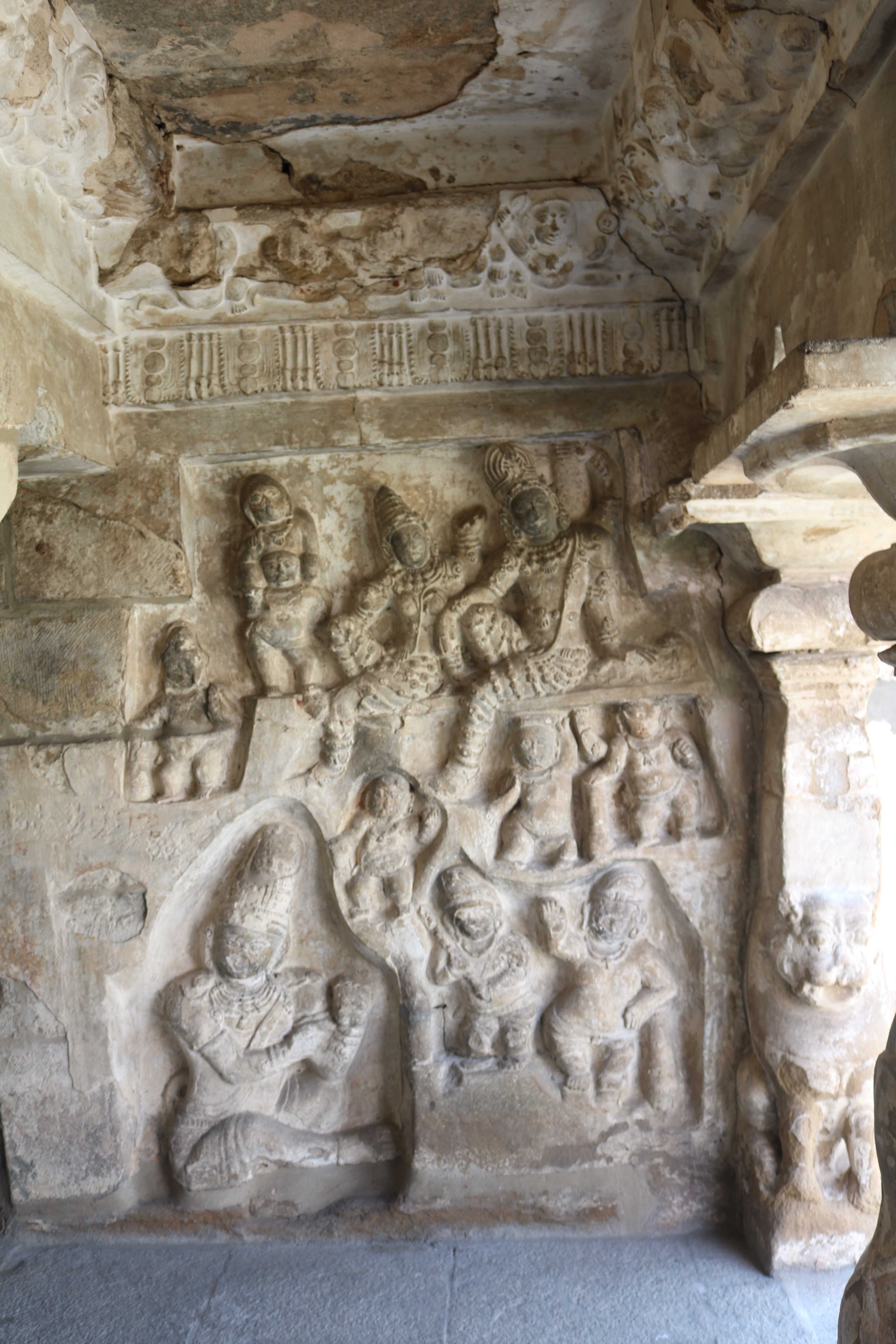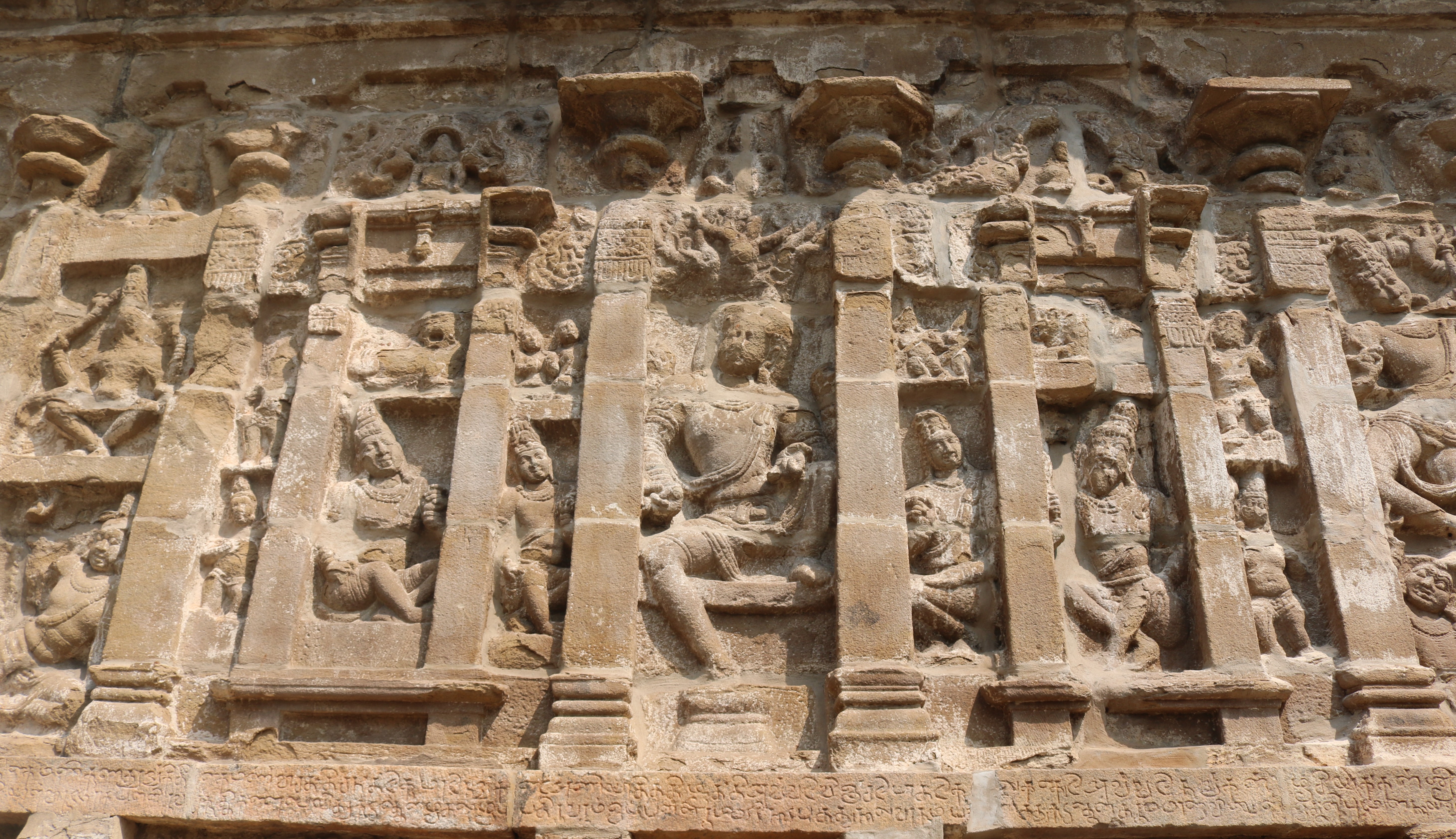 | சிற்பங்கள் | கருவறைக் கோட்டங்களின் வெளிப்புறச் சுவரில் தெற்கில் தென்முகக் கடவுள் (தட்சிணாமூர்த்தி) தனது பரிவாரங்களுடன் உள்ளார். மேற்கில் ஆனையுரித்த பிரான் (கஜசம்ஹாரமூர்த்தி), ஆடல்வல்லான், சண்டேசருக்கு அருள்பாலித்த சண்டேச அனுக்கிரக மூர்த்தி உள்ளார். வடக்கில் காலனை வதைத்த காலாரி (காலாந்த மூர்த்தி), இராவணனுக்கு அருள் செய்த இராவணானுக்கிரக மூர்த்தி, கங்கையை சடையில் தாங்கிய கங்காதர மூர்த்தி உள்ளார். அர்த்த மண்டபக் கோட்டங்களில் தெற்கில் விநாயகர் தனது பரிவாரங்களுடனும், வடக்கில் எருமைத்தலையனை வென்ற தேவி விஷ்ணு துர்க்கை அமைக்கப்பட்டுள்ளனர். |
