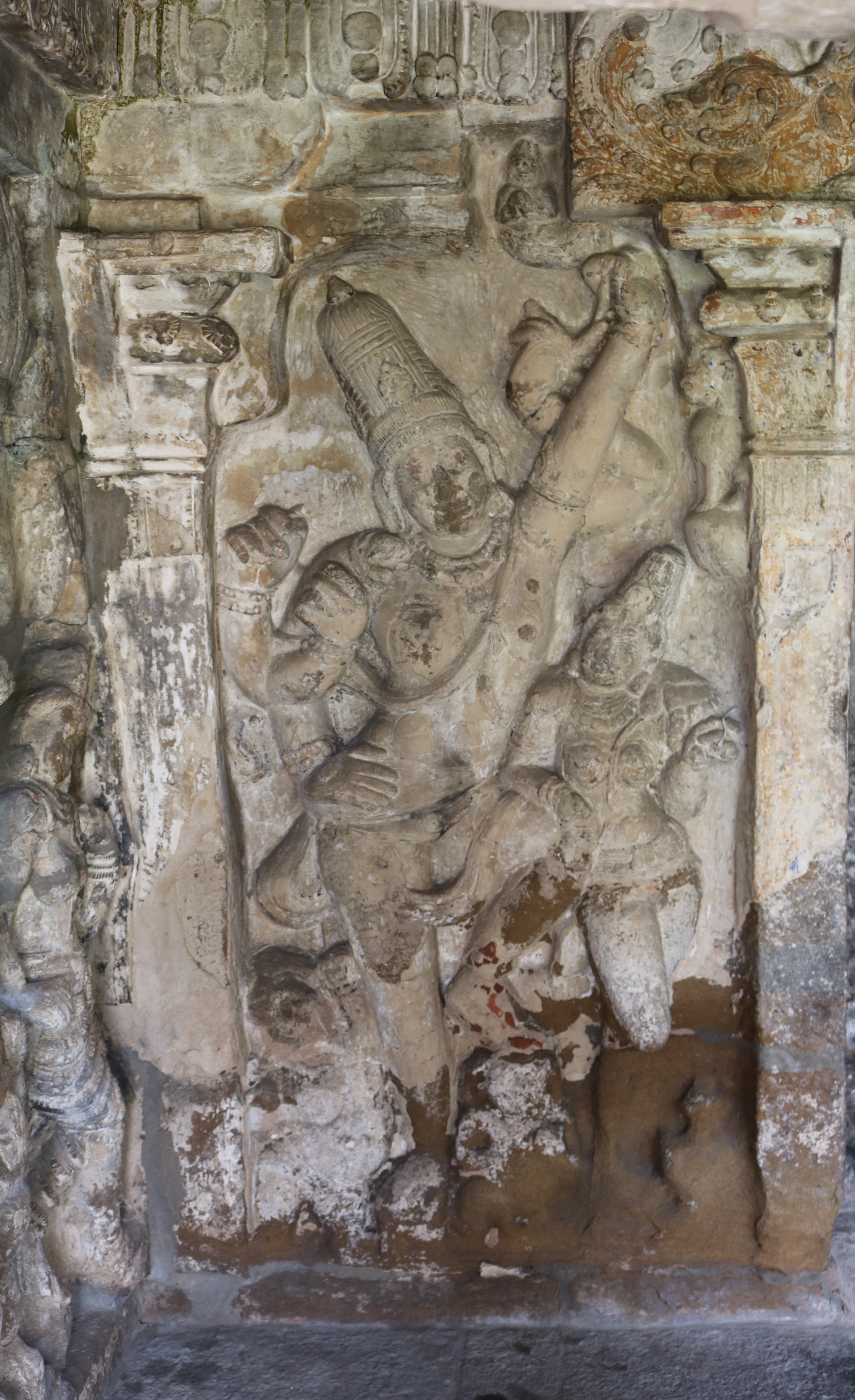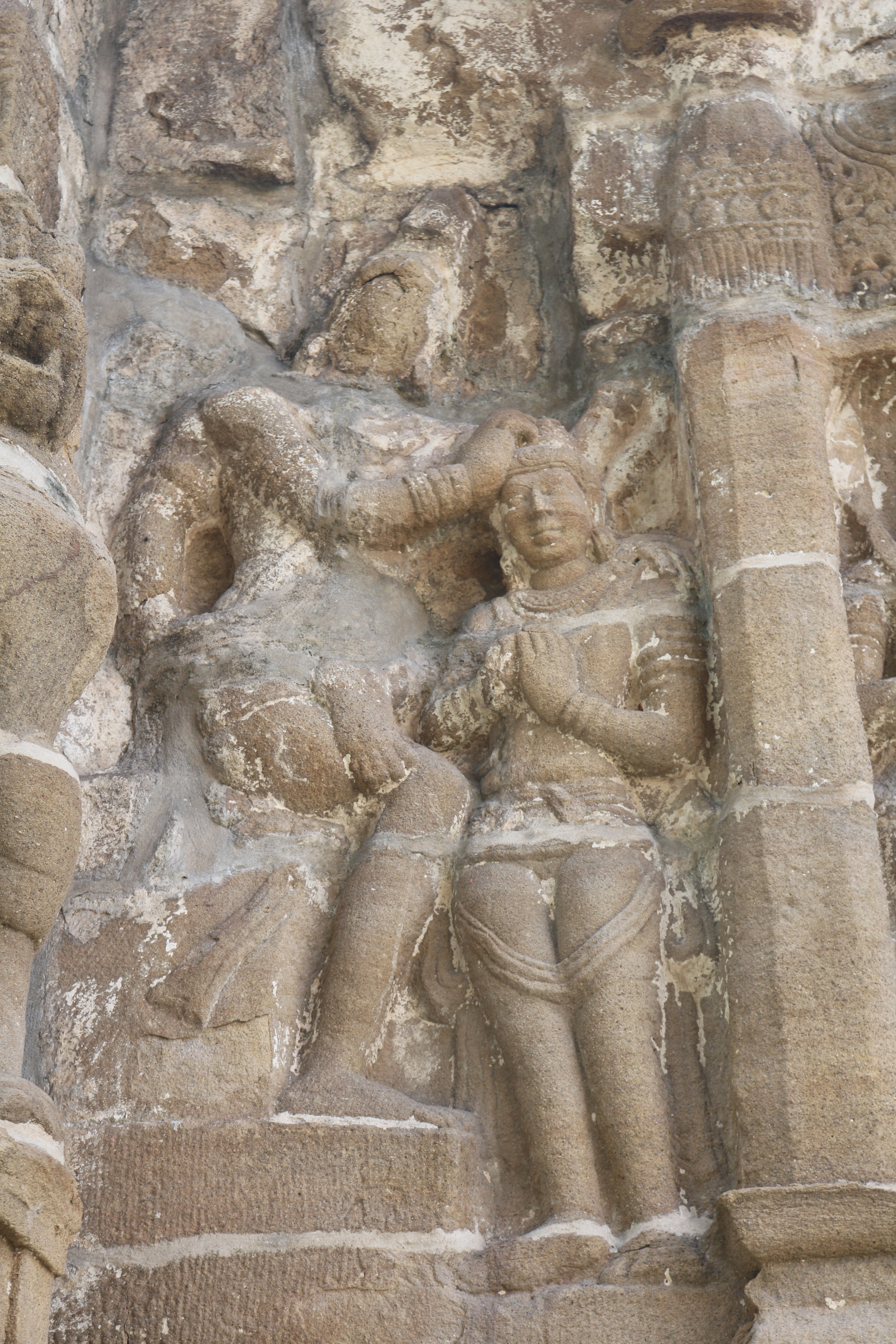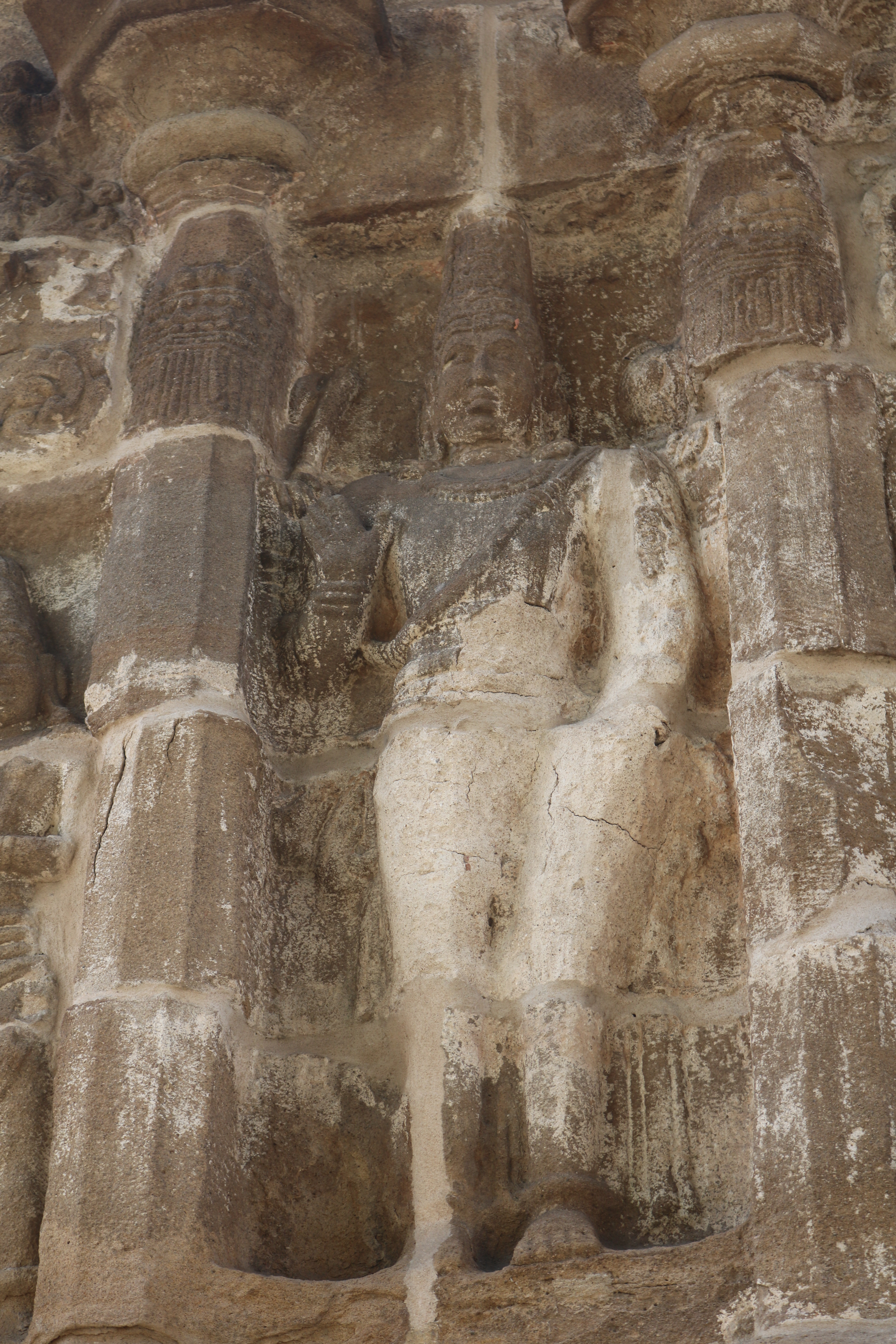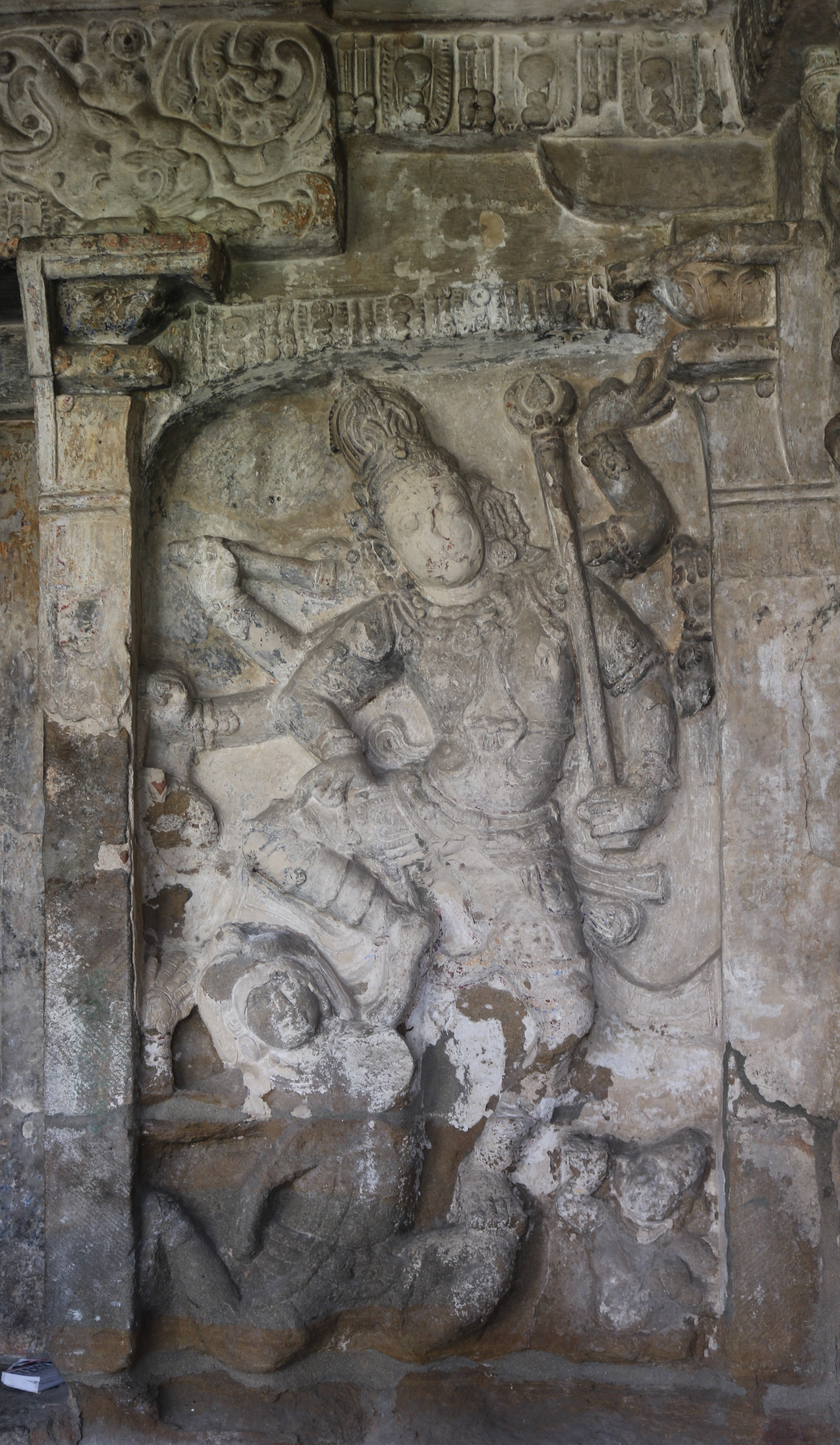 | சிற்பங்கள் | கருவறைக் கோட்டங்களின் வெளிப்புறச் சுவரில் தெற்கில் தென்முகக் கடவுள் (தட்சிணாமூர்த்தி) தனது பரிவாரங்களுடன் உள்ளார். மேற்கில் ஆனையுரித்த பிரான் (கஜசம்ஹாரமூர்த்தி), ஆடல்வல்லான், சண்டேசருக்கு அருள்பாலித்த சண்டேச அனுக்கிரக மூர்த்தி உள்ளார். வடக்கில் காலனை வதைத்த காலாரி (காலாந்த மூர்த்தி), இராவணனுக்கு அருள் செய்த இராவணானுக்கிரக மூர்த்தி, கங்கையை சடையில் தாங்கிய கங்காதர மூர்த்தி உள்ளார். அர்த்த மண்டபக் கோட்டங்களில் தெற்கில் விநாயகர் தனது பரிவாரங்களுடனும், வடக்கில் எருமைத்தலையனை வென்ற தேவி விஷ்ணு துர்க்கை அமைக்கப்பட்டுள்ளனர். |
