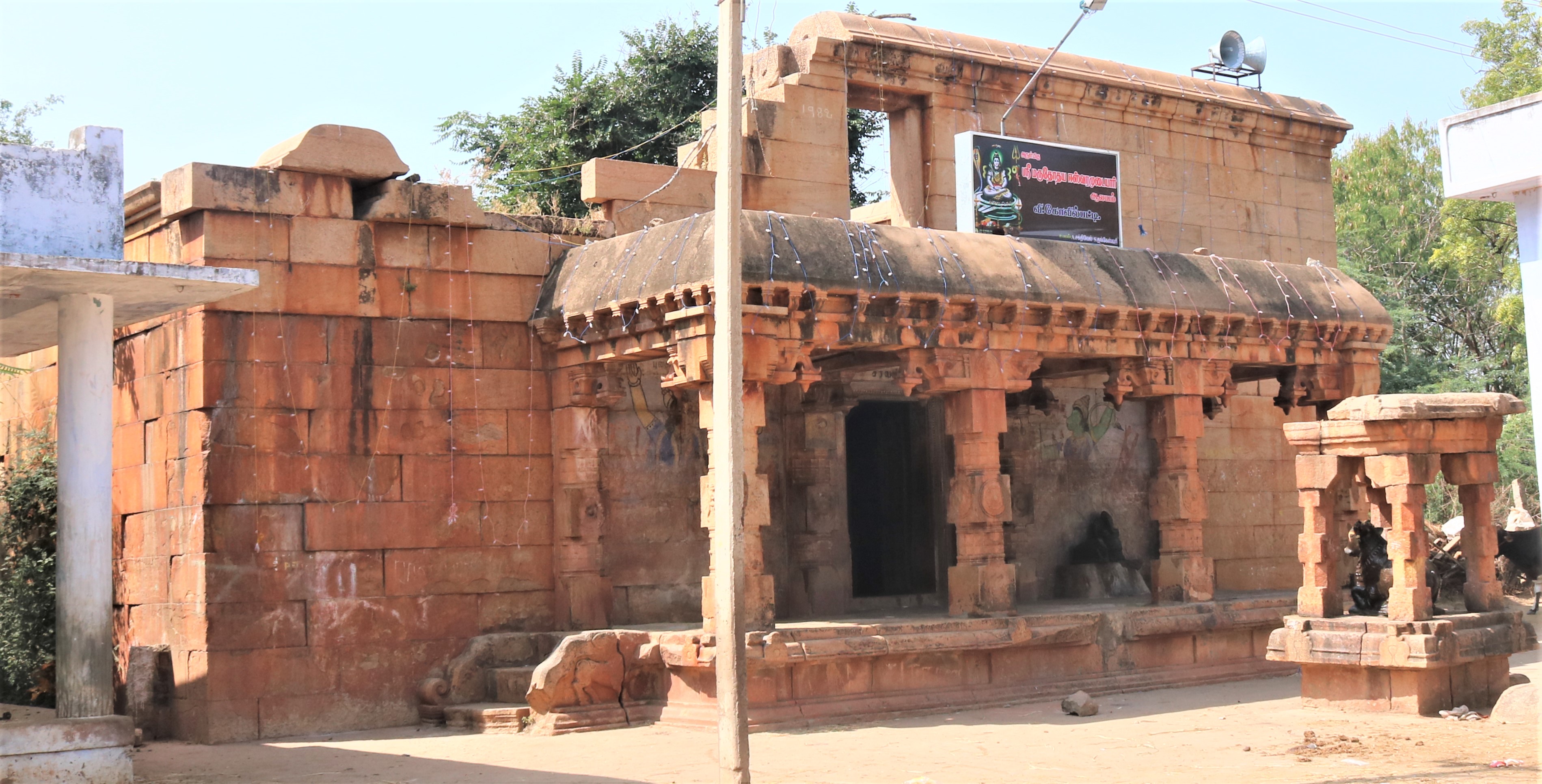 | கோயிலின் அமைப்பு | இக்கோயில் சோழர்காலக் கற்றளி. இங்கு அமைந்துள்ள தூண்களில் உள்ள மாலைத்தொங்கல் பகுதி புடைப்புச் சிற்பங்கள் எழில் வாய்ந்தவை. மேலும் நாசிகைகளில் அமைந்துள்ள கூடுமுகங்களில் காட்டப்பட்டுள்ள இறைத் திருவுருவங்கள் சிற்றுருவங்களாக அழகுற வடிக்கப்பட்டுள்ளன. இக்கோயில் முகப்பு மண்டபத்தைக் கொண்டதாக விளங்குகின்றது. அதனைக் கடந்து உள்ளே சென்றால் மகாமண்டபம் தூண்களுடன் காணப்படுகின்றது. தூண்களின் சதுரப்பகுதிகளில் தாமரைப் பதக்கங்கள், இறையுருவங்கள் அமைந்துள்ளன. இத்தூண்கள் முற்காலச் சோழர்களின் கலைப்படைப்பாக விளங்குகின்றது. தூண்களின் மேற்பகுதி உறுப்புகளான பலகை, பத்மம் ஆகியன எழிலார்ந்தவை. திருச்சுற்று மாளிகையில் தூண்கள் வரிசையாகக் காட்டப்பட்டுள்ளன. மாளிகையின் சுவர்ப்பகுதியில் கல்வெட்டுகள் காணப்படுகின்றன. தாங்குதளத்தைத் தொடர்ந்து அமைந்துள்ள சுவர்ப்பகுதியில் காணப்படும் கும்பப்பஞ்சரம் நுணுக்கமான கலை வேலைப்பாடுடையவை. இக்கோயிலின் கருவறை சதுர வடிவத்தில் அமைந்துள்ளது. கருவறையில் இலிங்க வடிவில் இறைவன் காட்சியளிக்கிறார். வாயிலின் இருபுறமும் துவாரபாலகராய் பாண்டி வீரனும் மீனாட்சியும் ஓவியமாய் நிற்கின்றனர். |