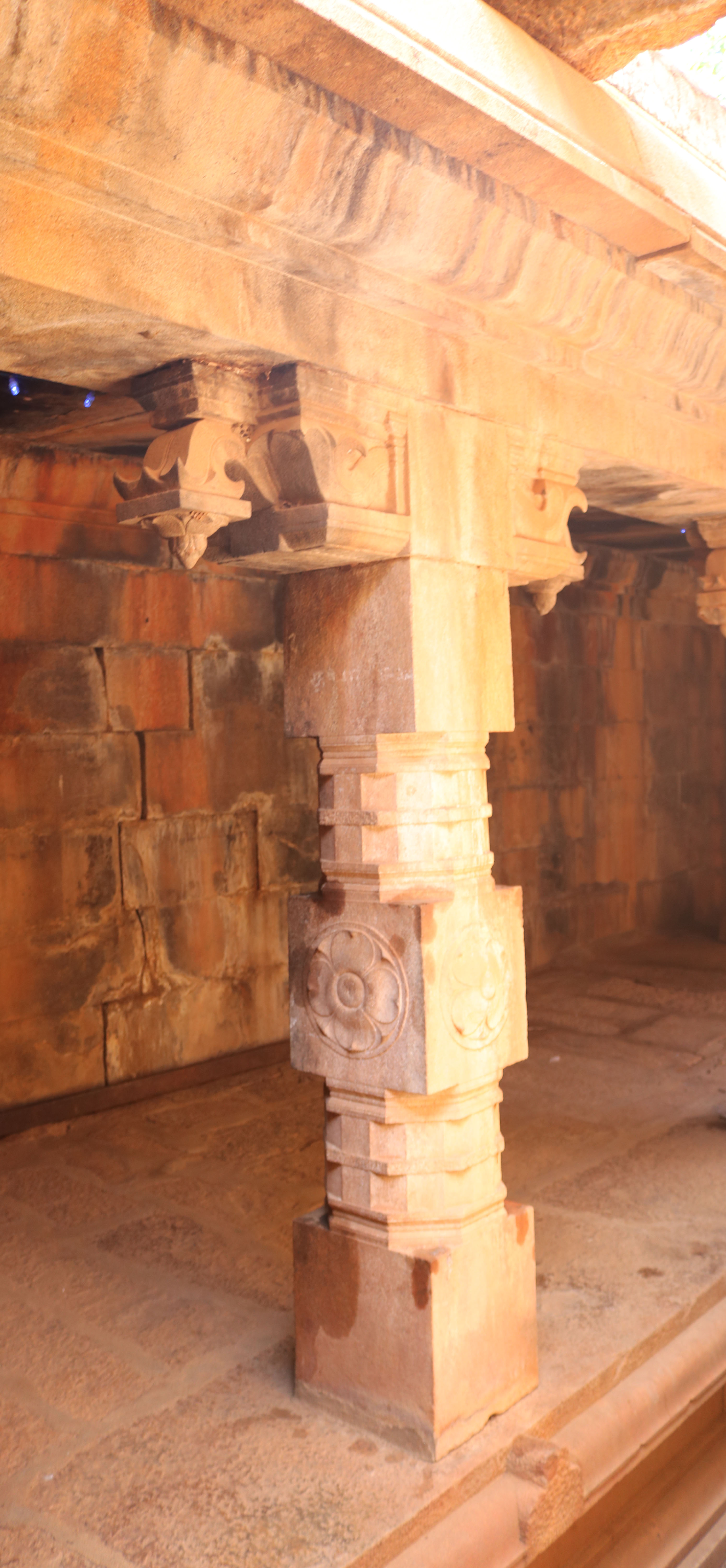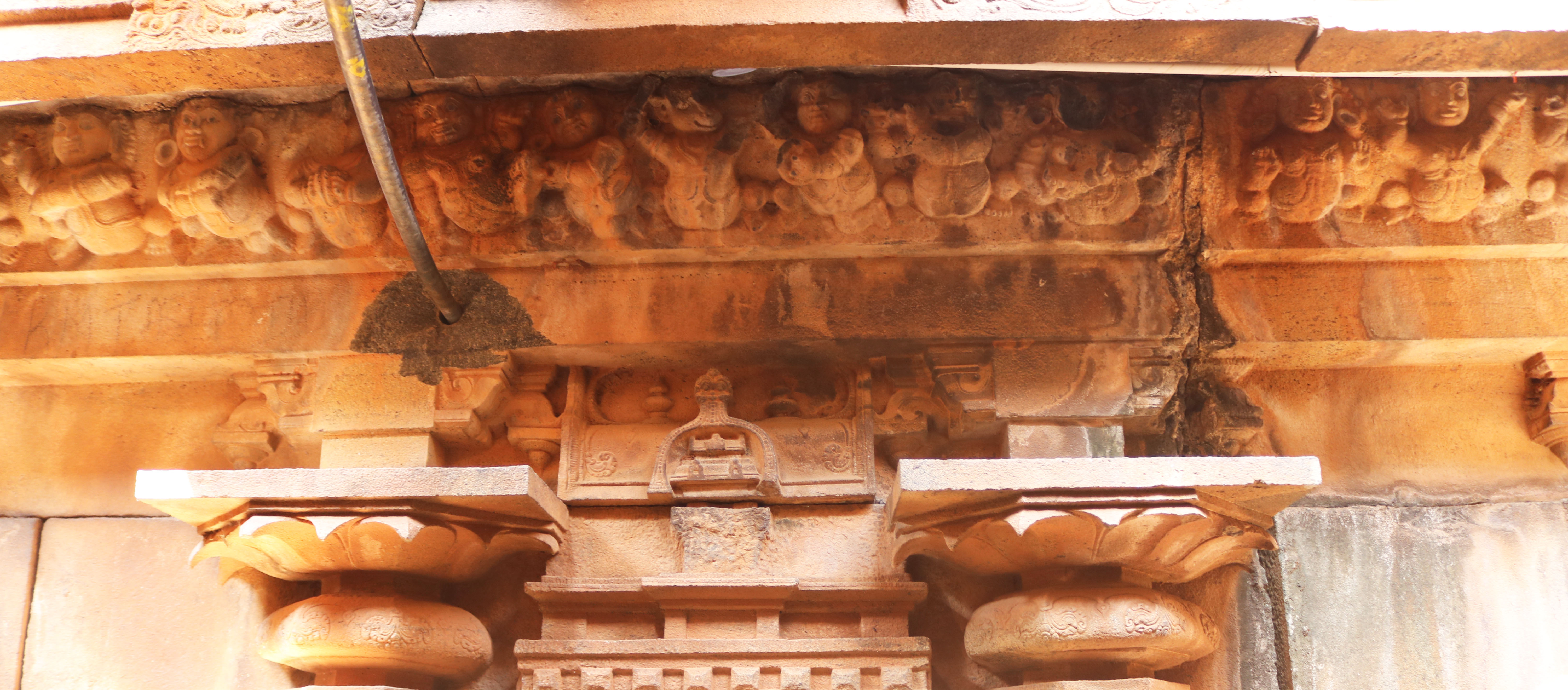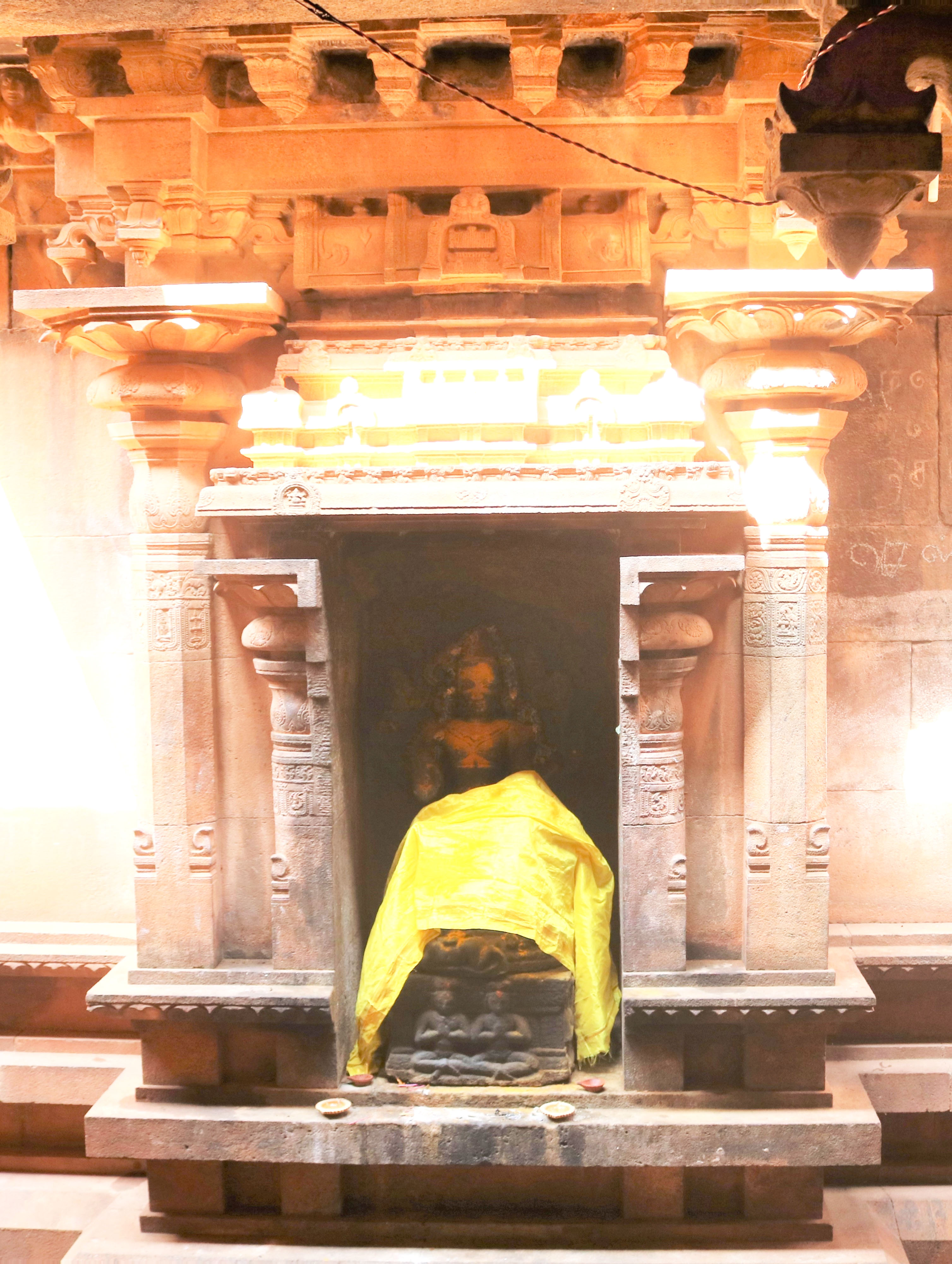 | சிற்பங்கள் | கருவறையில் இலிங்க வடிவில் இறைவன் காட்சியளிக்கிறார். இக்கோயிலில் கருவறை விமானத்தின் தேவகோட்டங்களில் தென்முகக்கடவுள், கணபதி, இலிங்கோத்பவர், துர்க்கை ஆகிய சிற்பங்கள் காணப்படுகின்றன. தூண்களின மாலாஸ்தானம் எனப்படும் மாலைத் தொங்கல் பகுதிகளில் வெகு கலை நேர்த்தியான புடைப்புச் சிற்பங்கள் அமைக்கப்பட்டுள்ளன. கண்ணப்பர், புருஷாமிருகம், பெருமாள், முனிவர்கள், திருவிளக்குகள், ஆடல் மகளிர் ஆகிய சிறிய வடிவ சிற்பங்கள் வடிக்கப்பட்டுள்ளன. கூரைப்பகுதியில் காணப்படும் நாசிக்கூடுகளில் ஆடல்வல்லான், கஜசம்ஹாரமூர்த்தி, பிட்சாடனர், கணபதி, ஆடல் மகள், முருகன், நரசிம்மர், வீணாதரர் ஆகிய திருவுருவங்கள் புடைப்புச் சிற்பங்களாக அமைந்துள்ளன. மேலும் கொடுங்கைப் பகுதியின் கீழே வரிசையாக பூதகண வரிசைகள் காட்டப்பட்டுள்ளன. பூதகணங்கள் ஆடல் பாடலோடு, இசைக்கருவிகளை முழக்கியும், ஆனந்தத்தில் களித்துள்ளன. தேவகோட்டங்களின் மேல் பகுதியில் காட்டப்பட்டுள்ள விமானம் அமைப்பில் இருபுறமும் விமானந்தாங்கிகள் அமர்ந்த நிலையில் உள்ளனர். |