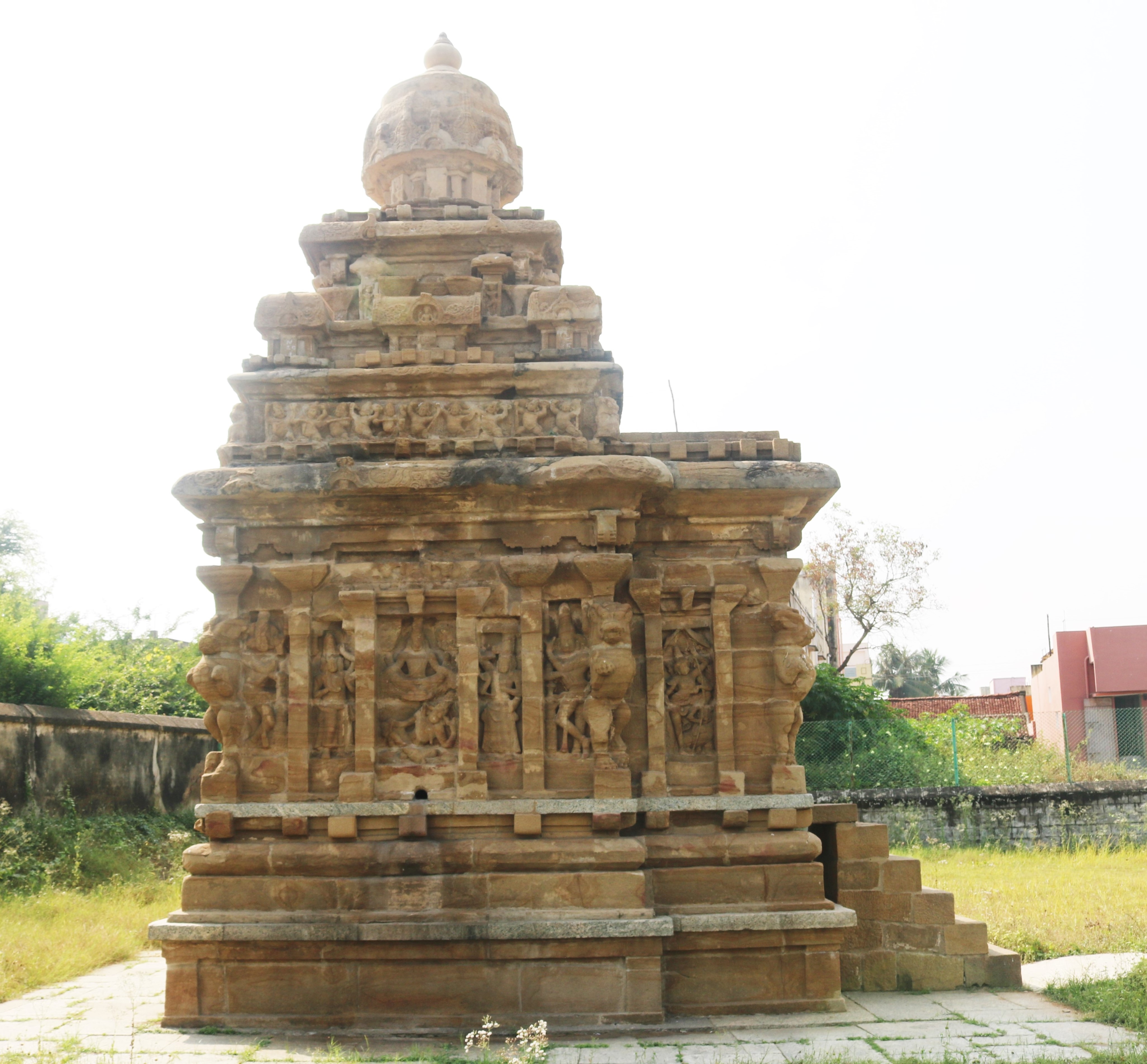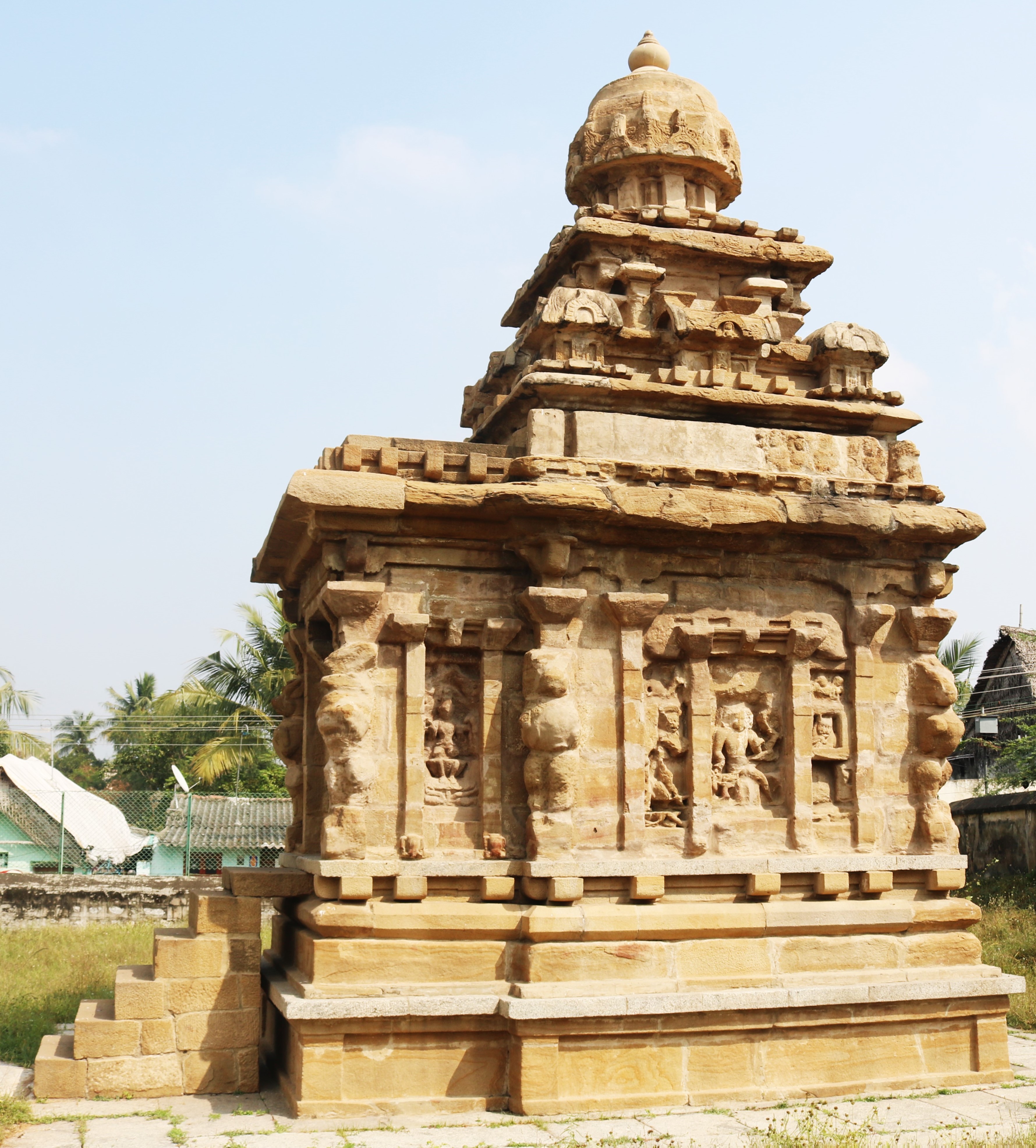 | கோயிலின் அமைப்பு | மேற்கு நோக்கிய வாயிலைக் கொண்டுள்ளது. இரு தளங்களைக் கொண்டது. வேசர பாணியில் அதாவது சிகரம் வட்ட வடிவில் அமையப் பெற்ற கலைப்பாணியைப் பெற்றுள்ளது. கருவறை வெளிப்புறச் சுவர்களில் புடைப்புச் சிற்பங்கள் காணப்படுகின்றன. தள உறுப்புகளாக கர்ணக்கூடு, சாலை ஆகியன இடம் பெற்றுள்ளன. சிறிய எளிய கற்றளியாக விளங்குகிறது. கிழக்குப்புறத்தில் சிற்பங்கள் சிதைவுற்றுள்ளன. |