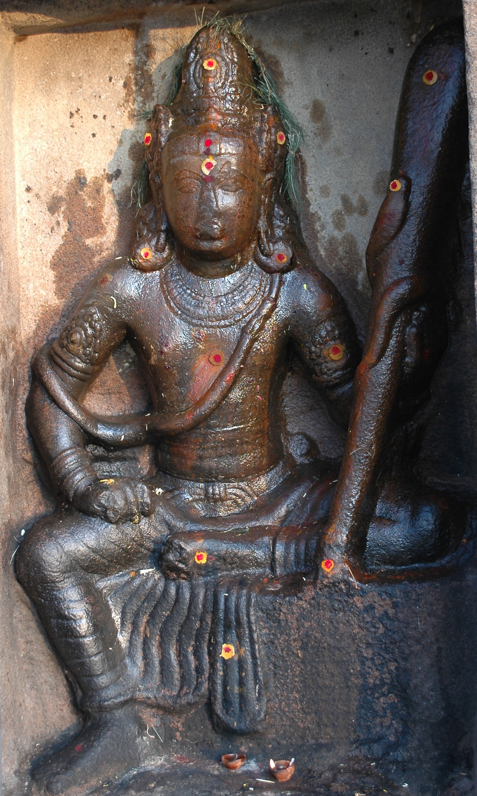 | சிற்பங்கள் | கருவறையில் தாய்ப்பாறையில் இலிங்கவடிவில் இறைவன் உள்ளார். முகமண்டபத்தில் துவாரபாலகர் சிற்பங்கள் உள்ளன. முகமண்டபத்தின் நுழைவு வாயிலின் இருபுறமும் உள்ள கோட்டங்களில் இலகுலீசரும், கணபதியும் உள்ளனர். வெளிப்புறத்தில் நந்தி அமைந்துள்ளது. |