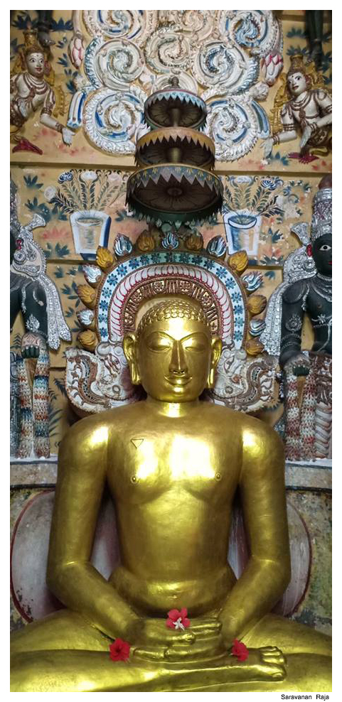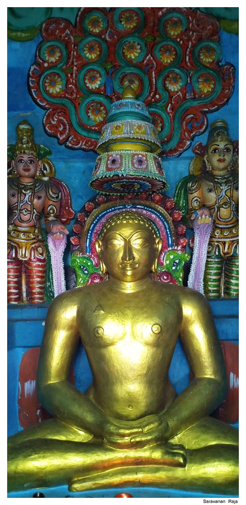 | சிற்பங்கள் | கோயிலின் மூலவர் 17- வது தீர்த்தங்கரரான பகவான் குந்துநாதர் சுதை வடிவில் காட்சி தருகிறார். கருவறையின் பின்புறம் புடைப்புச் சிற்பமாக பகவான் பார்சுவநாதர் மேற்கு திசை நோக்கி திருநறுங்கொண்டையெனும் இடத்தில் இருப்பதுபோல் இருப்பதால் மேற்றிசைப் பெருமாள் என்று அழைக்கப்படுகிறார். சோழர்காலக் கல்வெட்டும் இப்பெயரையே சுட்டுகிறது. இத்தலத்தில் பாகுபலி, சிலையாக மிகக் கலை நயத்தோடு, நேர்த்தியோடு காட்சித் தருகிறார். உயரமான கருவறையில் சுதை வடிவிலுள்ள மகாவீரர் திருக்காட்டாம்பள்ளி ஆழ்வார் எனப்படுகிறார். பார்சுவநாதர் முன் சீதளன் புடைப்பு சிற்பமும் கருவறை எதிரே சுவற்றில் காணப்படுகிறார். |