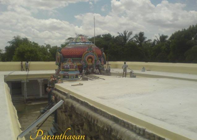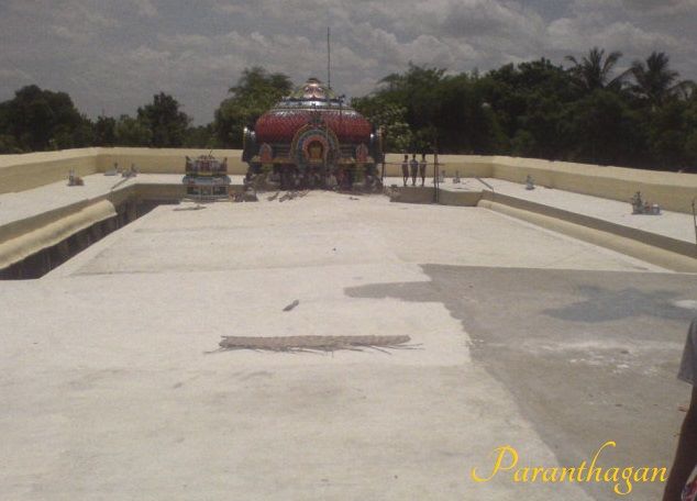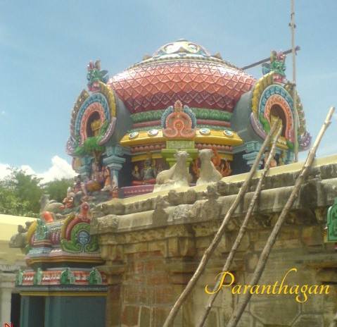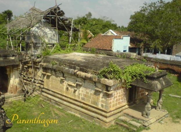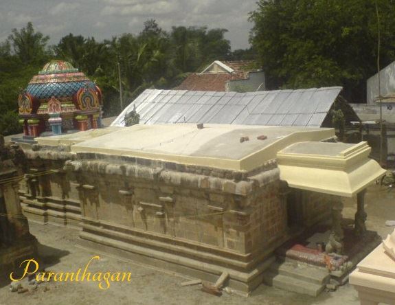 கோயிலின் அமைப்பு | முதலாம் பராந்தகன் காலத்தில் இக்கோயில் முழுவதும் கற்றளியாக வடிவமைக்கப்பட்டிருந்தது. கருவறை, அர்த்தமண்டபம், முக மண்டபம் ஆகியவற்றுடன் கூடிய கட்டுமானங்களைப் பெற்று அமைந்துள்ளது. வெளிப்புறக் கோட்டங்களில் முன்னிழுக்கப்பட்ட நிஷ்காந்த பஞ்சரக் கோட்டங்களைப் பெற்றுள்ளது. இவ்வமைப்பு பராந்தகனின் கலைப்பாணியாக புள்ளமங்கையில் காணப்படுவது இங்கு கருதத்தக்கது. தற்போது கருவறை விமானத்தின் தளப்பகுதி புனரமைக்கப்பட்டுள்ளதால் பராந்தகன் காலத்திய தளங்களின் எண்ணிக்கையை அறியக் கூடவில்லை. விமான தாங்குதளத்தில் கல்வெட்டுகள் காணப்படுகின்றன. சுவர்ப் பகுதியில் அரைத்தூண்களுக்கிடையில் கோட்டங்கள் அமைக்கப்பட்டுள்ளன. கூரைப்பகுதியில் கொடுங்கைக்குக் கீழே பூதவரிகள் செல்கின்றன. முன் மண்டப வெளிப்புறக் கோட்டங்கள் சிற்பங்களற்ற அரைத்தூண்களோடு அமைந்துள்ளன. |