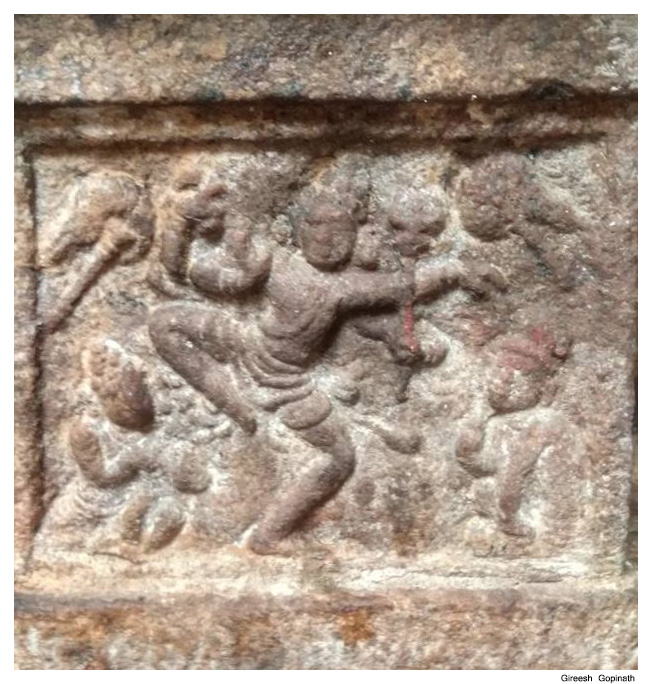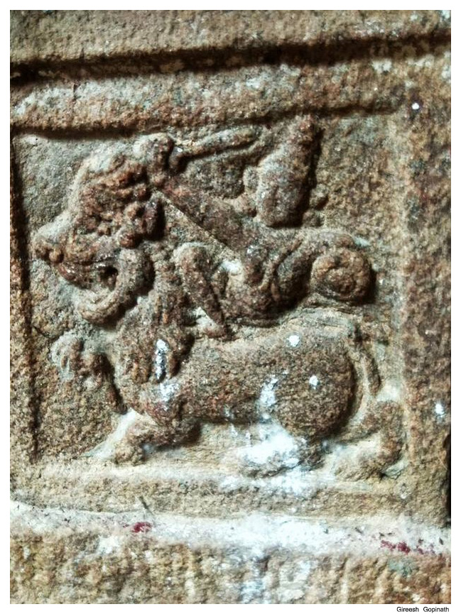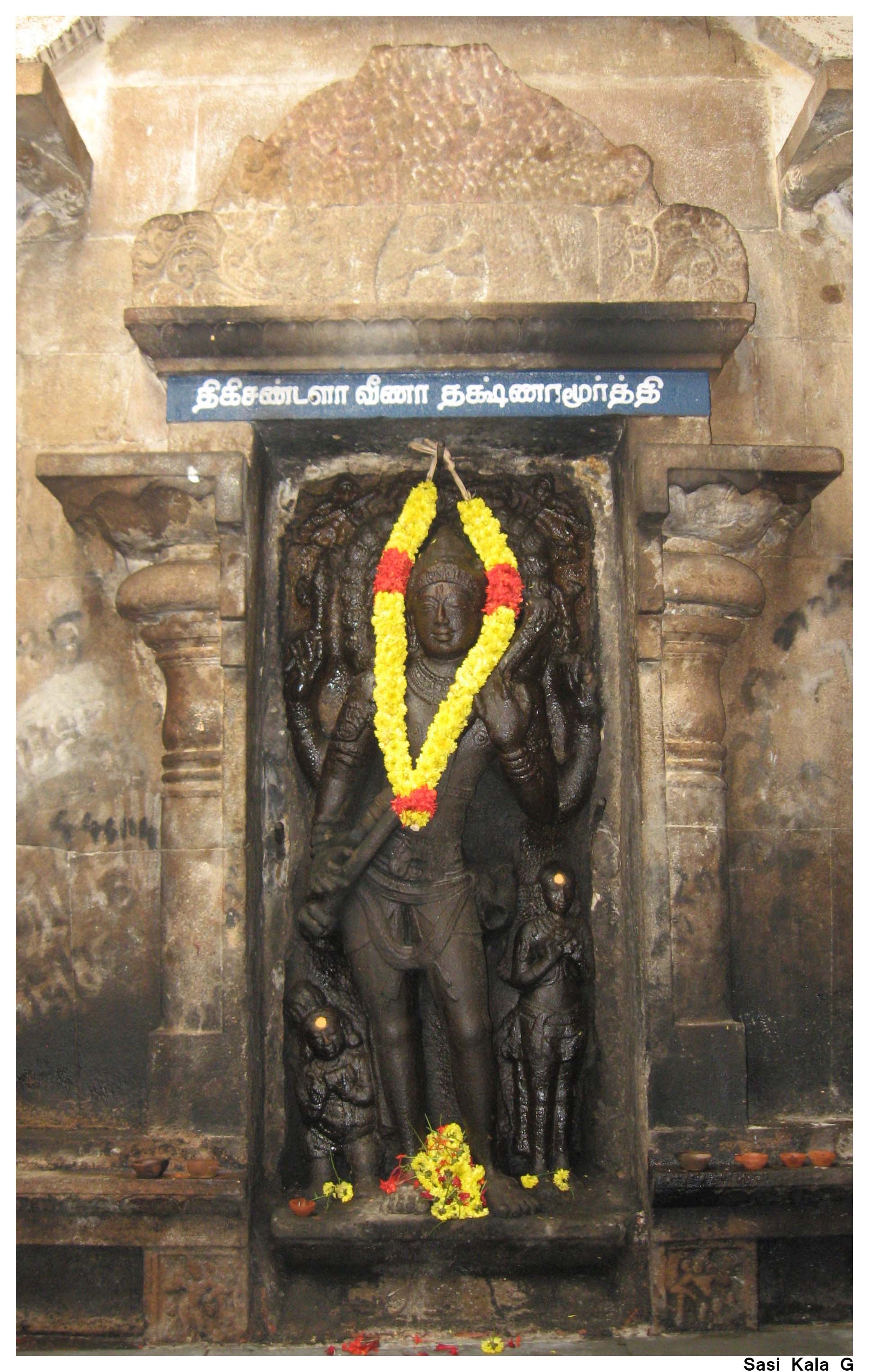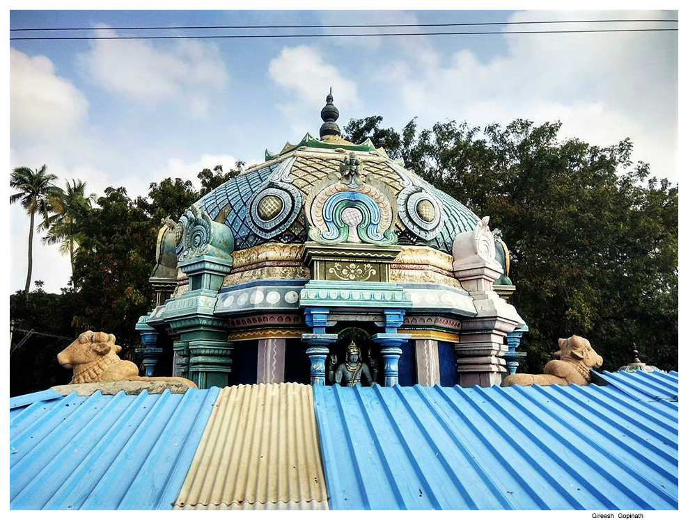 | சிற்பங்கள் | கருவறை வாயிலின் இருபுறத்திலும் சுமார் எட்டு அடி உயரத்தில் துவாரபாலகர் சிற்பங்கள் அமைந்துள்ளன. கிழக்கு நோக்கிய கருவறையில் விஷமங்களேஸ்வரர் லிங்க உருவில் காட்சியளிக்கிறார். மகாமண்டபத்தில் தெற்கு நோக்கி மங்களநாயகியின் திருமுன் அமைந்துள்ளது. கோயிலின் நுழைவில் இடதுபுறம் ஸ்ரீதேவி-பூதேவி சமேதராக அமர்ந்த நிலையில், நான்கு கரங்களுடன், பின் வலதுகரத்தில் பிரயோகச் சக்கரத்துடன் திருமால் காட்சி தருகிறார். கருவறையின் தென்புற தேவகோட்டத்தில் வீணையை ஏந்தி, நின்ற கோலத்தில் வீணாதரர் காட்சியளிக்கிறார். இவர் "திகசண்டளா வீணா தட்சிணாமூர்த்தி" ஆவார். கருவறையின் மேற்குப்புற தேவகோட்டத்தில் உமா ஆலிங்கன மூர்த்தி, தொடர்ந்து மேற்கே, தனித் திருமுன்னில் லட்சுமி நாராயணர், கருவறை விமானத்தின் வடபுற தேவகோட்டத்தில் நான்முகன், கலைமகள், அர்த்தமண்டப வடக்கு வெளிப்புற கோட்டத்தில் துர்க்கை, தென்புற கோட்டத்தில் கணபதி ஆகிய சிற்பங்கள் காணப்படுகின்றன. மேலும் தாங்குதளத்தின் கண்டபாதத்தில் புடைப்புச் சிற்பங்கள் குறுஞ்சிற்பங்களாக அமைக்கப்பட்டுள்ளன. இவற்றுள் யானையின் மகப்பேறுக் காட்சி, ஆனையுரித்த தேவர், நரசிம்மர், ஆடல்வல்லான், ஆடல் மகளிர், திருமால் போன்ற சிற்பக் காட்சிகள் புடைப்பிக்கப்பட்டுள்ளன. |