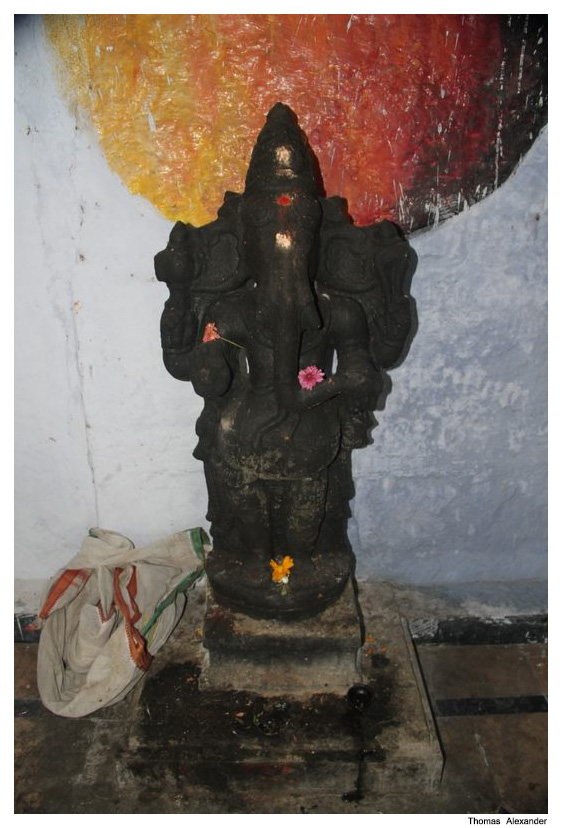 | சிற்பங்கள் | கருவறை வாயிலுக்கு இடதுபுறம் வரிசையாக அமர்நிலையில் மூன்று கணபதியை சிற்பங்கள் காணப்படுகின்றன. அடுத்து நின்றநிலையில் விநாயகர் திருவுரு, வாயிலுக்கு வலப்புறம் முருகனின் ஒரு கோலமான பிரம்ம சாத்தன், அவரையடுத்து வள்ளி தெய்வயானையுடன் கூடிய அழகிய ஆறுமுகப் பெருமான் ஆகியோர் திருக்கோலங்கொண்டுள்ளனர். கருவறைக்கு வெளியே காவல்புரியும் துவார பாலகர்கள் சிற்பங்களையடுத்து, கருவறையில் வட்ட வடிவ ஆவுடையாரோடு இலிங்கம் அமைந்துள்ளது. சிவலிங்கத்தின் பின்னால் கருவறைச் சுவரில் சோமாஸ்கந்தர் கோலம் புடைப்புச் சிற்பமாக அமைந்துள்ளது. இவ்வாறு கருவறையில் அமைப்பது பல்லவர் கலைப்பாணியாகும். வலம்புரி விநாயகர், வீரபத்திரர், பைரவர், பலகையில் புடைப்புச் சிற்பமாக அமைந்துள்ள கணபதி, தவ்வை ஆகிய சோழர்கால கலைப்படைப்புகள் எழில் வாய்ந்தவையாக உள்ளன. |