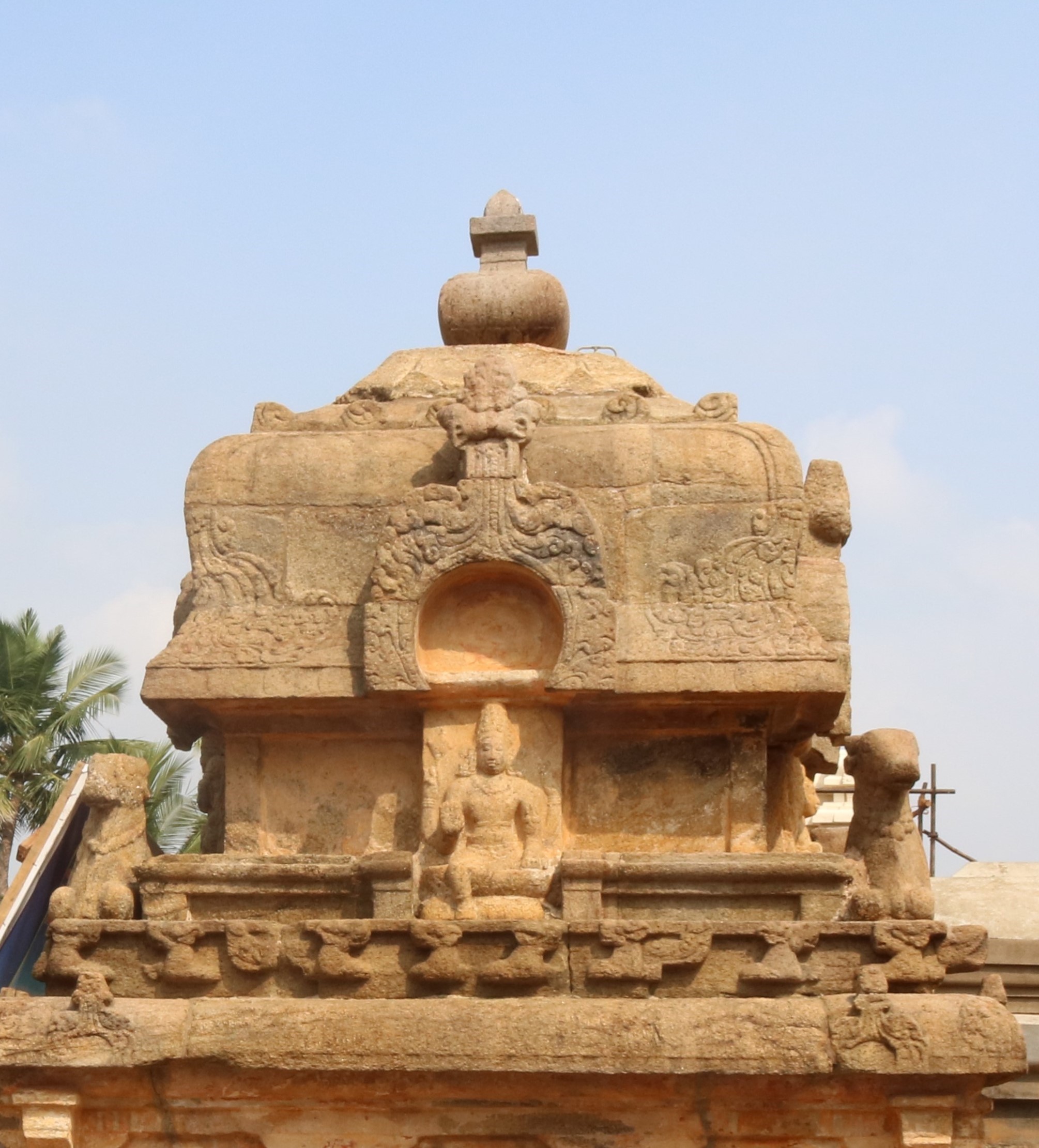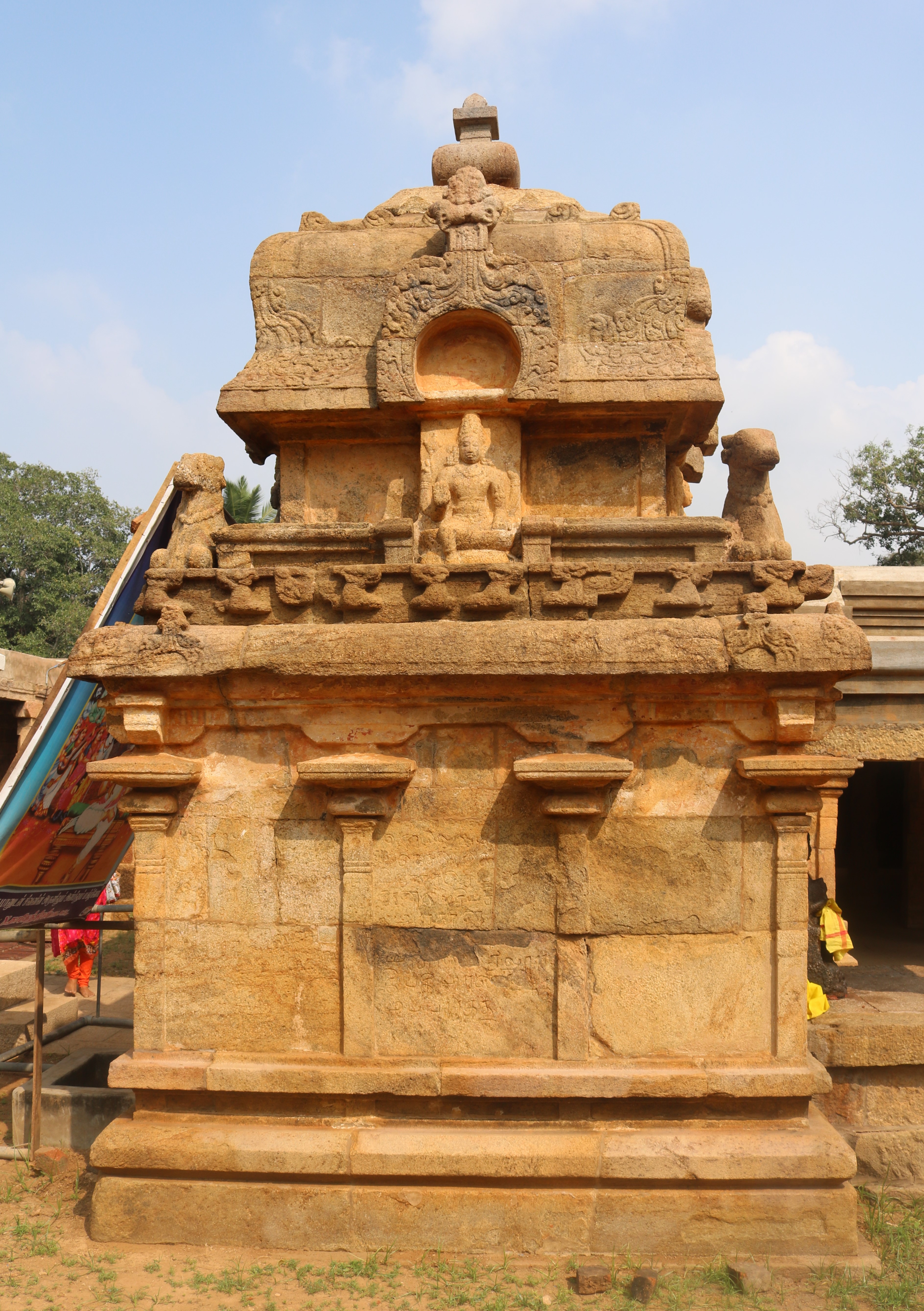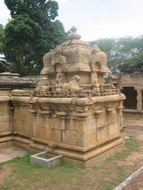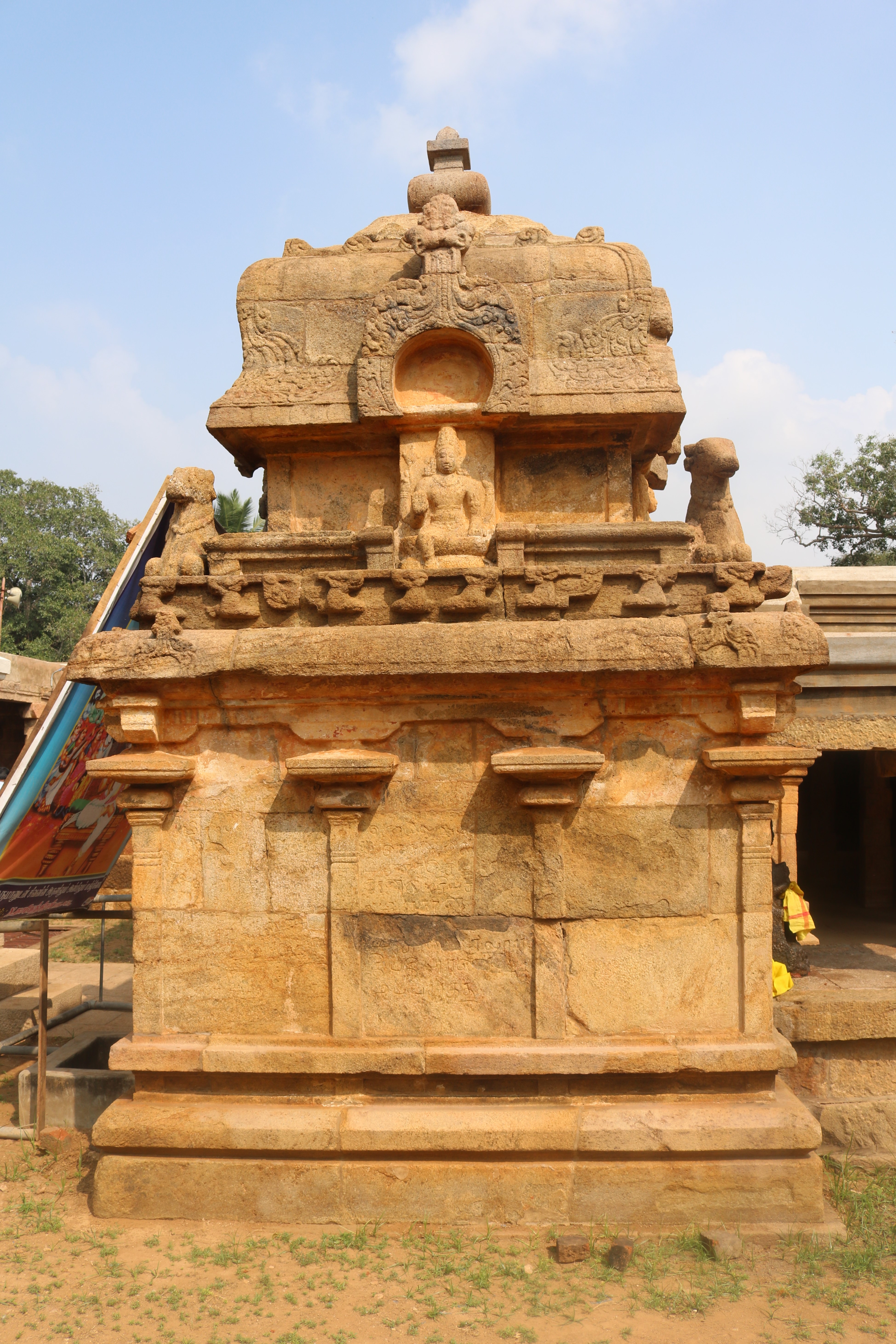 | சிற்பங்கள் | தள உறுப்பான கிரீவப்பகுதியின் (தலை) நடுவே தெற்கே தட்சிணாமூர்த்தி, மேற்கே விஷ்ணு, வடக்கே பிரம்மா, நான்கு மூலைகளிலும் நந்தி, கருவறையில் இலிங்கம் ஆகிய சிற்பங்கள் உள்ளன. |