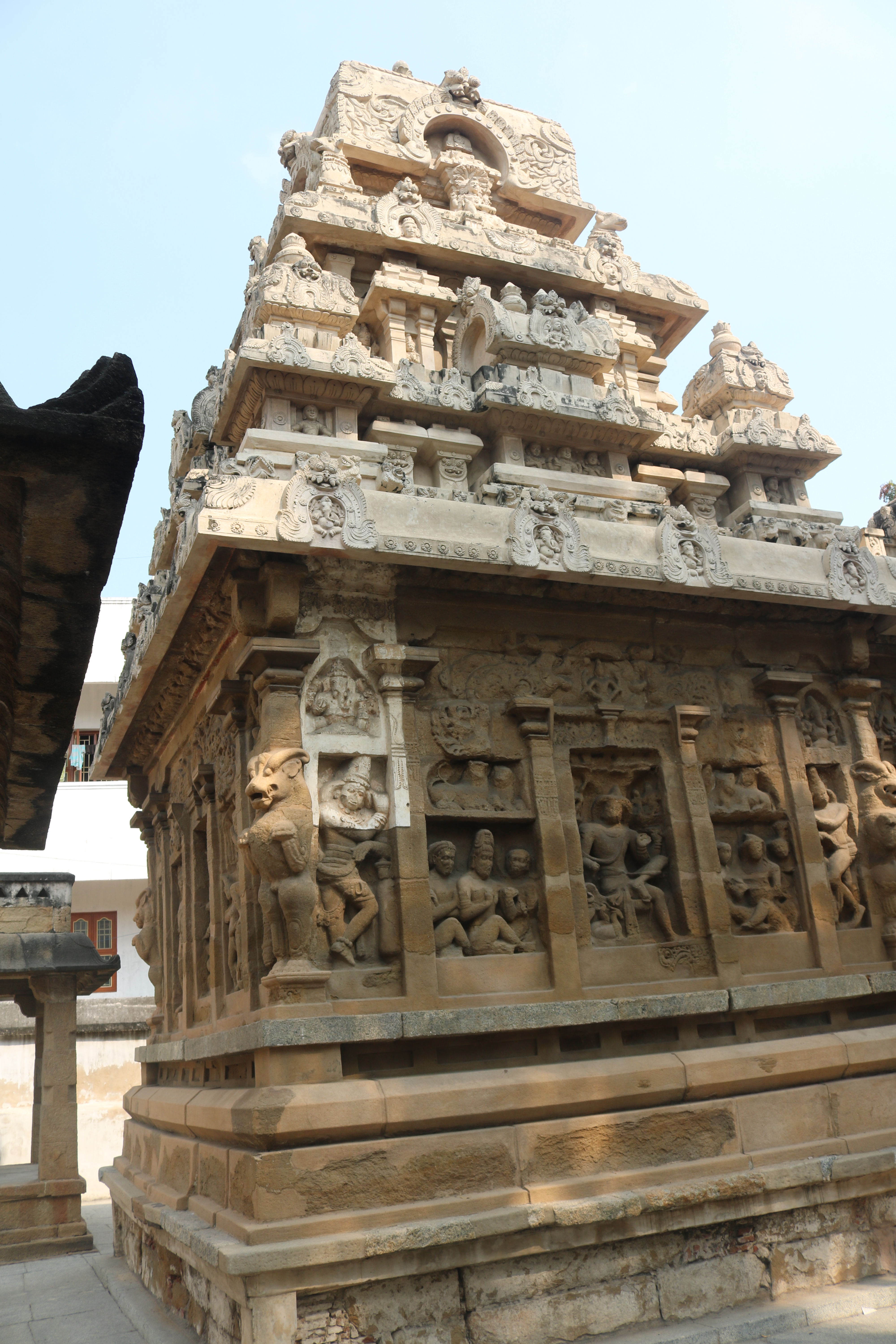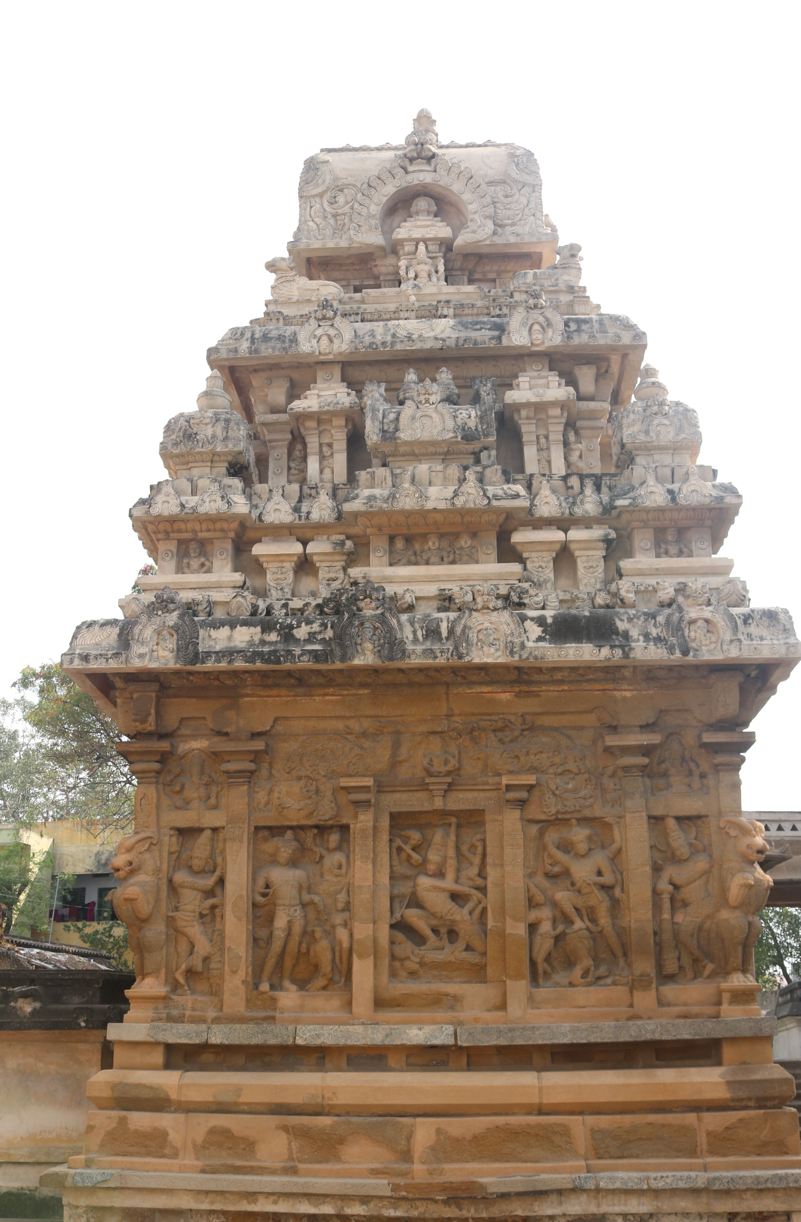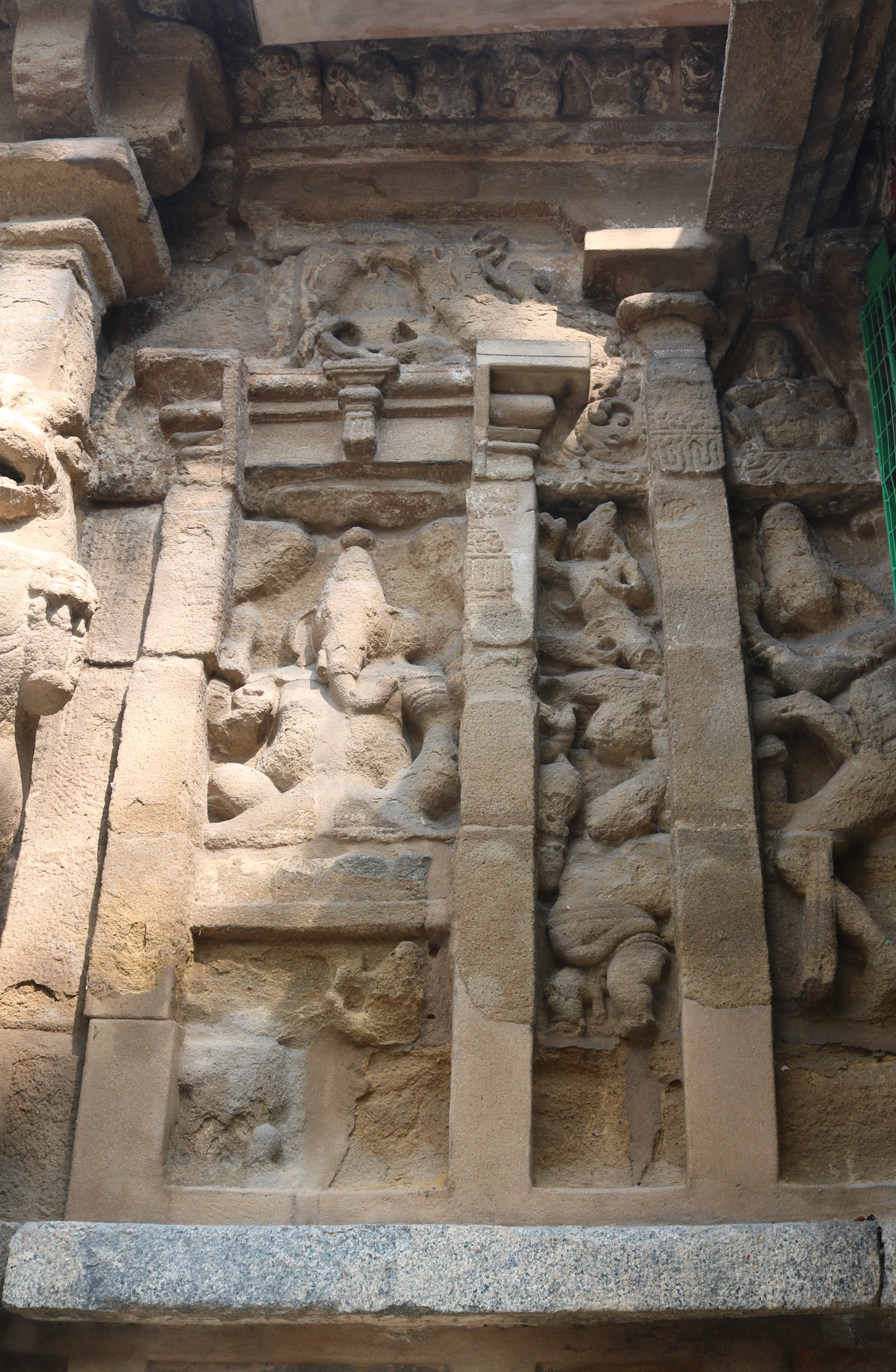 | சிற்பங்கள் | கருவறைக் கோட்டங்களில் தெற்கில் தென்முகக் கடவுள் (தட்சிணாமூர்த்தி) தனது பரிவாரங்களுடன் உள்ளார். மேற்கில் ஆனையுரித்த பிரான் (கஜசம்ஹாரமூர்த்தி), ஆடல்வல்லான், சண்டேசருக்கு அருள்பாலித்த சண்டேச அனுக்கிரக மூர்த்தி வடக்கில் காலனை வதைத்த காலாரி (காலாந்த மூர்த்தி), இராவணனுக்கு அனுக்கிரகம் செய்த இராவணானுக்கிரக மூர்த்தி, கங்கையை சடையில் தாங்கிய கங்காதர மூர்த்தி அர்த்த மண்டபக் கோட்டங்களில் தெற்கில் விநாயகர் தனது பரிவாரங்களுடனும், வடக்கில் எருமைத்தலையனை வென்ற தேவி விஷ்ணு துர்க்கை அமைக்கப்பட்டுள்ளனர். |