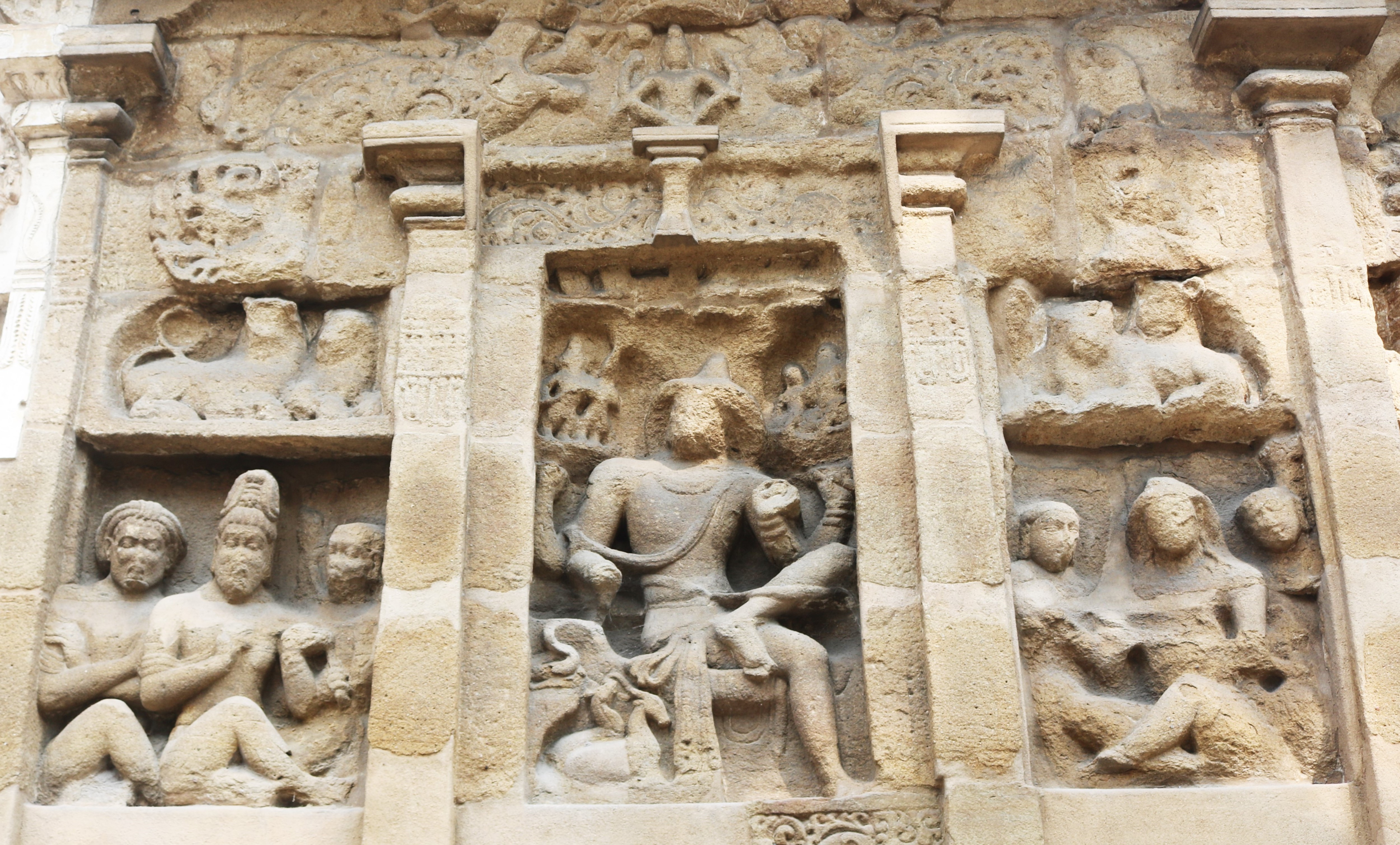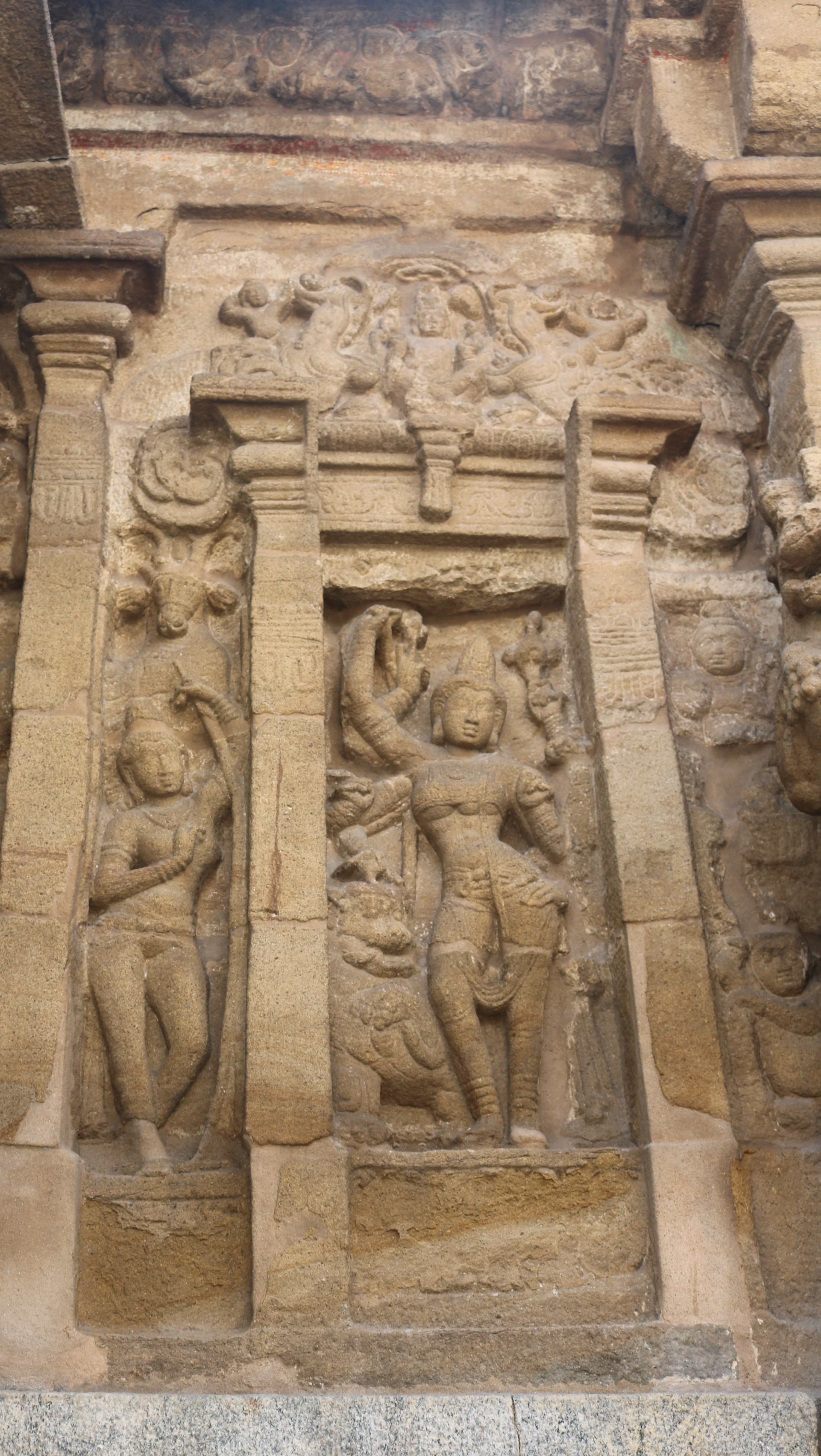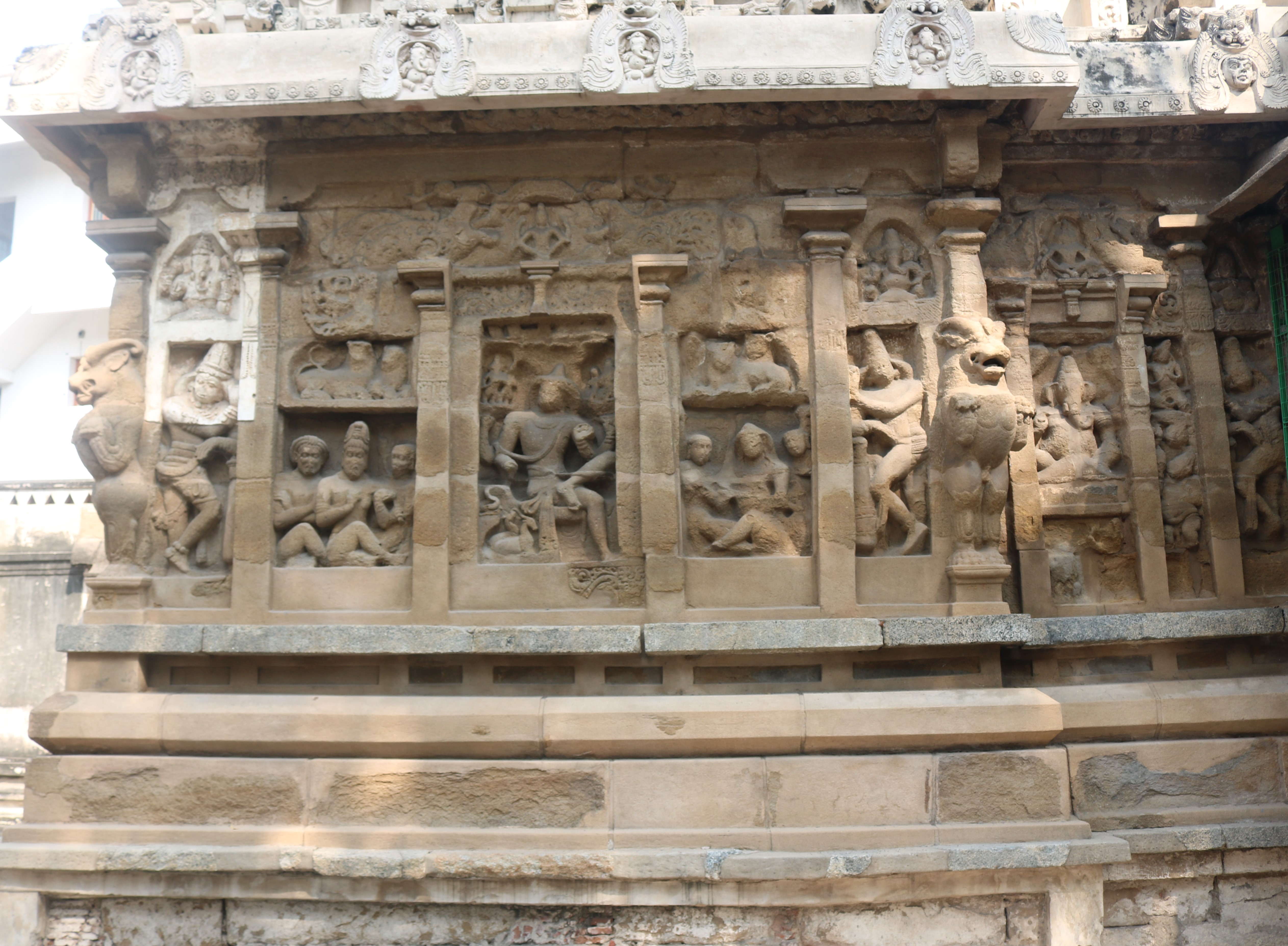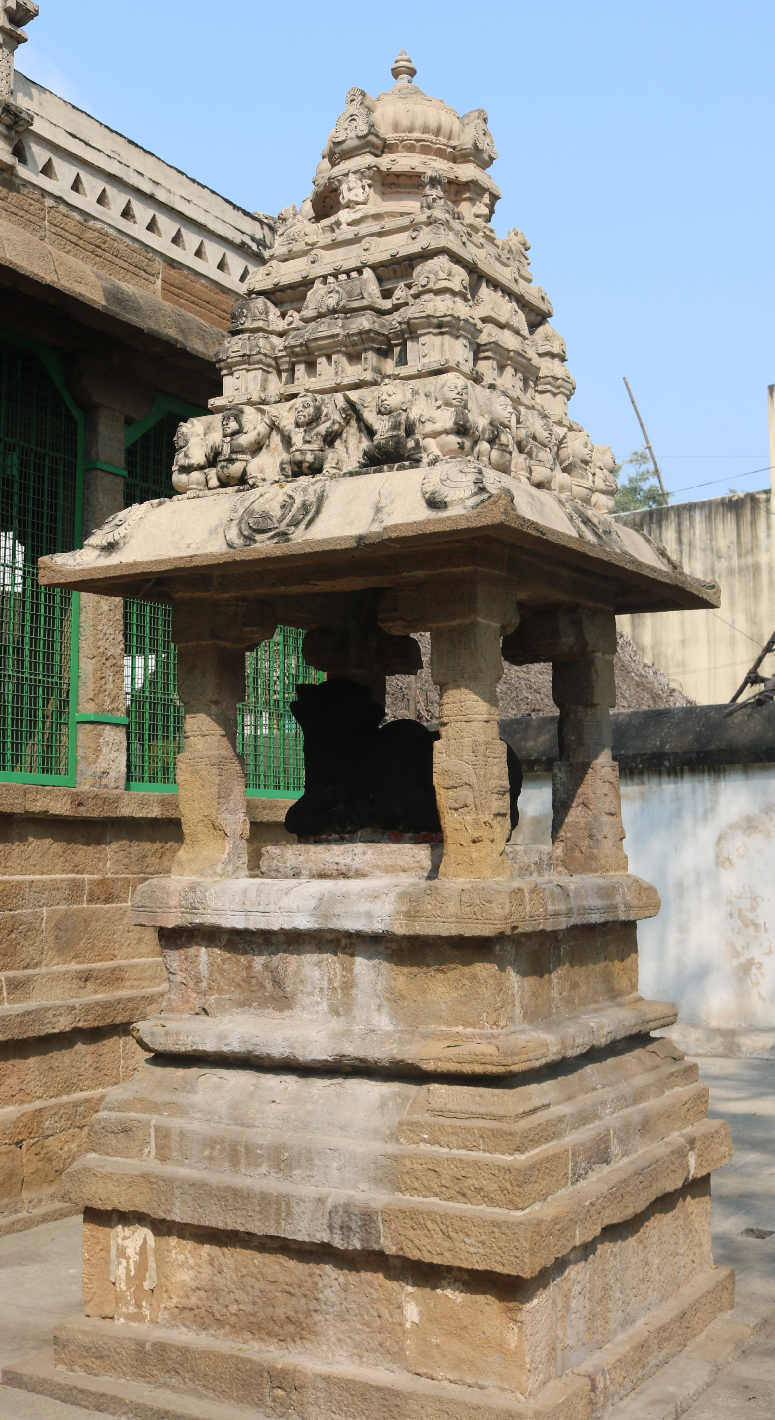 | சிற்பங்கள் | கருவறைக் கோட்டங்களில் தெற்கில் தென்முகக் கடவுள் (தட்சிணாமூர்த்தி) தனது பரிவாரங்களுடன் உள்ளார். மேற்கில் ஆனையுரித்த பிரான் (கஜசம்ஹாரமூர்த்தி), ஆடல்வல்லான், சண்டேசருக்கு அருள்பாலித்த சண்டேச அனுக்கிரக மூர்த்தி வடக்கில் காலனை வதைத்த காலாரி (காலாந்த மூர்த்தி), இராவணனுக்கு அனுக்கிரகம் செய்த இராவணானுக்கிரக மூர்த்தி, கங்கையை சடையில் தாங்கிய கங்காதர மூர்த்தி அர்த்த மண்டபக் கோட்டங்களில் தெற்கில் விநாயகர் தனது பரிவாரங்களுடனும், வடக்கில் எருமைத்தலையனை வென்ற தேவி விஷ்ணு துர்க்கை அமைக்கப்பட்டுள்ளனர். |