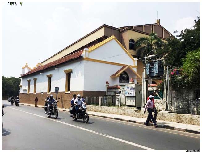 | கோயிலின் அமைப்பு | இந்த தேவாலயம் சாந்தோம் நெடுஞ்சாலையின் ஓரத்தில் அமைந்துள்ளது. சாலையிலிருந்தே இவ்வாலயத்தின் முகப்பினைக் காணமுடிகின்றது. முகப்புடன் கூடியதாக நுழைவாயில் வடிவமைக்கப்பட்டுள்ளது. நீள் செவ்வக வடிவில் இரண்டு தளங்களுடன் நீளவாக்கில் கட்டிட அமைப்பு உள்ளது. வழிபாட்டிடத்தின் மையப்பகுதி அலங்கார வளைவுகளால் புடைப்புகளாக செதுக்கப்பட்டு காட்சியளிக்கின்றது. |