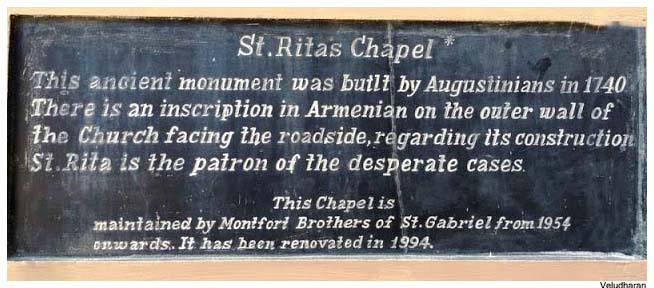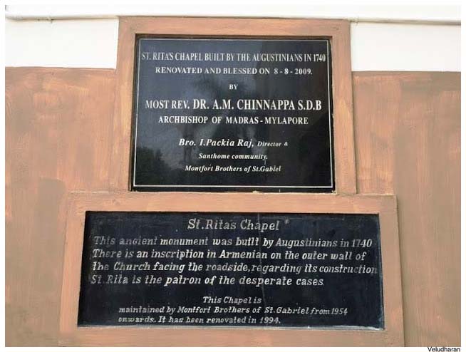 செயின்ட் ரீட்டாவின் சேப்பல் 1729 ஆம் ஆண்டில் ஆர்மீனியர்களால் கட்டப்பட்டது, செயின்ட் ரீட்டாவின் சேப்பல் அப்போது செயின்ட் தாமஸ் கிரிப்ட் திறக்கப்பட்டதை நினைவுகூரும் நோக்கம் கொண்டதாக நம்பப்படுகிறது. தேவாலயத்தின் சுவர்கள், எல்லா பக்கங்களிலும், கல்வெட்டுகளைக் கொண்ட கட்டமைக்கப்பட்ட பெட்டிகளையும் - முகப்பில் ஒரு வரியுடன் மற்றொரு போர்த்துகீசிய கல்வெட்டையும் - அதன் புதுப்பித்தல் பற்றி வைத்திருக்கின்றன. இந்த தேவாலயம் போர்த்துகீசிய கட்டிடக்கலைகளின் சொல்-கதை அறிகுறிகளை அதன் சமச்சீர் முகப்பில் மற்றும் மேலே உள்ள சதுப்பு போன்ற கட்டமைப்புகளைக் கொண்டுள்ளது. 300 ஆண்டுகள் பழமையான கட்டமைப்பு, இது இப்போது சாலையின் ஓரத்தில் மாற்றப்பட்டுள்ளது. ஒரு பாரம்பரிய சொத்து, தேவாலயத்தைச் சுற்றியுள்ள நிலம் மெதுவாக மற்ற பயன்பாட்டிற்காக வாங்கப்பட்டது. முழுப் பகுதியும் தற்போது சாந்தோம் உயர்நிலைப் பள்ளியின் ஒரு பகுதியாகும், இது மான்ட்போர்ட் சகோதரர்களால் பராமரிக்கப்படுகிறது. சந்தர்ப்பத்தில் திறக்கப்பட்ட இந்த தேவாலயம் பலிபீடத்திற்குள் ஆர்மீனிய கல்வெட்டுகளை வைத்திருக்கிறது.