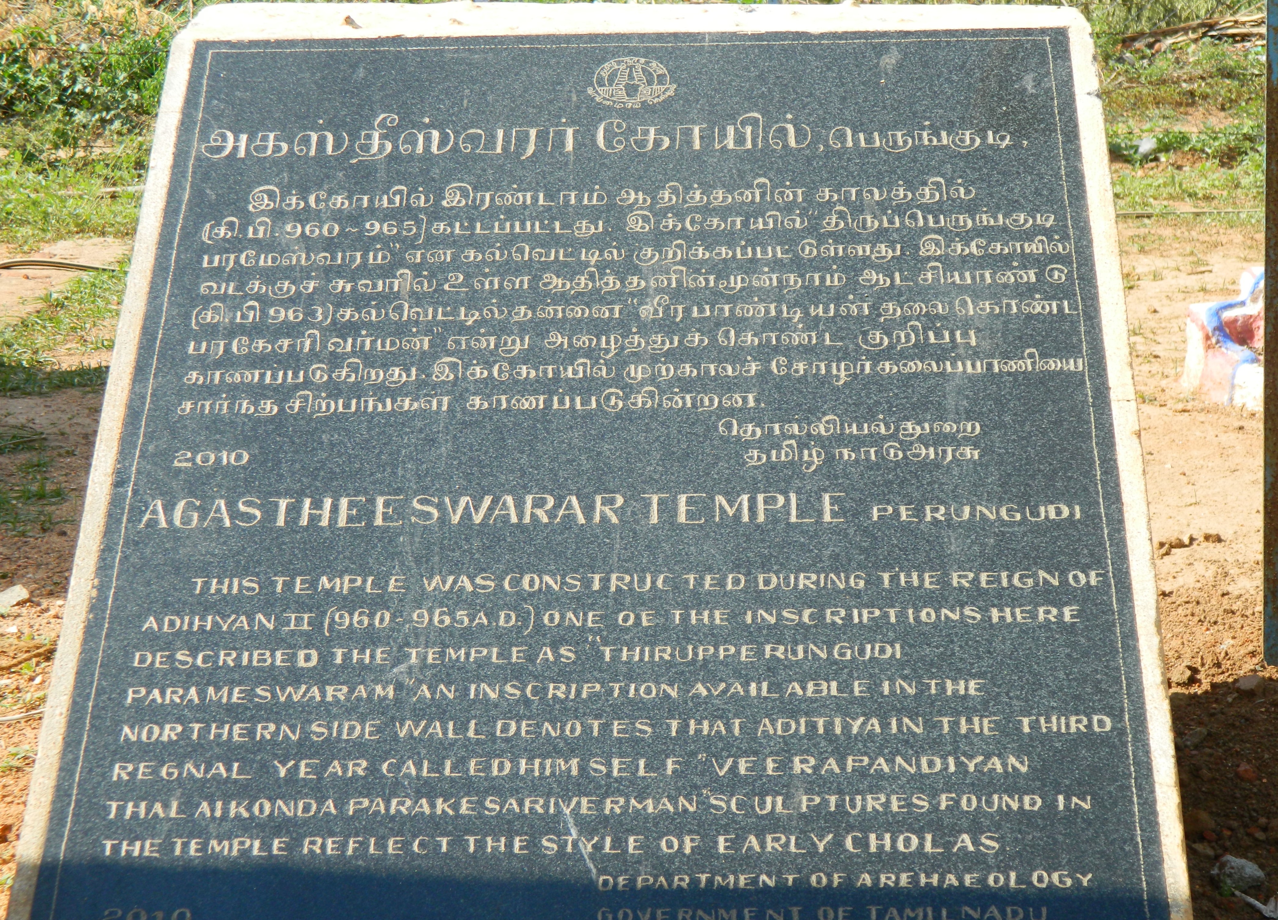 பெருங்குடியில் உள்ள அகஸ்தீஸ்வரர் கோயிலில் இரண்டாம் பராந்தகனான சுந்தரசோழனின் எட்டாம் ஆட்சியாண்டு கல்வெட்டு காணப்படுவதால் சுந்தரசோழன் கி.பி.968 காலத்தில் இக்கோயில் எழுப்பப் பெற்றதாக இருக்கலாம். சுந்தரசோழனின் மகன் ஆதித்த கரிகாலனின் 3-ஆம் ஆட்சியாண்டு கல்வெட்டுகள் இக்கோயிலில் காணப்படுகின்றன. வீரபாண்டிய தலைக்கொண்ட கோப்பரகேசரி என்று ஆதித்த கரிகாலன் குறிப்பிடப்படுகிறான். பிற்காலச் சோழர்காலக் கல்வெட்டுகளில் பெருமுடி அகத்தீஸ்வரமுடையார் என அழைக்கப்படுகிறது. இக்கோயிலும் சிற்பங்களும் சுந்தரசோழன் கால கட்டட-சிற்பக் கலைக்கு சிறந்த சான்றாகத் திகழ்கிறது. கருவறைக் கோட்டங்களில் தட்சிணாமூர்த்தி, அர்த்தநாரீஸ்வரர், பிரம்மா, சண்டிகேசுவரர், விஷ்ணு, முருகன் கணபதி ஆகிய சிற்பங்கள் அமைந்துள்ளன.