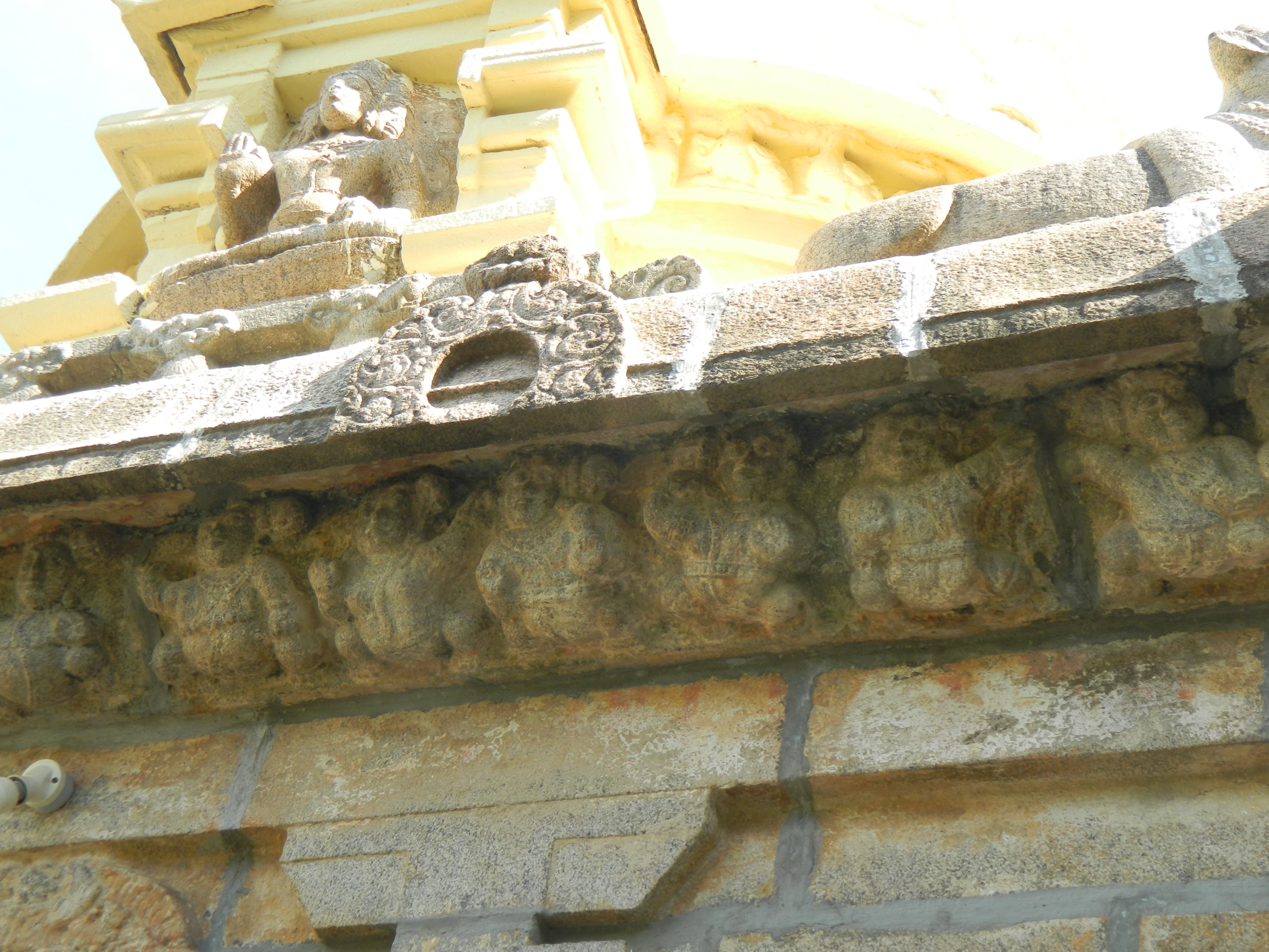 | சிற்பங்கள் | கருவறை விமான தேவகோட்டங்களில் தெற்கே தென்முகக் கடவுளும், மேற்கே மாதொரு பாகனும், வடக்கே நான்முகனும் அமைக்கப்பட்டுள்ளனர். சண்டிகேசுவரர் சிற்பம் தனியாக உள்ளது. முகமண்டபத்தில் விஷ்ணு, ஆலிங்கனமூர்த்தி, முருகன், சப்தமாதர்கள், சனைஸ்சரன், கணபதி ஆகிய சிற்பங்கள் இடம் பெற்றுள்ளன. அரைத்தூண்களில் புடைப்புச் சிற்பங்கள் உள்ளன. விமானத்தின் கழுத்துப்பகுதியில நாற்புறமும் நந்தி காட்டப்பட்டுள்ளது. கொடுங்கைக்கு கீழே பூதவரி செல்கிறது. பூதகணங்கள் ஆடல் பாடலுடன் காட்சியளிக்கின்றன. |
