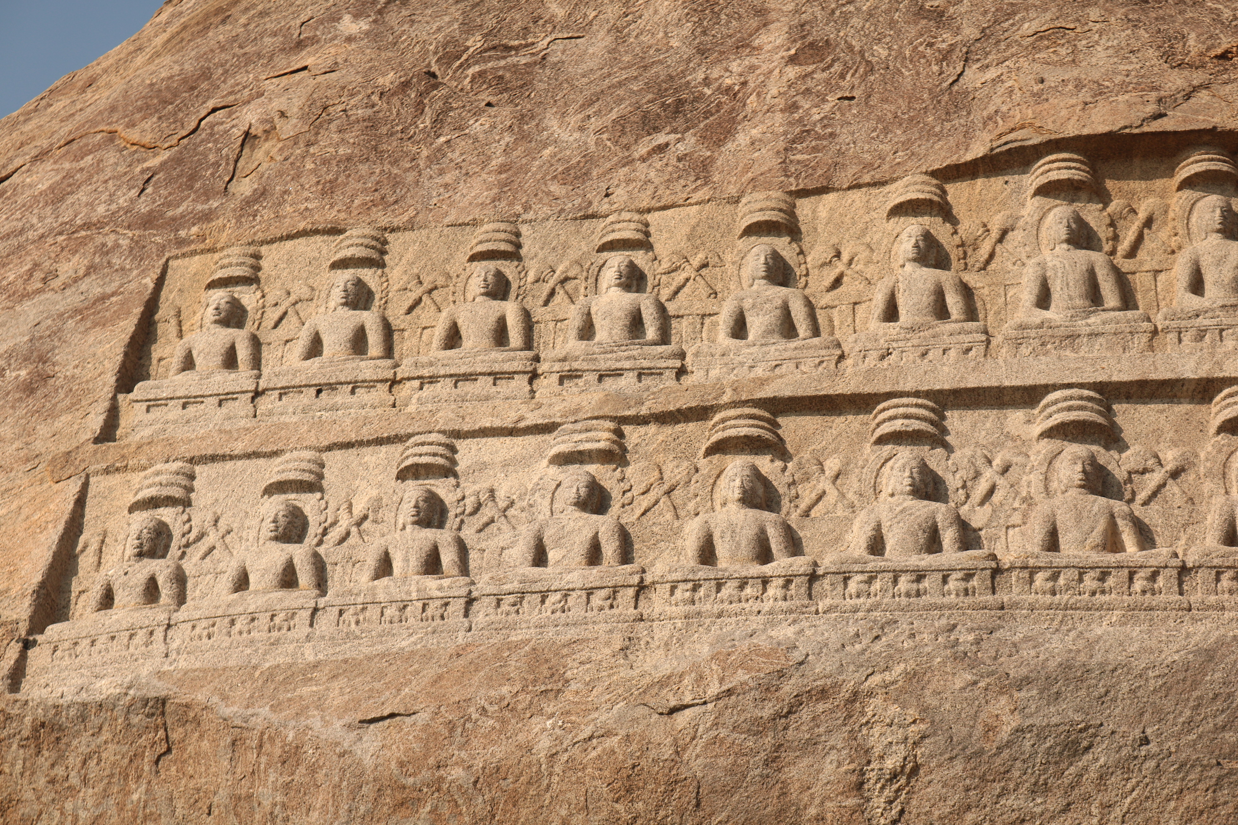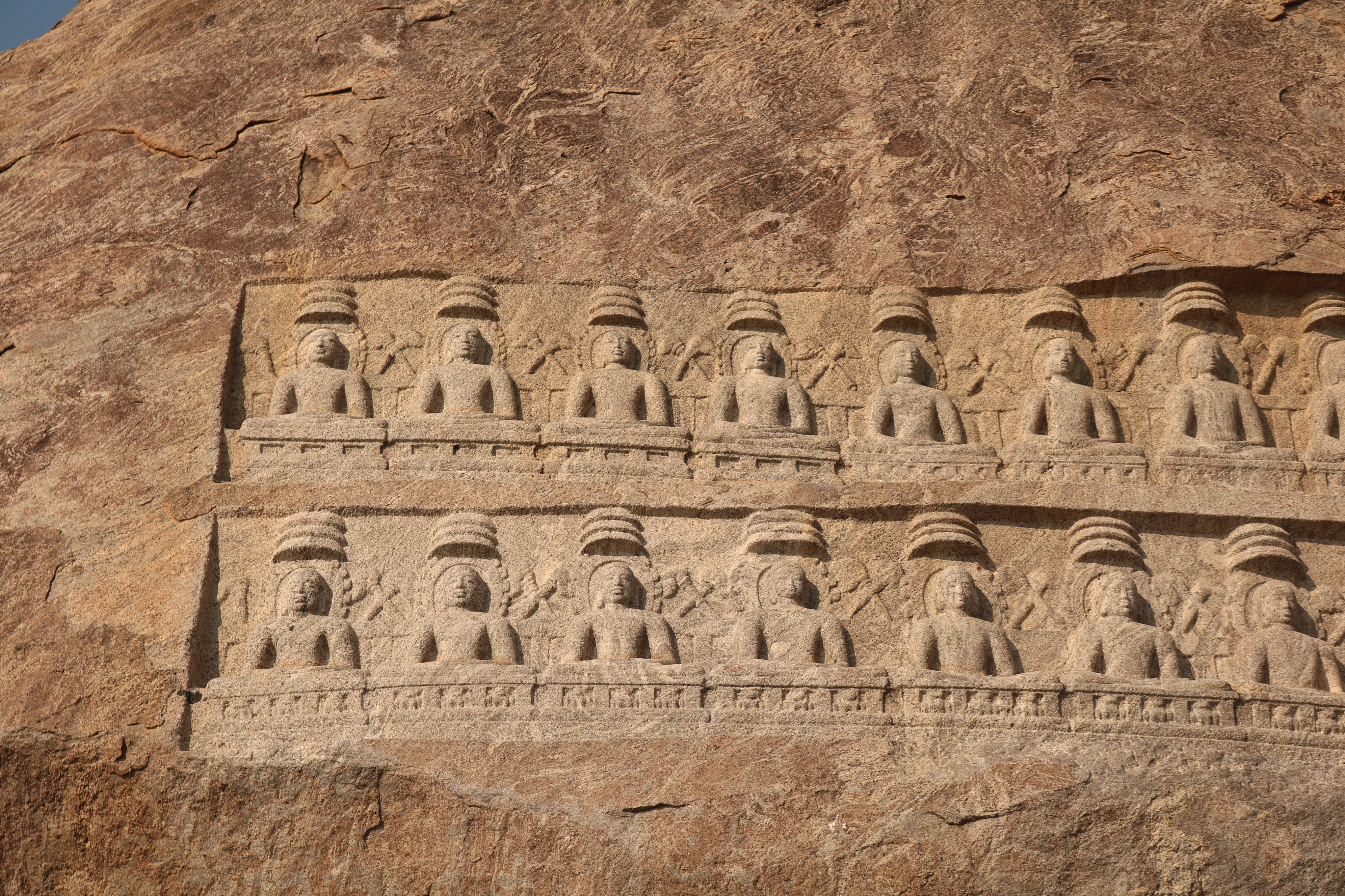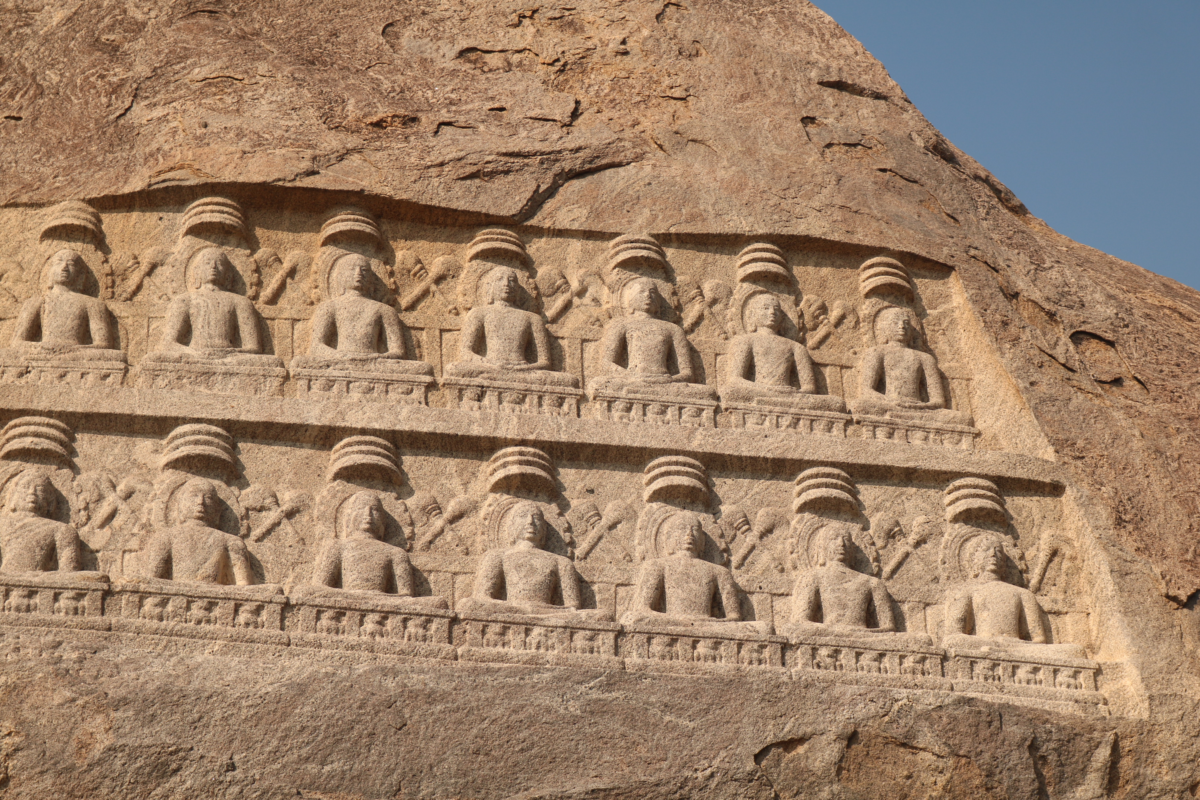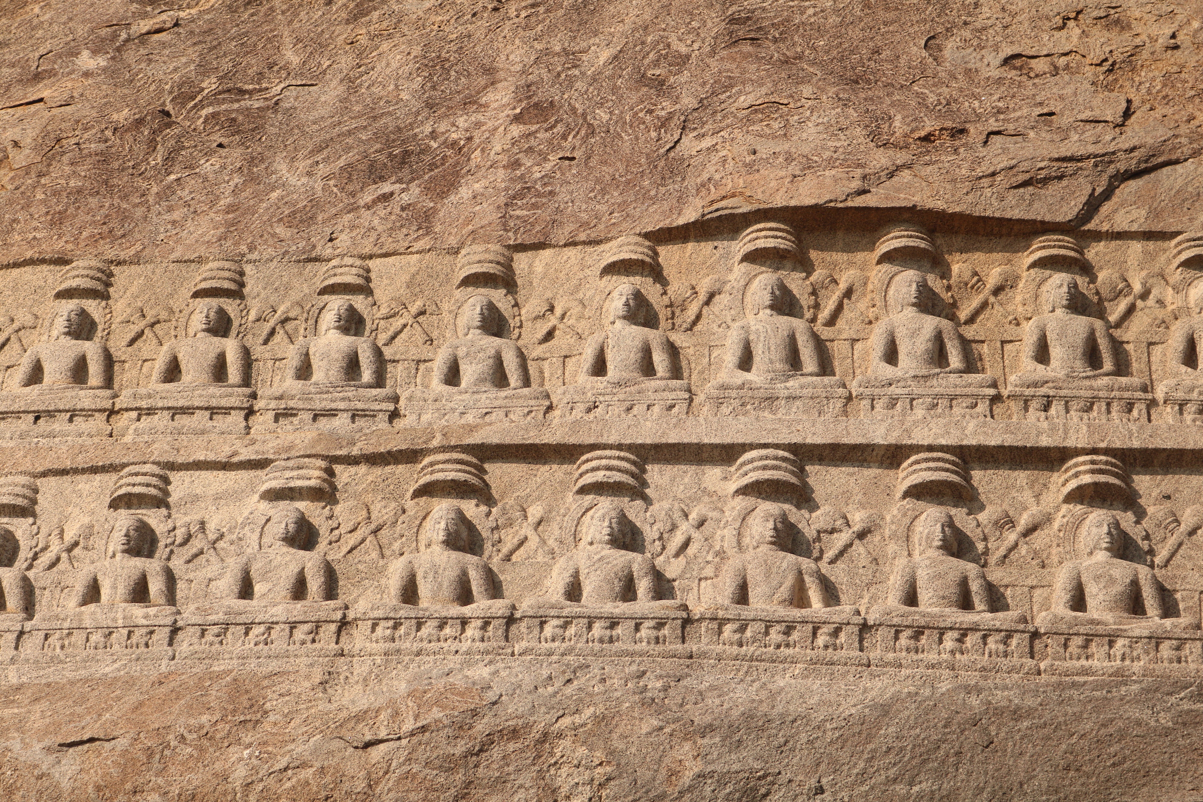 | சிற்பங்கள் | திருநாதர்குன்றின் உச்சிப்பகுதியில்பெரிய கற்பாறை ஒன்று காணப்படுகிறது. அதன் உச்சி பகுதியில் இரண்டு வரிசைகளில் சமமான இடைவெளியில் செதுக்கப்பட்டுள்ள 24 சிற்பங்கள் நமது கண்களை கவரும் வகையில் உள்ளன. அந்தச் சிற்பங்கள், சமணத்தைப் பரப்பிய தீர்த்தங்கரர்களின் திருமேனிகள் எனக் கூறப்படுகின்றன. முதல் வரிசையில் உள்ள 12 தீர்த்தங்கரர்கள் சிற்பங்களும், இரண்டாம் வரிசையில் உள்ள 12 தீர்த்தங்கரர்கள் சிற்பங்களும் அமர்ந்த நிலையிலேயே வடிவமைக்கப்பட்டுள்ளன. சாமரங்கள் ஒவ்வொரு தீர்த்தங்கரரின் இடையிலும் பொறிக்கப்பட்டுள்ளன. ஒவ்வொரு தீர்த்தங்கரர்களின் தலையின் மேற்பகுதியிலும் முக்குடை அமைப்பு காணப்படுகிறது. |