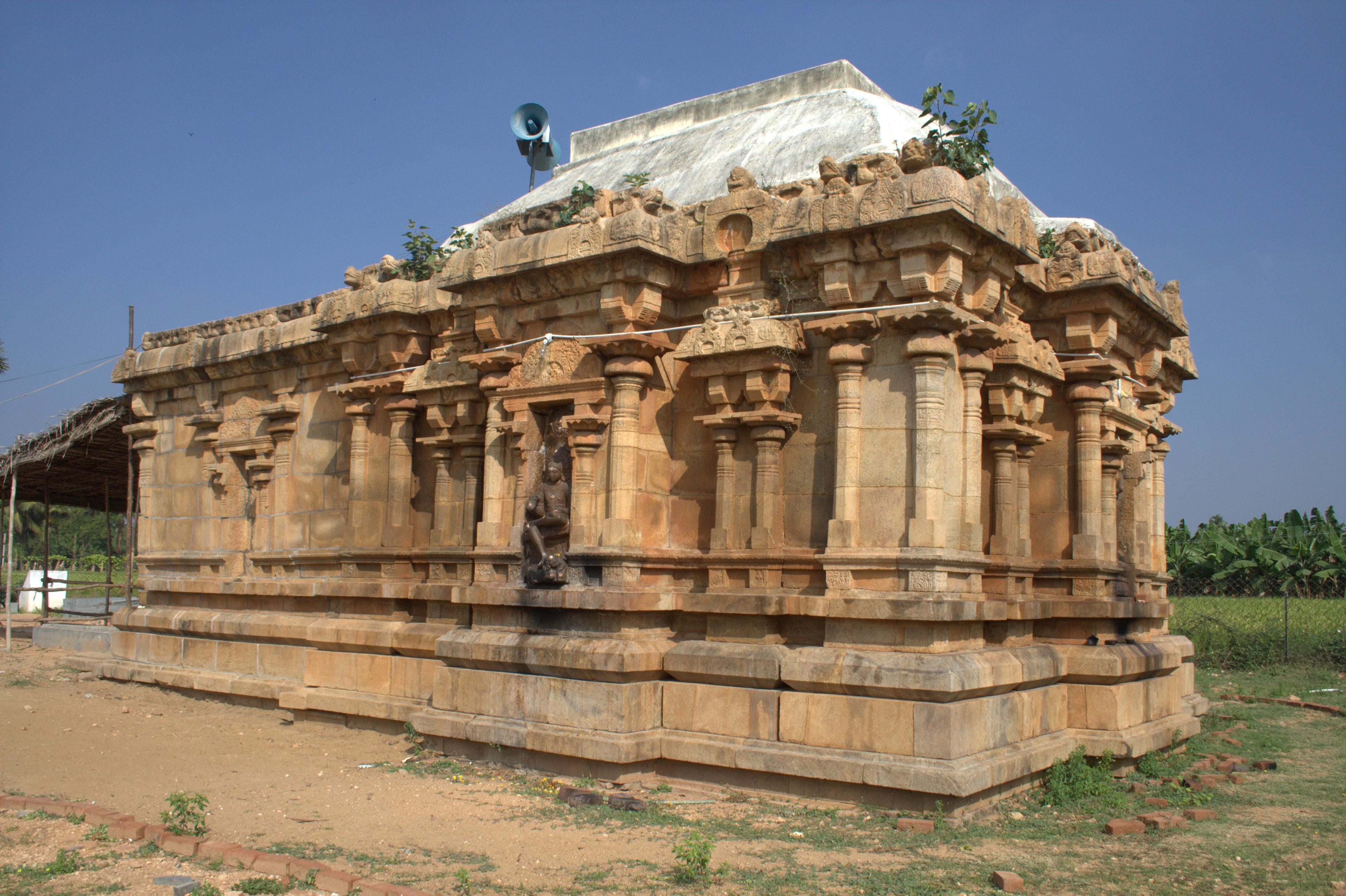 | கோயிலின் அமைப்பு | இக்கோயில் புனரமைக்கப்பட்டுள்ளது. கருவறையும் அர்த்தமண்டமும் கொண்டதாக விளங்குகிறது. இக்கோயில் தற்போது விமானத்தின் தளம் இன்றி காணப்படுகிறது. சோழர்கள் காலத்தில் விமானத்தின் தளம் செங்கற்களால் கட்டப்பட்டதால் சிதைவுற்றது. இக்கோயில் திராவிட பாணியில் அமைந்துள்ளது. சதுரவடிவமான கருவறையில் இலிங்க வடிவில் இறைவன் உள்ளார். அர்த்த மண்டபத்தில் சோழர்கால உருளைத்தூண்கள் அமைந்துள்ளன. தேவகோட்டங்களில் முறையே சிற்பங்கள் அமைந்துள்ளன. தாங்குதளத்தில் இராமாயண மற்றும் சிவ வடிவ புடைப்புச் சிற்பங்கள் காணப்படுகின்றன. கொடுங்கையின் கீழே பூதவரிகள் ஆடல் பாடலுடன் அமைக்கப்பட்டுள்ளது. தஞ்சை பெரியகோயிலில் கல்வெட்டில் குறிக்கப்பட்டுள்ள நடனமாதர்கள் இவ்வூரில் வசித்து வந்துள்ளனர். அவர்களுக்கு இவ்வூரில் நிலம் தானமாகக் கொடுக்கப்பட்டுள்ளது என்பது தெரிகிறது. சுவர்ப்பகுதியில் அரைத்தூண்கள் அழகு செய்கின்றன. தாங்குதளத்தில் கல்வெட்டுகள் காணப்படுகின்றன. சோழர்கள் காலத்தில் இக்கோயில் மிகவும் சிறப்புடையதாய் இருந்திருக்கிறது என்பதை இங்குள்ள கல்வெட்டுகளின் மூலம் அறியலாம். |
