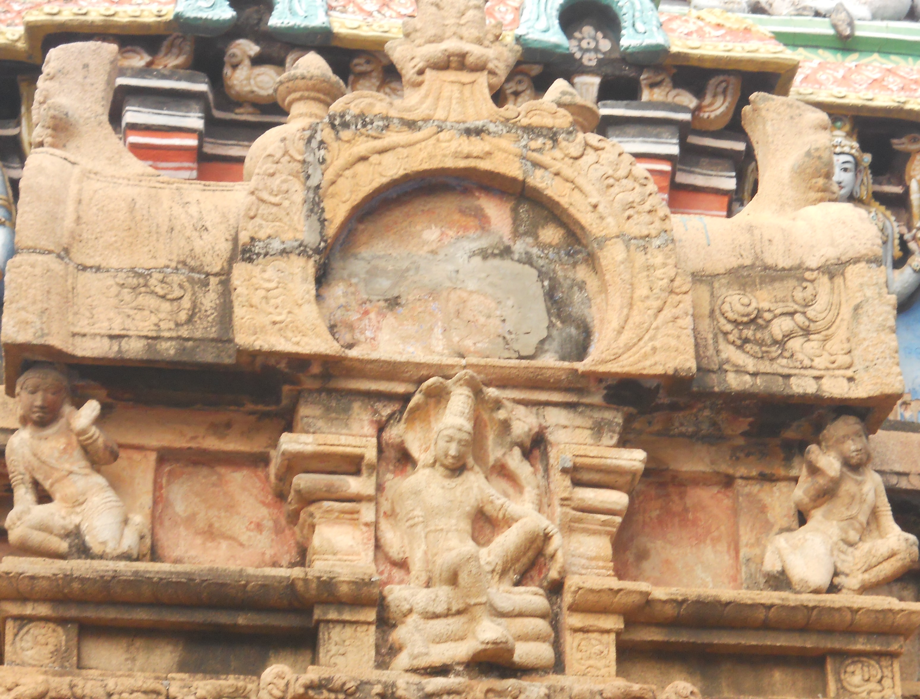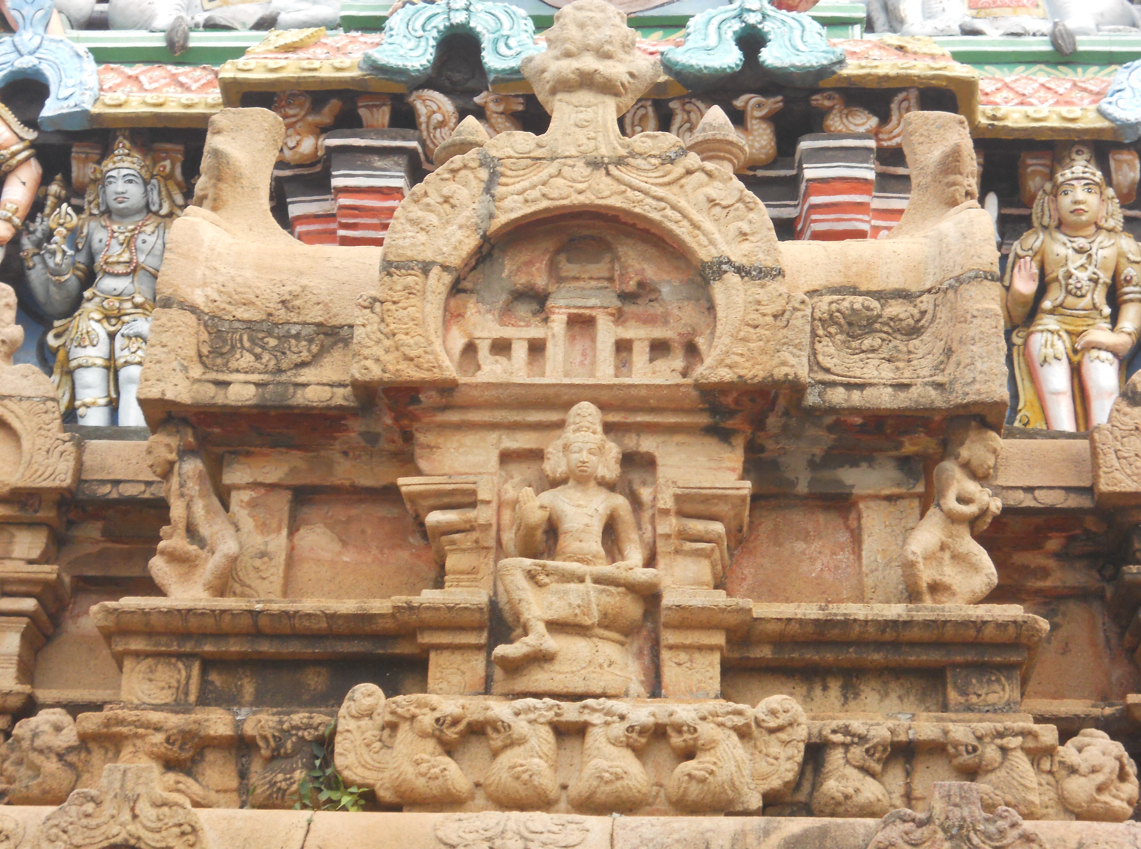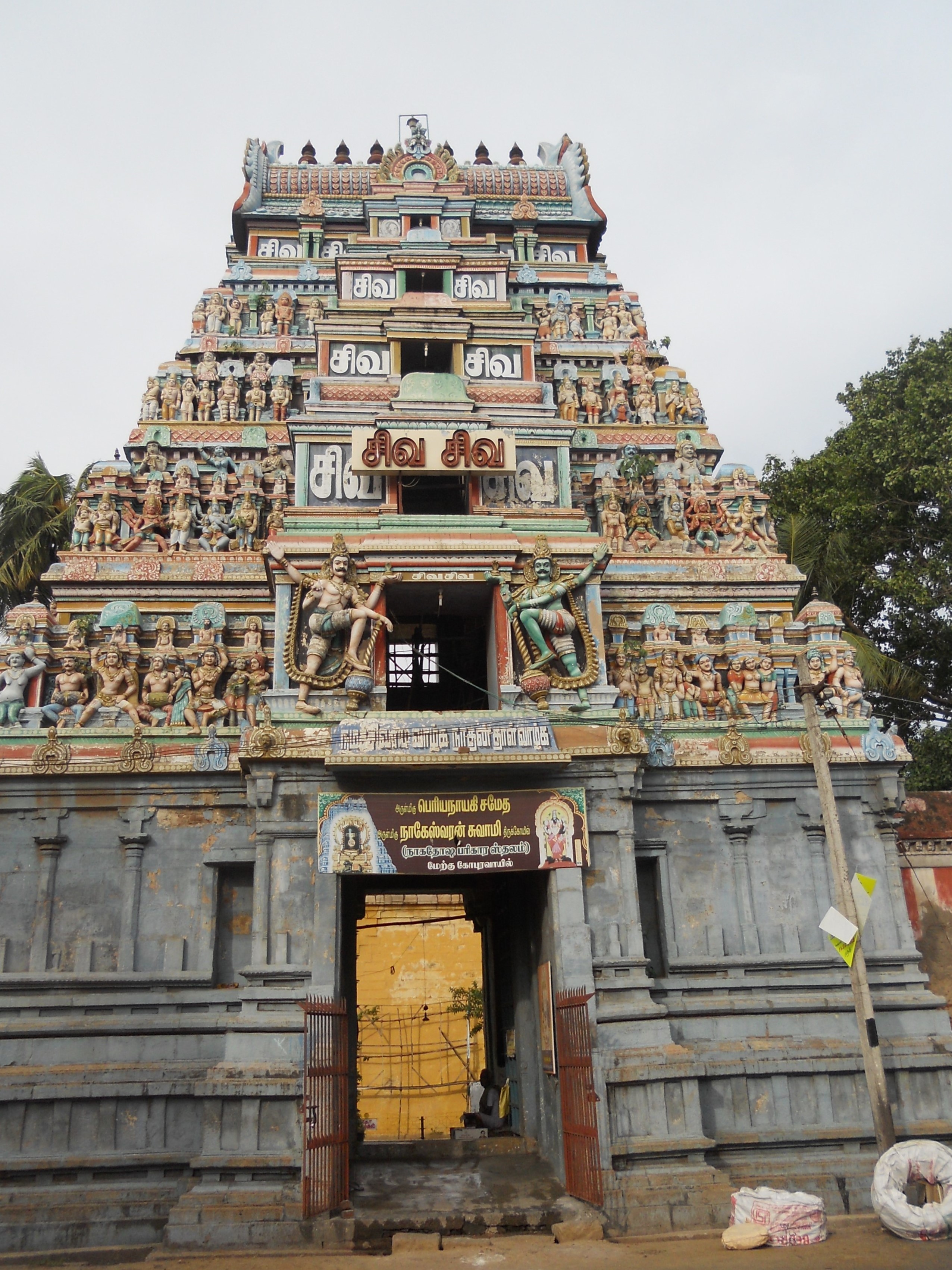 | சிற்பங்கள் | கருவறை விமானத்தின் தாங்குதளத்தில் இராமாயண புடைப்புச் சிற்பங்கள் அமைந்துள்ளன. தேவகோட்டங்களில் முறையே தெற்கில் தென்முகக்கடவுள், மேற்கில் மாதொரு பாகன், வடக்கில் நான்முகன், மற்றும் அர்த்தமண்டப வெளிப்புறக் கோட்டத்தில் துர்க்கையும் உள்ளனர். மேலும் சுவர்ப்பகுதியில் உள்ள கோட்டப்பகுதியில் மிகவும் எழில் வாய்ந்த ஆண், பெண் திருவுருவங்கள் காணப்படுகின்றன. இவை சீனிவாசநல்லூர் குறங்கநாதர் கோயில் சிற்பங்களைப் போன்று அமைந்துள்ளது குறிப்பிடத்தக்கது. தளங்களில் வடக்கில் நான்முகனும், தெற்கில் வீணைமீட்டும் பெருமானும், மேற்கில் திருமால் அமர்ந்த நிலையிலும் காட்டப்பட்டுள்ளனர். மேலும் ஆடல்மகள், மத்தளம் வாசிக்கும் பெண், துறவியர், புத்தர் போன்ற சிற்பங்களும் தளப்பகுதியில் அமைந்துள்ளன. இரண்டாவது தளத்தில் தற்காலத்தில் வடிவமைக்கப்பட்ட சுதைச் சிற்பங்கள் காணப்படுகின்றன. நந்தி மண்டபத்தில் நந்தி சிற்பம் உள்ளது. ஆனந்த தாண்டவர தேர் கோயிலில் குதிரை, யானை ஆகியவை தேரை இழுத்துச் செல்வது போல் காட்சி அமைக்கப்பட்டுள்ளது. இராஜகோபுரத்தில் பிச்சை ஏற்கும் பெருமான், காலனை வதைத்த பெருமான் ஆகிய சிற்பங்கள் மிக அழகாக வடிக்கப்பட்டுள்ளன. |