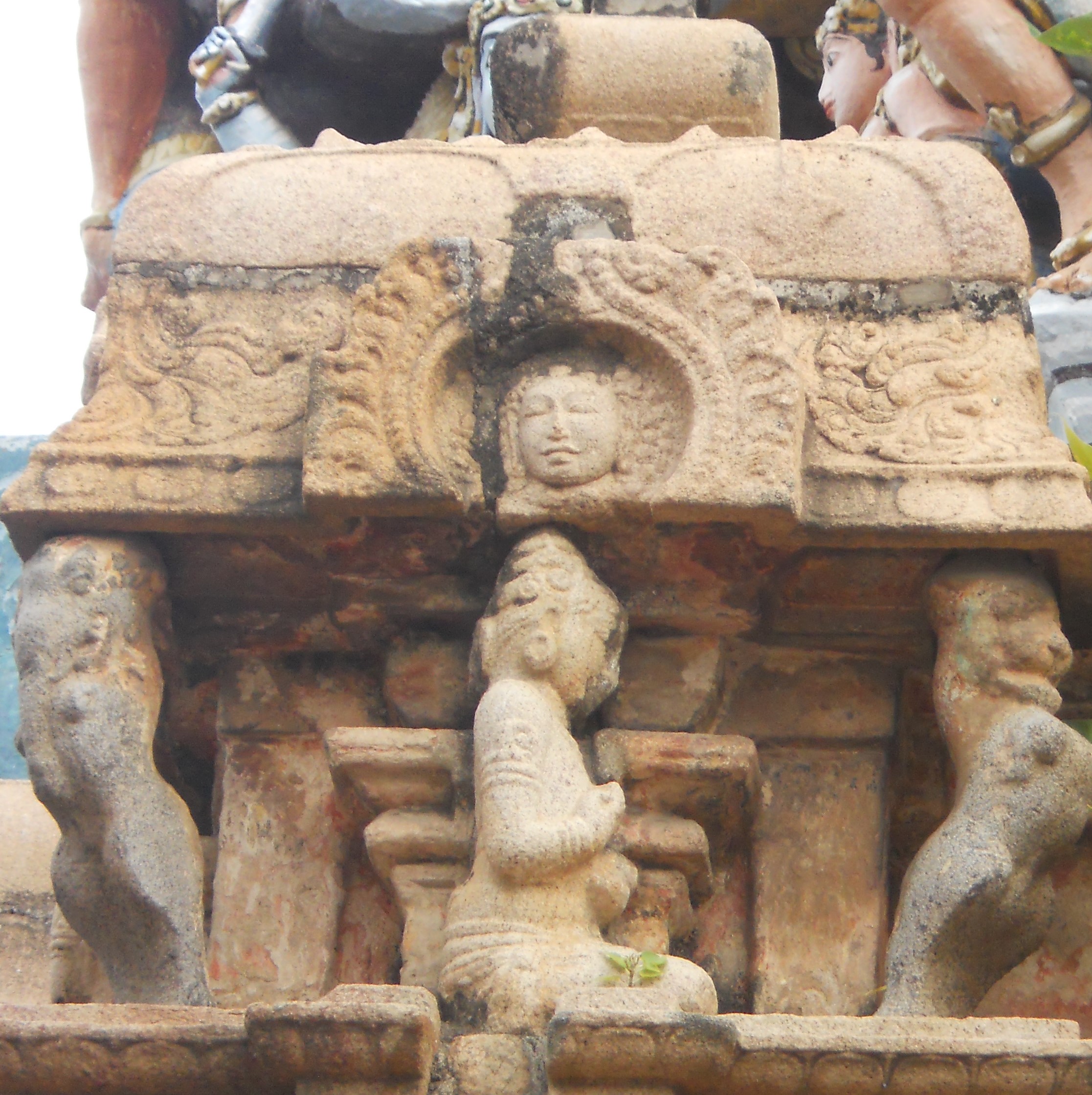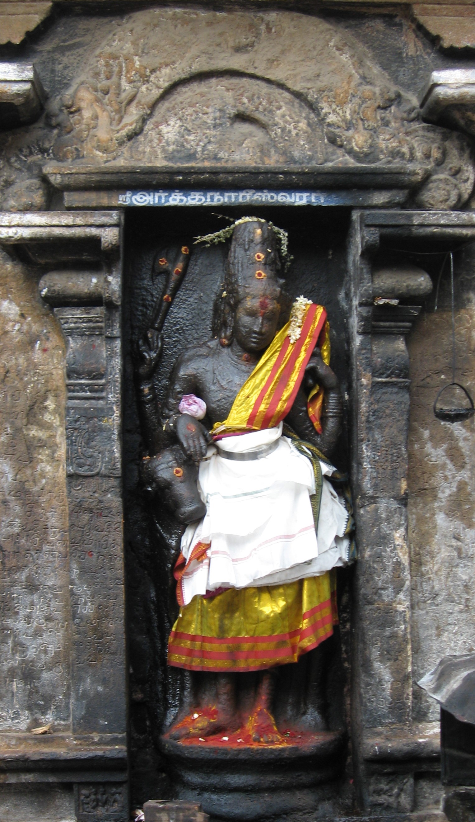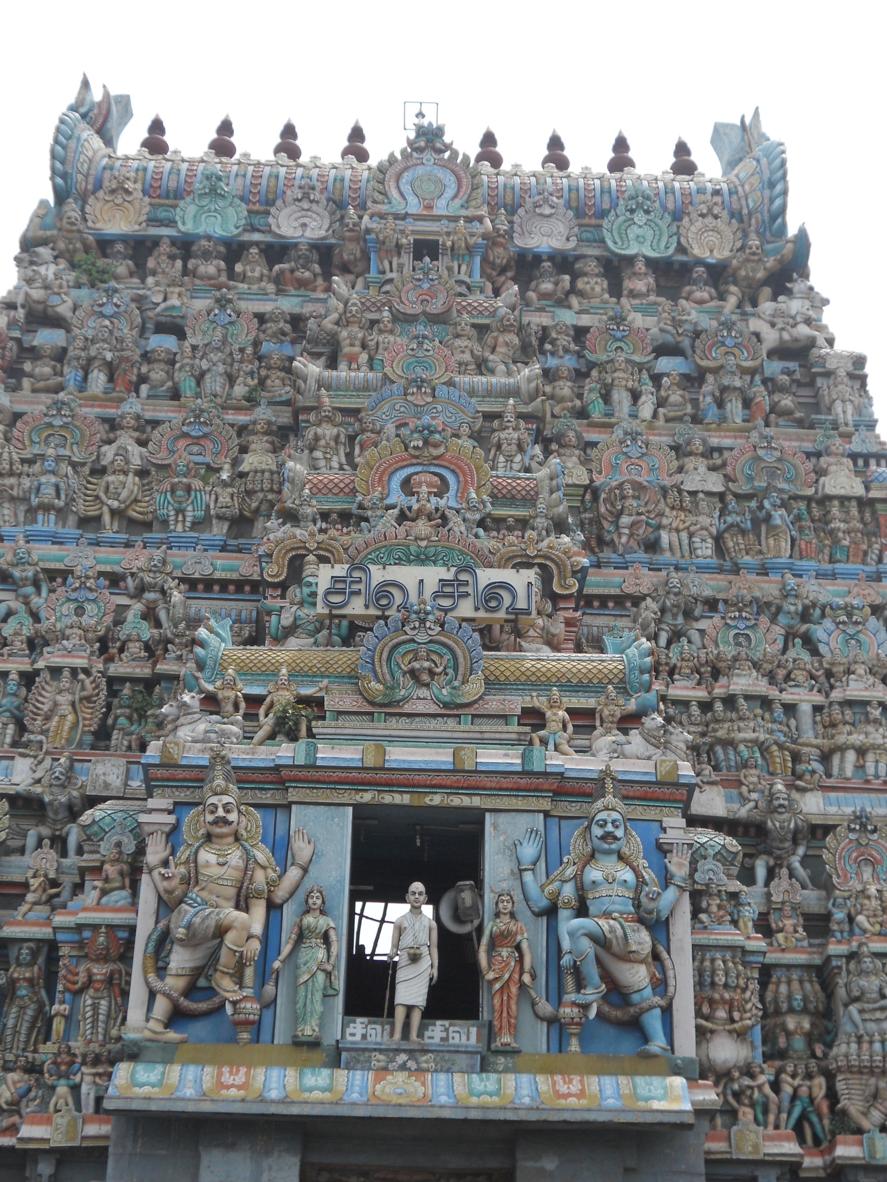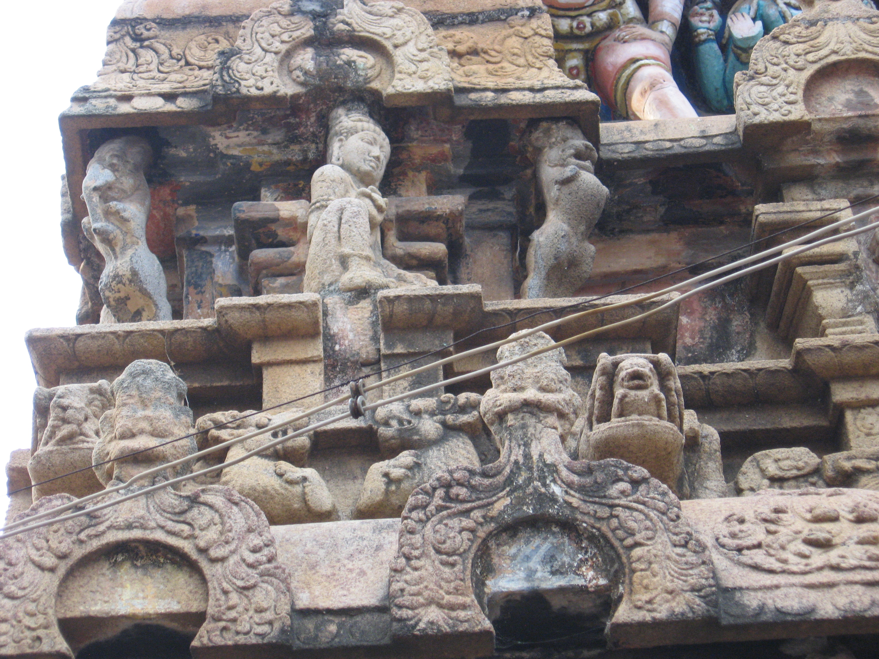 | சிற்பங்கள் | கருவறை விமானத்தின் தாங்குதளத்தில் இராமாயண புடைப்புச் சிற்பங்கள் அமைந்துள்ளன. தேவகோட்டங்களில் முறையே தெற்கில் தென்முகக்கடவுள், மேற்கில் மாதொரு பாகன், வடக்கில் நான்முகன், மற்றும் அர்த்தமண்டப வெளிப்புறக் கோட்டத்தில் துர்க்கையும் உள்ளனர். மேலும் சுவர்ப்பகுதியில் உள்ள கோட்டப்பகுதியில் மிகவும் எழில் வாய்ந்த ஆண், பெண் திருவுருவங்கள் காணப்படுகின்றன. இவை சீனிவாசநல்லூர் குறங்கநாதர் கோயில் சிற்பங்களைப் போன்று அமைந்துள்ளது குறிப்பிடத்தக்கது. தளங்களில் வடக்கில் நான்முகனும், தெற்கில் வீணைமீட்டும் பெருமானும், மேற்கில் திருமால் அமர்ந்த நிலையிலும் காட்டப்பட்டுள்ளனர். மேலும் ஆடல்மகள், மத்தளம் வாசிக்கும் பெண், துறவியர், புத்தர் போன்ற சிற்பங்களும் தளப்பகுதியில் அமைந்துள்ளன. இரண்டாவது தளத்தில் தற்காலத்தில் வடிவமைக்கப்பட்ட சுதைச் சிற்பங்கள் காணப்படுகின்றன. நந்தி மண்டபத்தில் நந்தி சிற்பம் உள்ளது. ஆனந்த தாண்டவர தேர் கோயிலில் குதிரை, யானை ஆகியவை தேரை இழுத்துச் செல்வது போல் காட்சி அமைக்கப்பட்டுள்ளது. இராஜகோபுரத்தில் பிச்சை ஏற்கும் பெருமான், காலனை வதைத்த பெருமான் ஆகிய சிற்பங்கள் மிக அழகாக வடிக்கப்பட்டுள்ளன. |