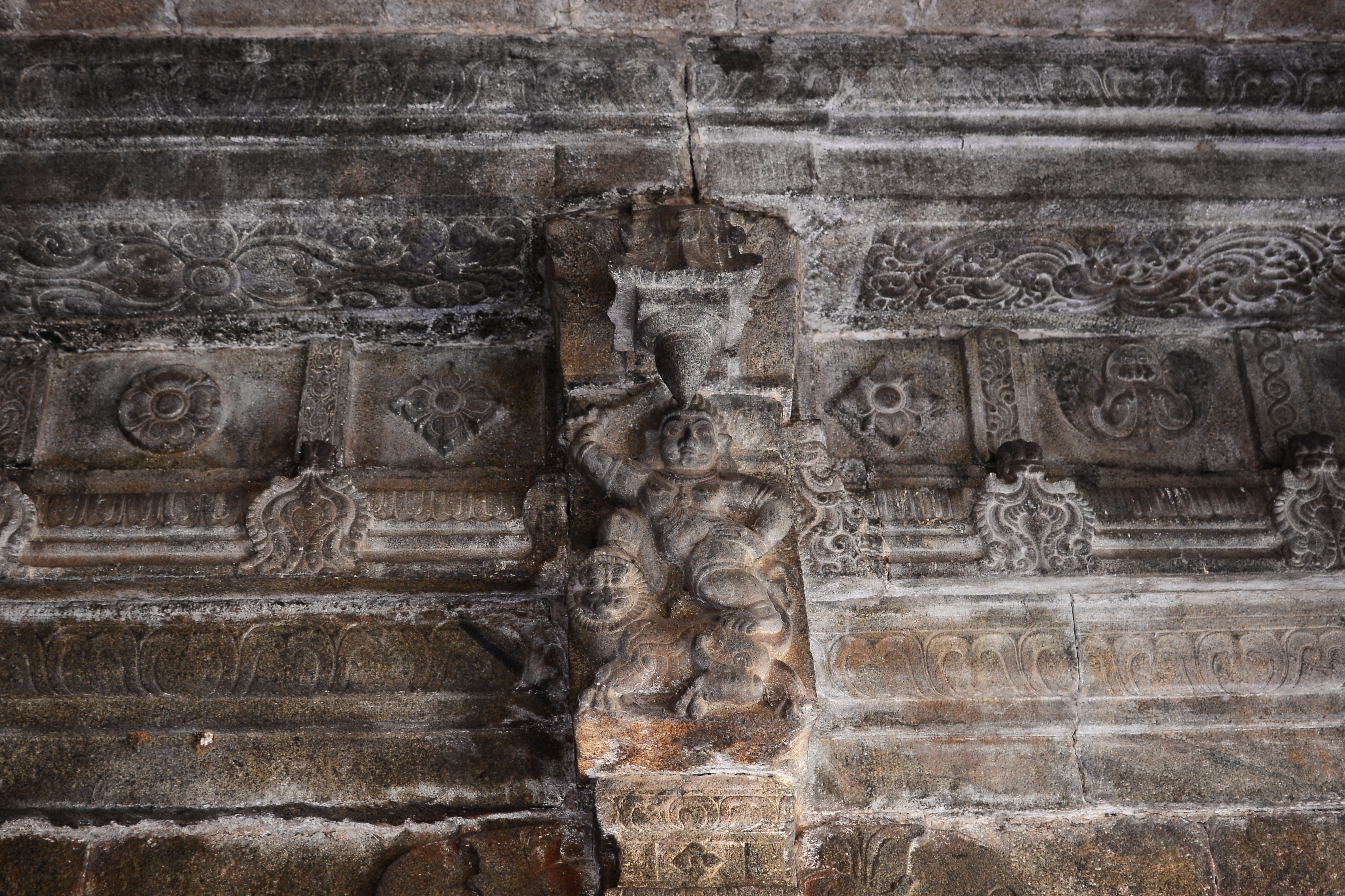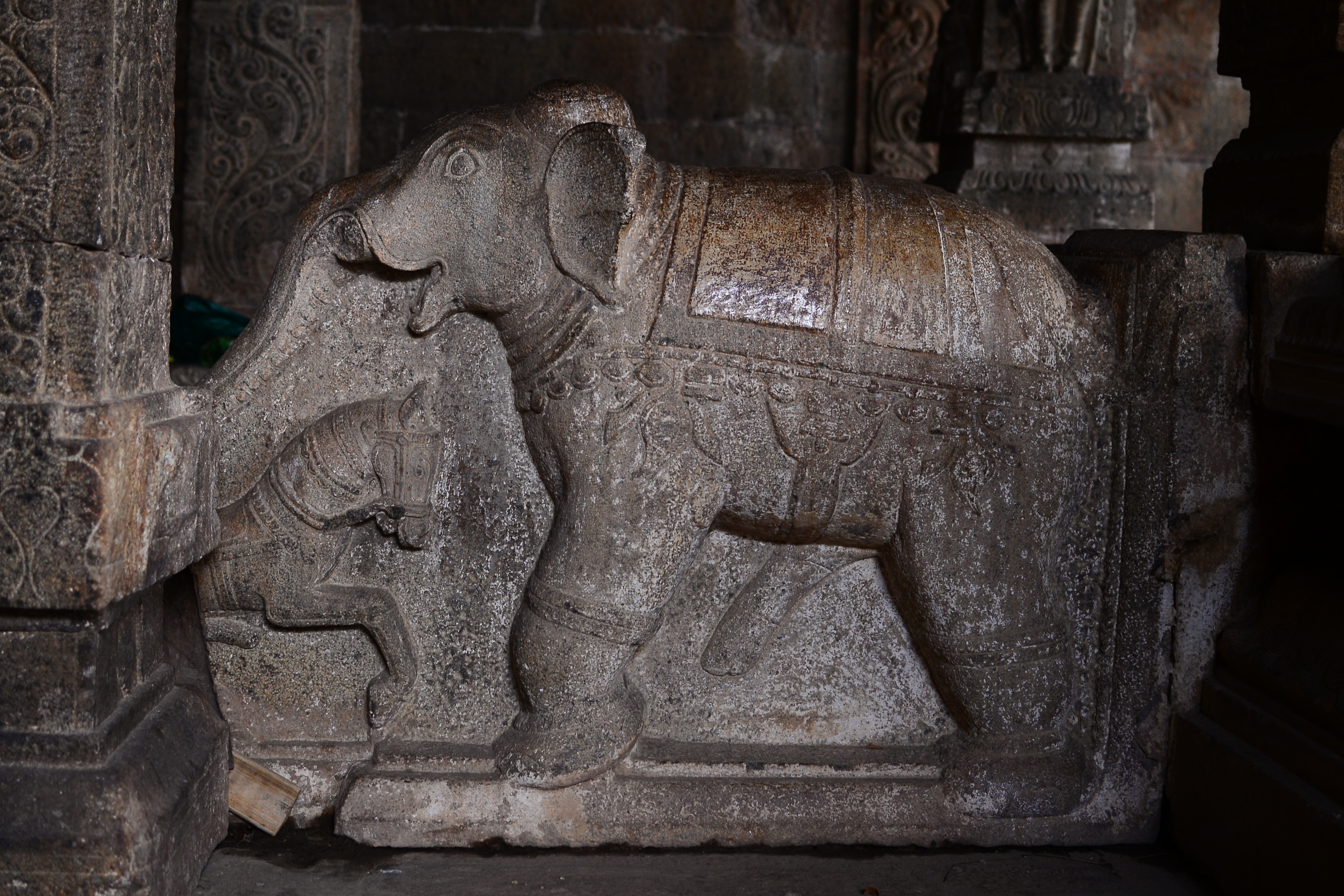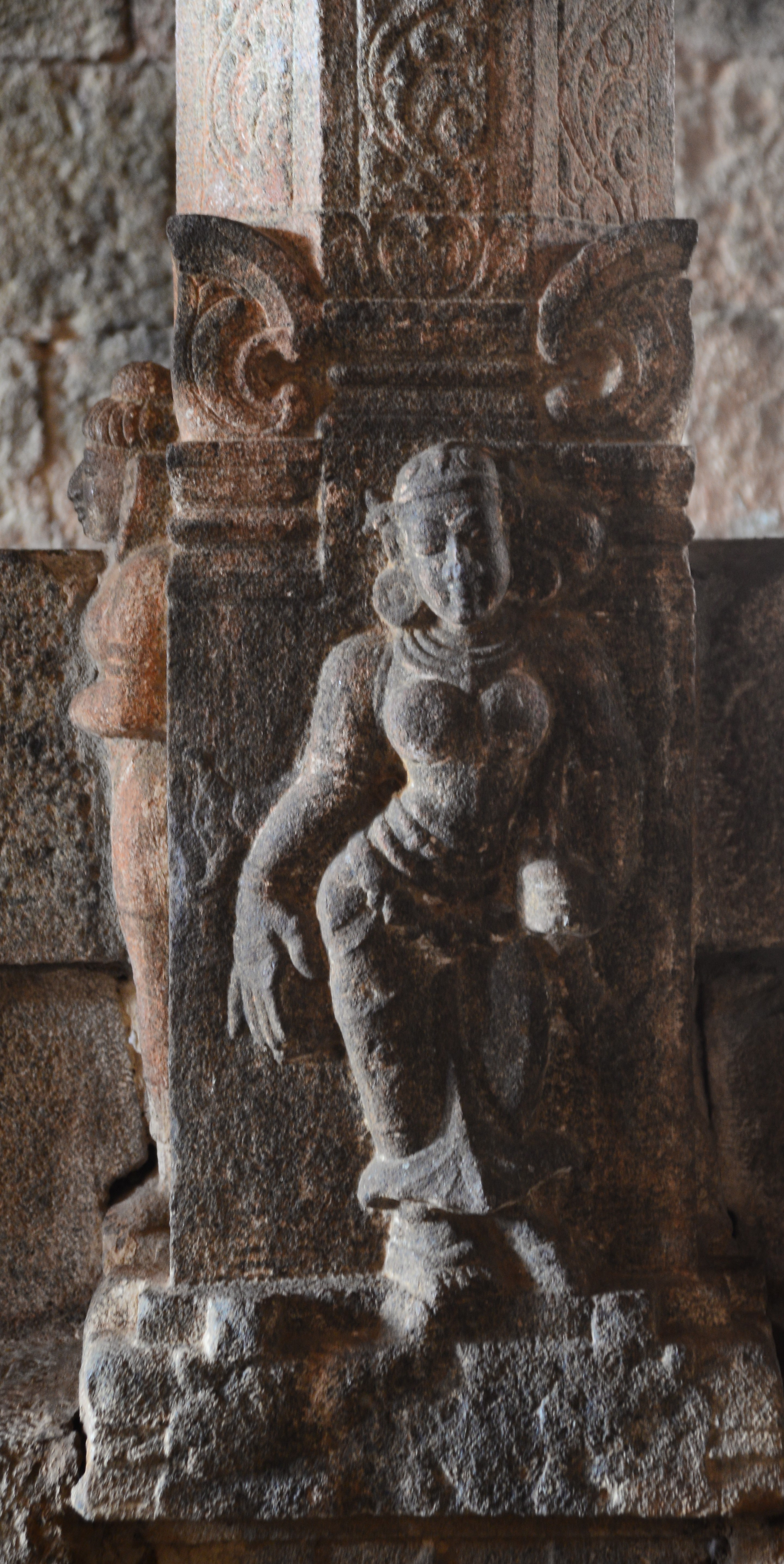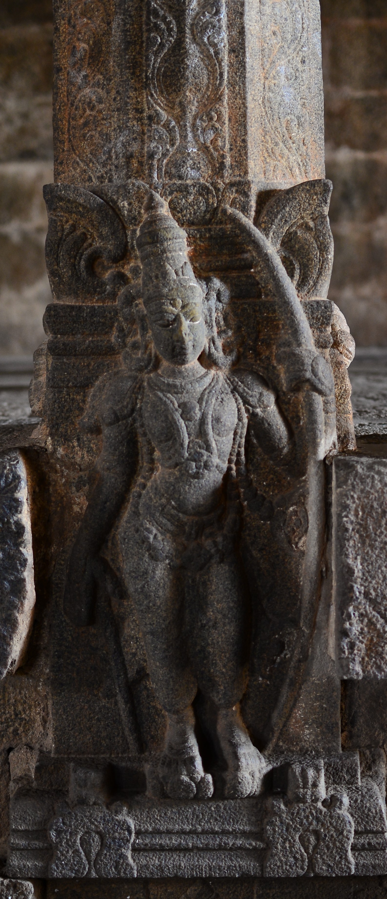 | சிற்பங்கள் | கருவறை விமானத்தின் தளங்களில் சுதையாலான திருமால் சிற்பங்கள் காணப்படுகின்றன. சிம்மம் தாங்குதளம் கொண்ட தூண்கள் உள்ளன. மேலும் தூண்களில் அடியவர், அரசன், அரசியார், பணிப்பெண், இராமன், இலக்குவன், சீதை, வீரன், அருச்சுனன், சிவன், அனுமன், கண்ணாடிப்பெண், பணிப்பெண், முதியவர் ஆகிய பல புடைப்புச் சிற்பங்கள் காணப்படுகின்றன. மண்டபங்களிலுள்ள தூண்களில் உள்ள இச்சிற்பங்கள் மிகுந்த எழில் வாய்ந்தவையாக விசயநகரர் காலத்தில் அமைக்கப்பட்டுள்ளன. |