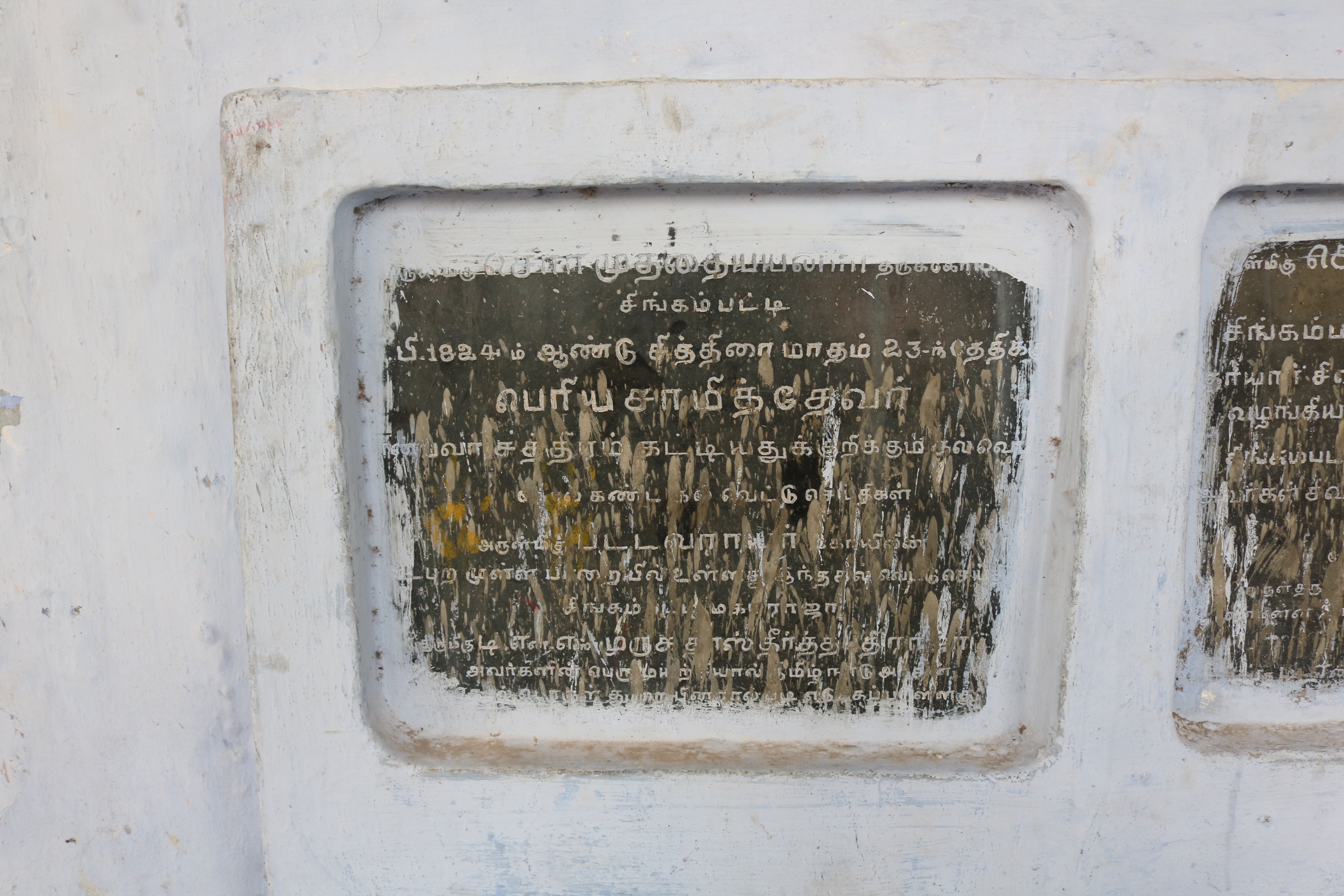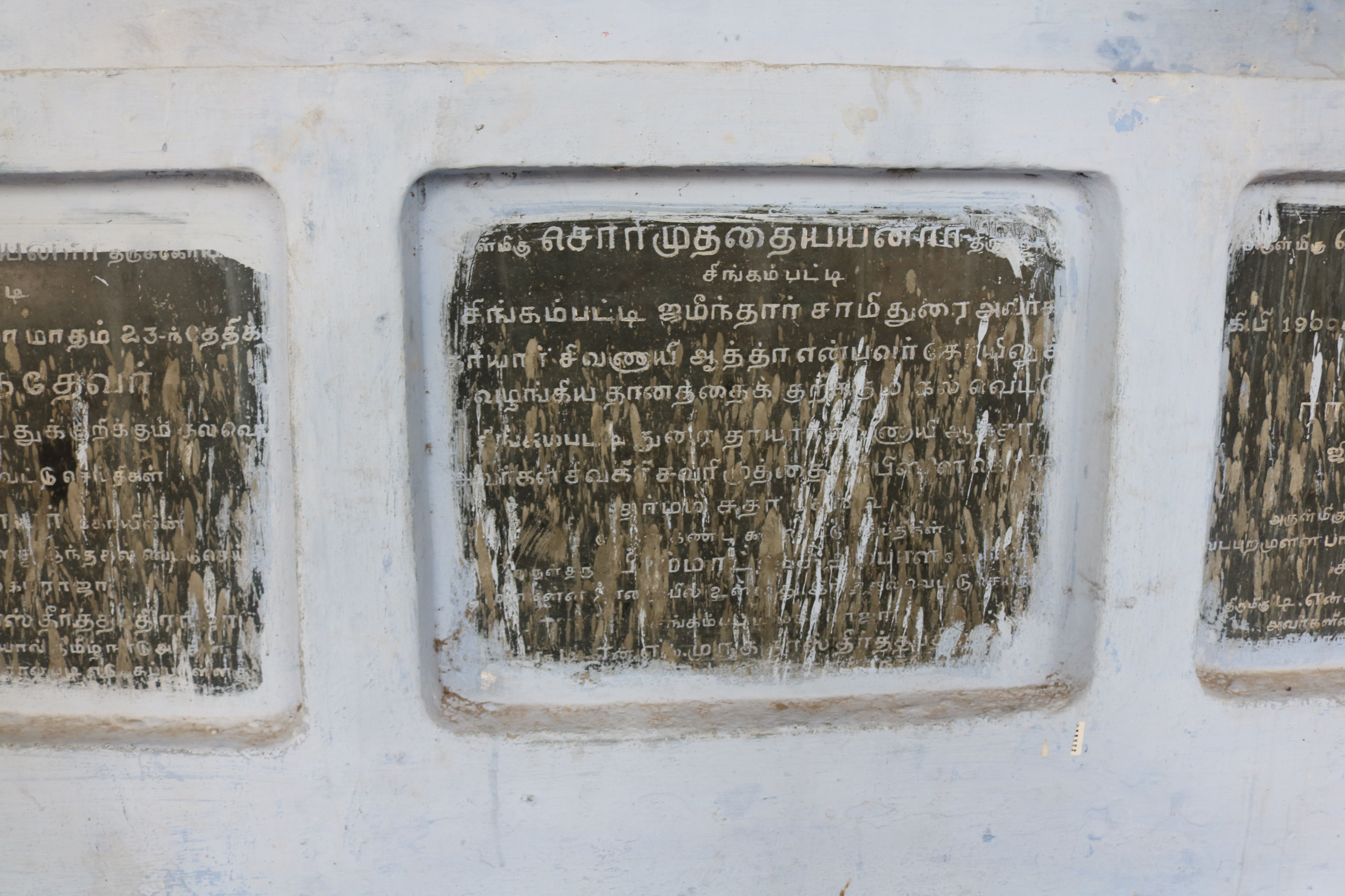 | கல்வெட்டு / செப்பேடு | 1824-ஆம் ஆண்டு சித்திரை மாதம் 23-ந்தேதி பெரியசாமி தேவர் என்பவரால் சத்திரம் ஒன்று இக்கோயிலில் கட்டப்பட்டது என்பதை கல்வெட்டொன்று தெரிவிக்கிறது. சிங்கம்பட்டி ஜமீன்தார் சாமிதுரை அவர்கள் தாயார் சிவணாயி ஆத்தா அவர்கள் சொரிமுத்து அய்யனார் கோயிலுக்கு அளித்த கொடையைக் குறிக்கும் கல்வெட்டு உள்ளது. 1900-ஆம் ஆண்டு ஆனி மாதம் 30-ந்தேதி பௌர்ணமியன்று ராமலிங்க சுவாமிகள் ஜீவ சமாதியான செய்தியைக் குறிப்பிடும் கல்வெட்டு ஒன்று உள்ளது. 1932-ஆம் ஆண்டு கோயிலில் மாட்டப்பட்ட மணி மீண்டும் 1950-ஆம் ஆண்டு பிச்சாண்டி ஆசாரி என்பவரால் மீண்டும் வார்த்து மாட்டப்பட்டது என்னும் செய்தியை கல்வெட்டொன்று குறிப்பிடுகிறது. |