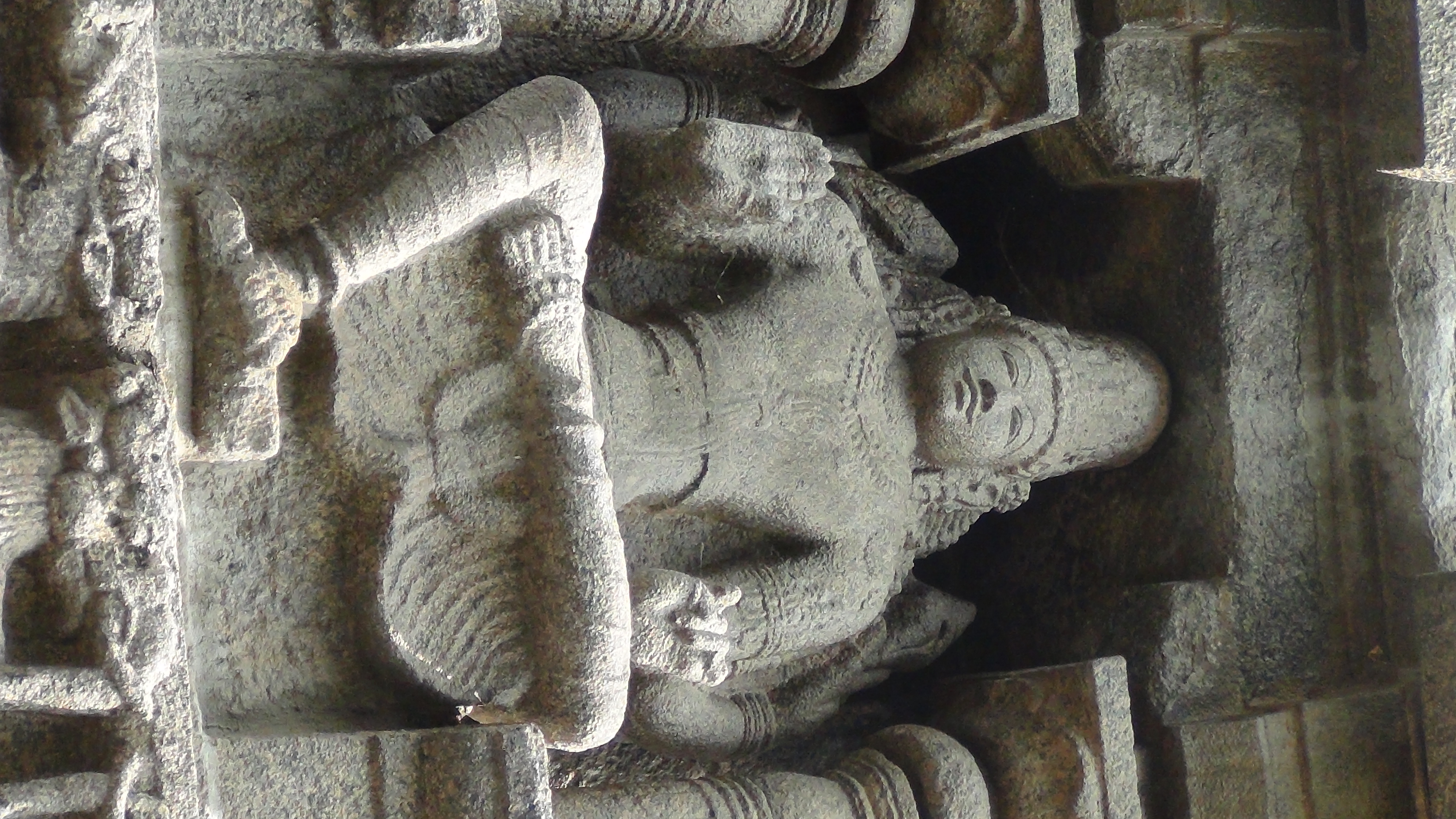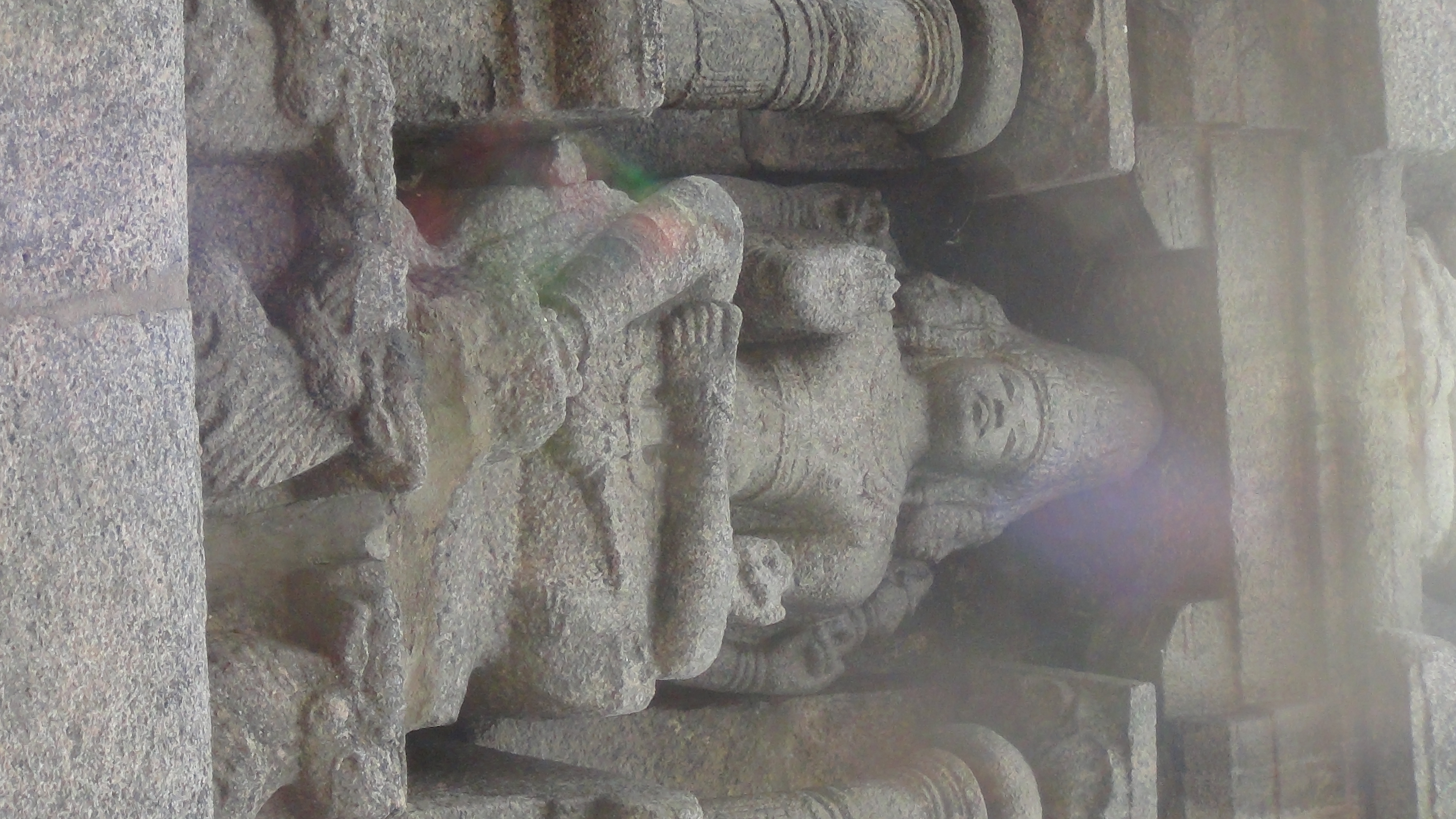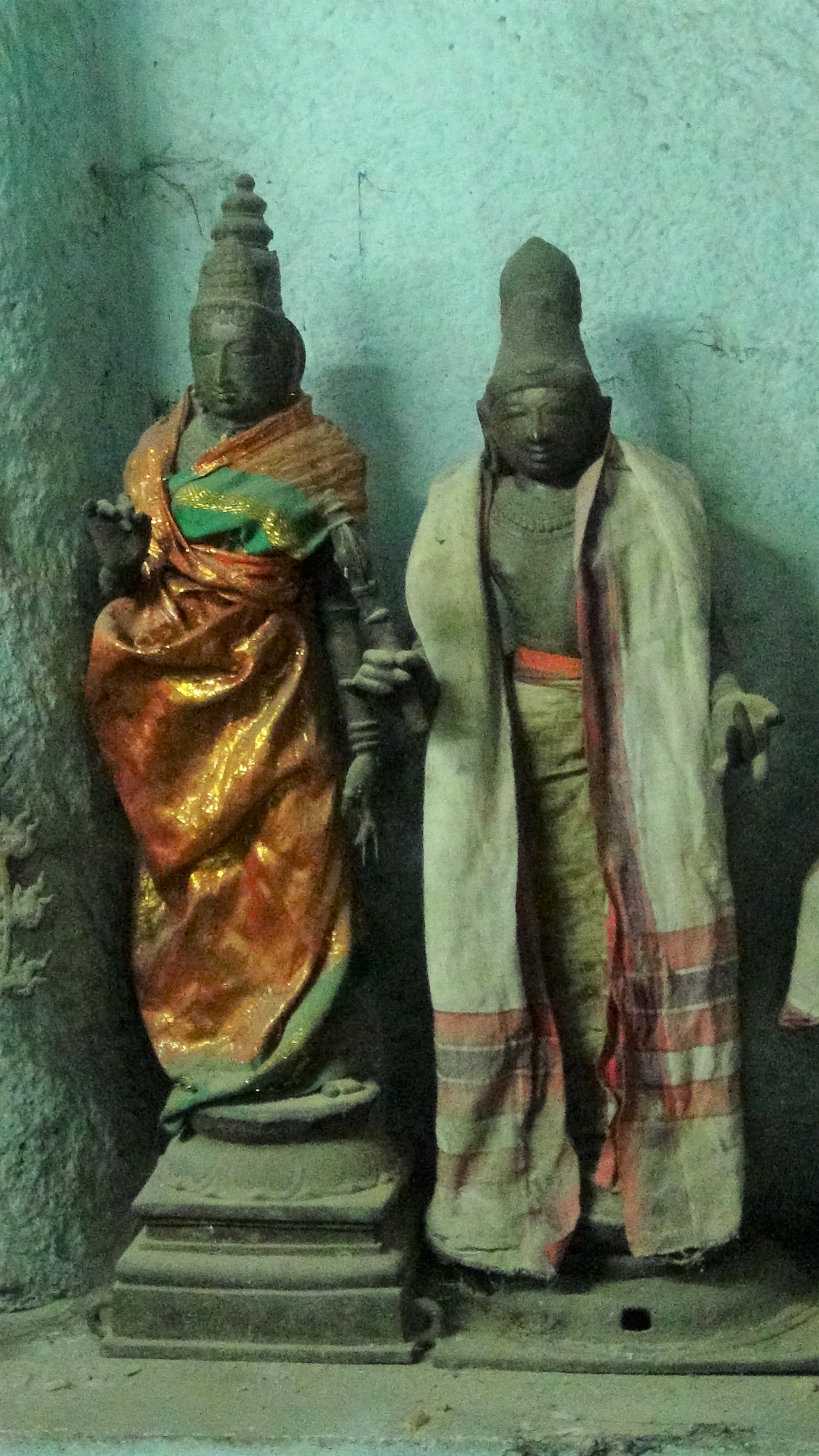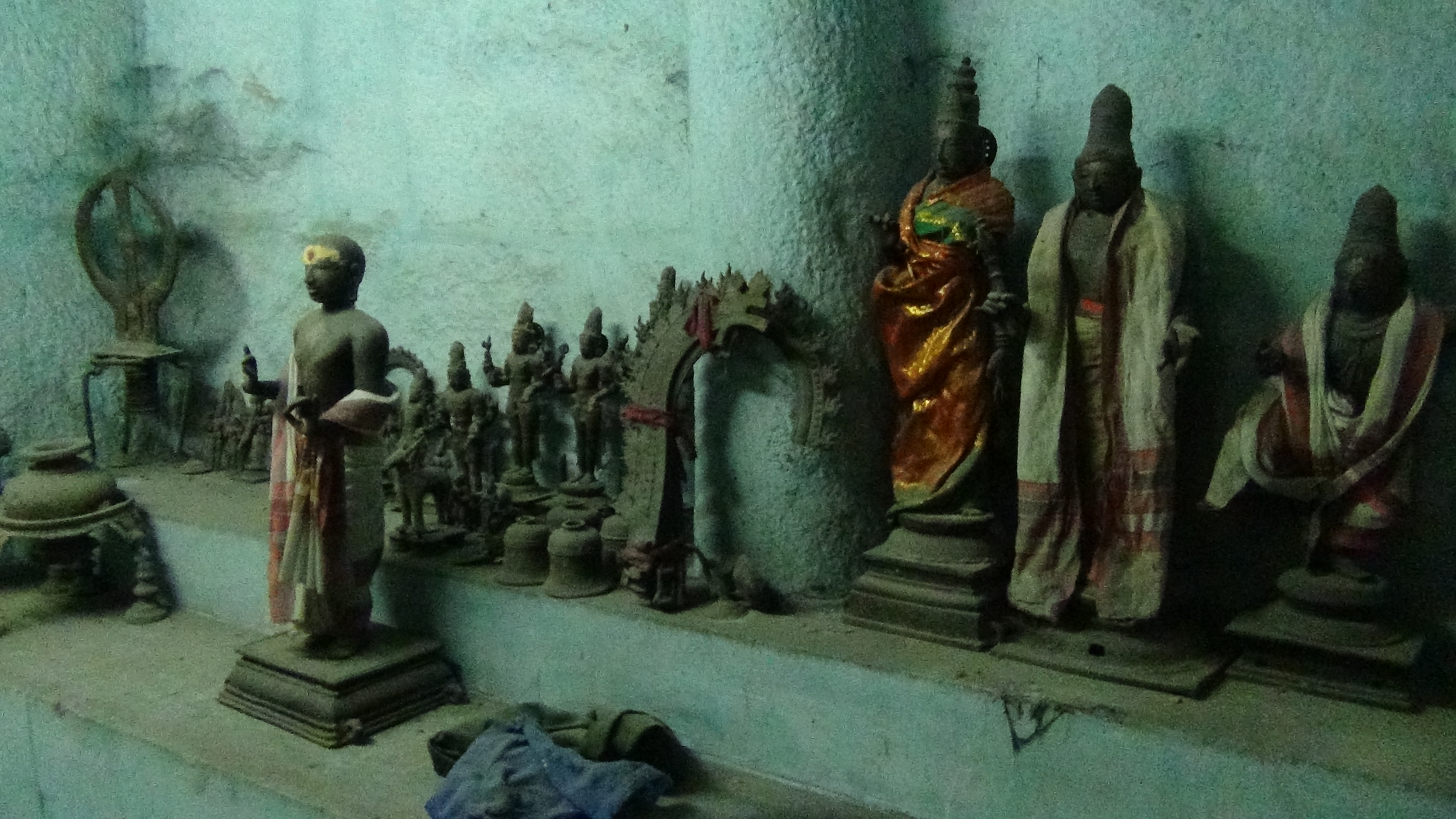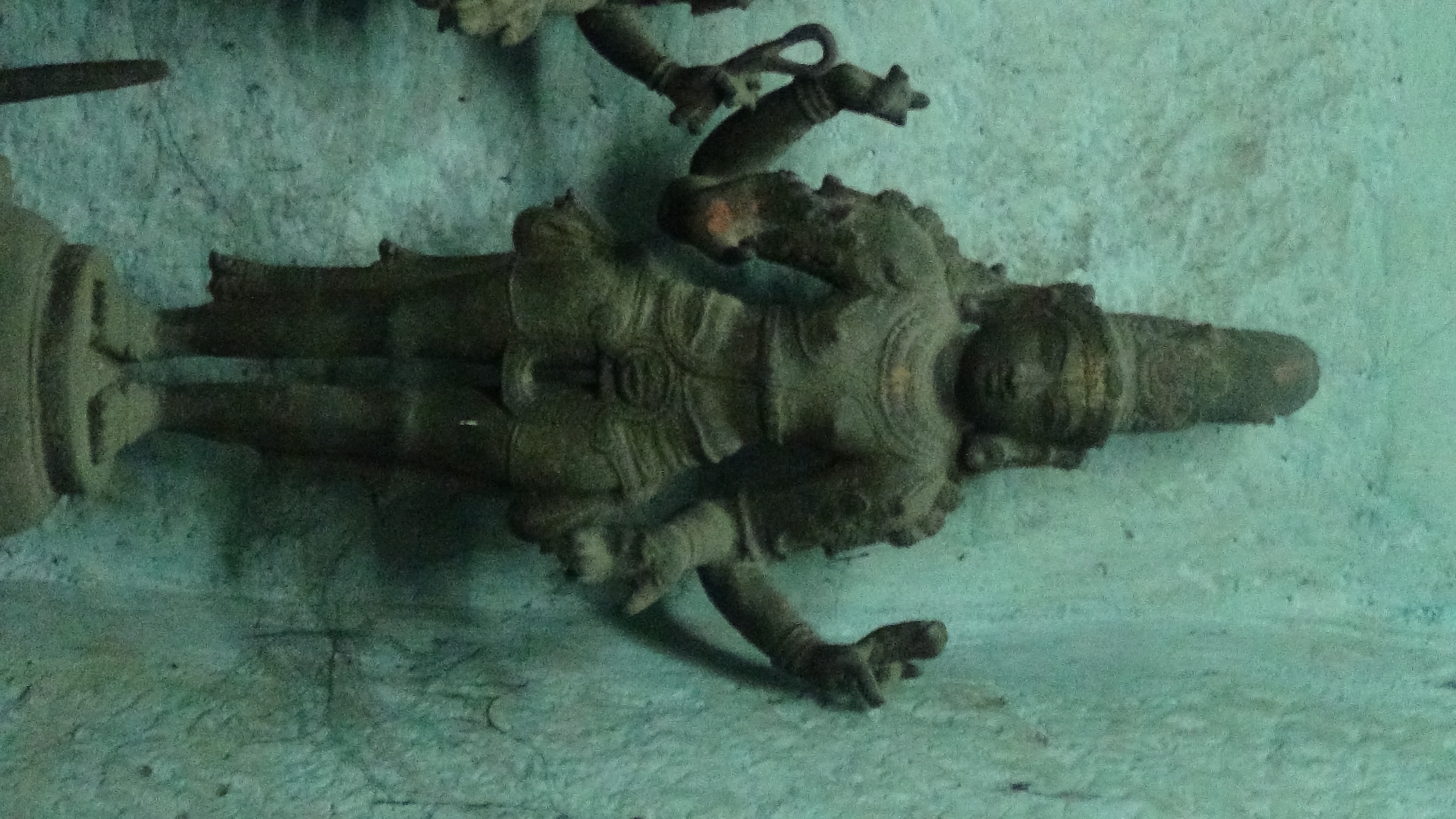 | சிற்பங்கள் | தெற்குப்புறத்தில் தளம் கோட்டத்தில் வீணாதர தட்சிணாமூர்த்தி அமர்ந்த நிலையில் உள்ளார். மேற்குப்புறத்தில் தளம் கோட்டத்தில் திருமால் அமர்ந்த நிலையில் உள்ளார். வடக்கு தளம் கோட்டத்தில் நான்முகன் அமர்ந்த நிலையில் காணப்படுகின்றார். தேவகோட்டங்களில் மேற்கில் திருமாலும், வடக்கில் நான்முகனும் உள்ளனர். அர்த்தமண்டப தென்புறக் கோட்டத்தில் கணபதியும், வடபுறத்தில் விஷ்ணுதுர்க்கையும் அமைந்துள்ளனர். 23-க்கு அதிகமான செப்புத் திருமேனிகள் இக்கோயிலில் அகழ்ந்தெடுக்கப்பட்டு காட்சிக்கு வைக்கப்பட்டுள்ளன. இவை யாவும் இராஜேந்திர சோழன் காலத்தவை. அவற்றுள் பைரவர், கணபதி, துர்க்கை, சிவன், பார்வதி, தூபக்கால் ஆகியன குறிப்பிடத்தக்கன. |