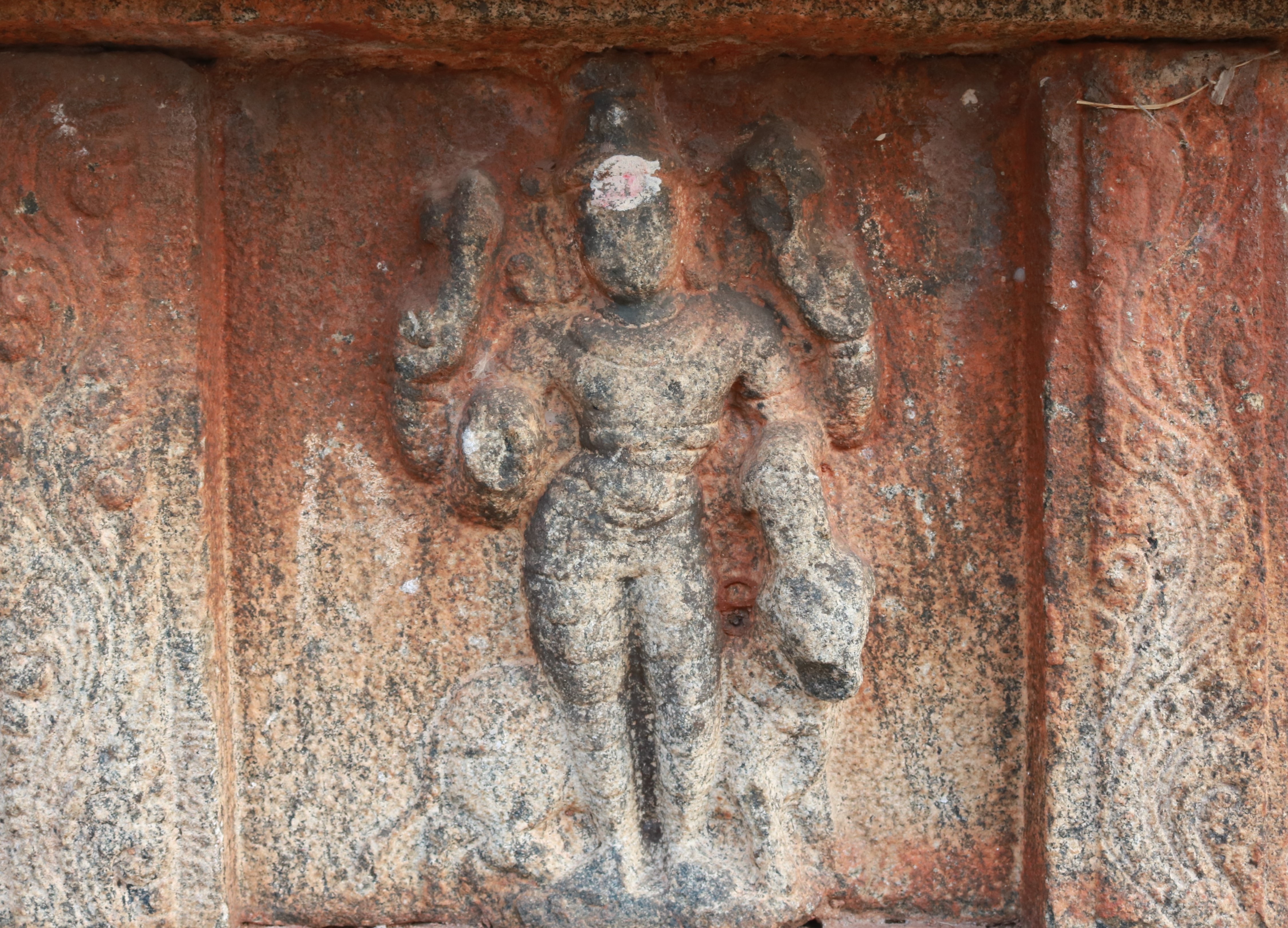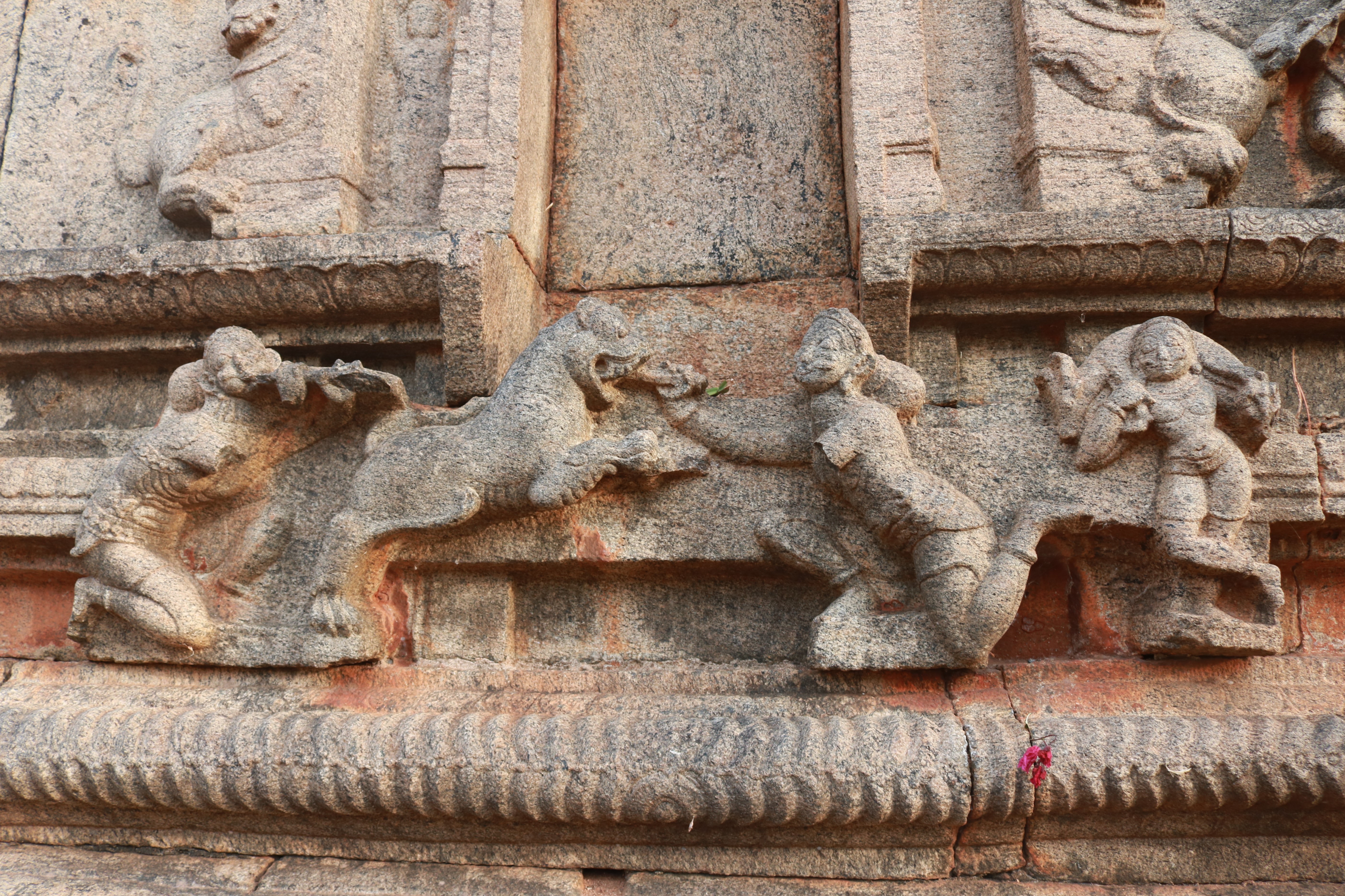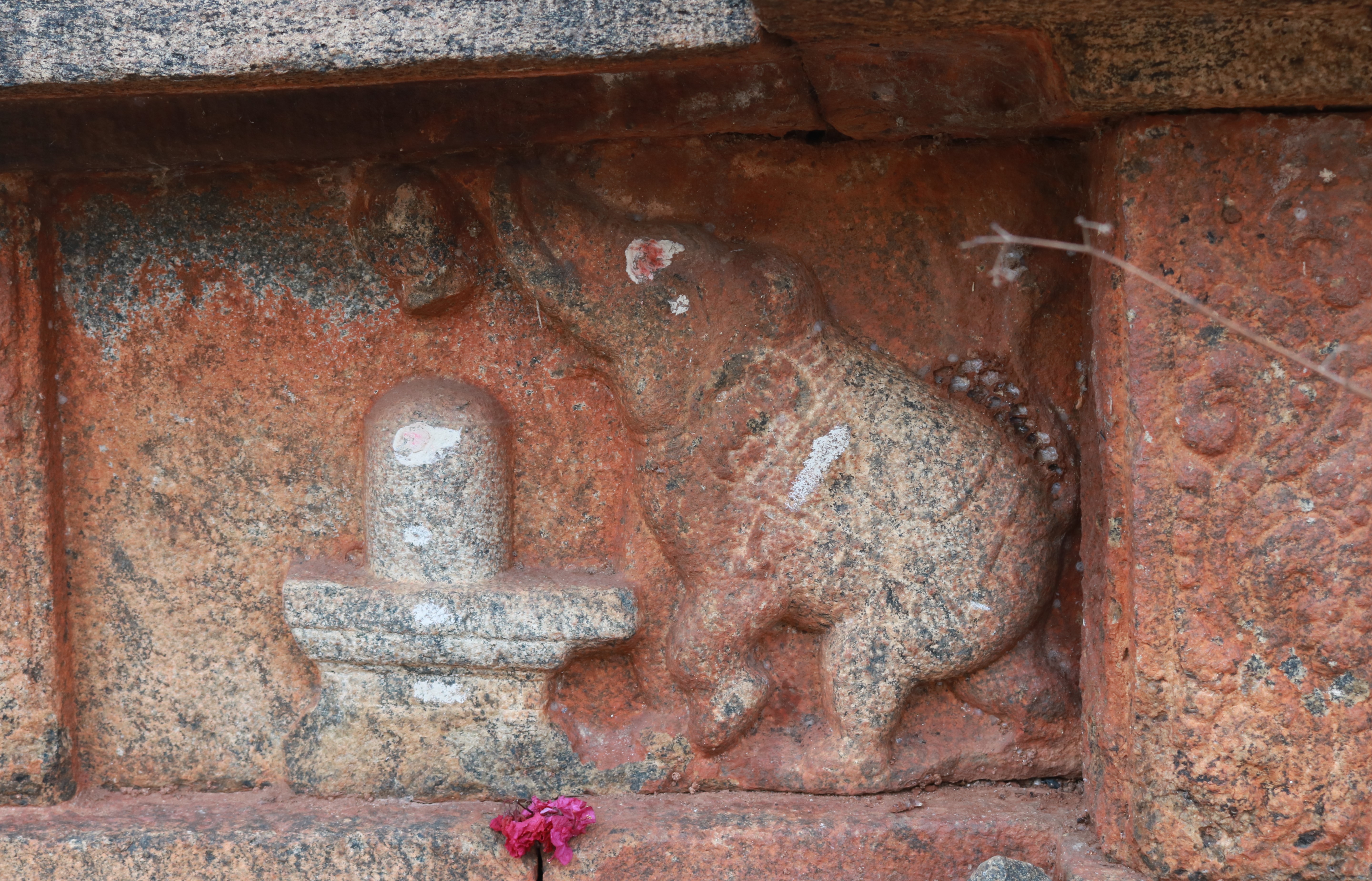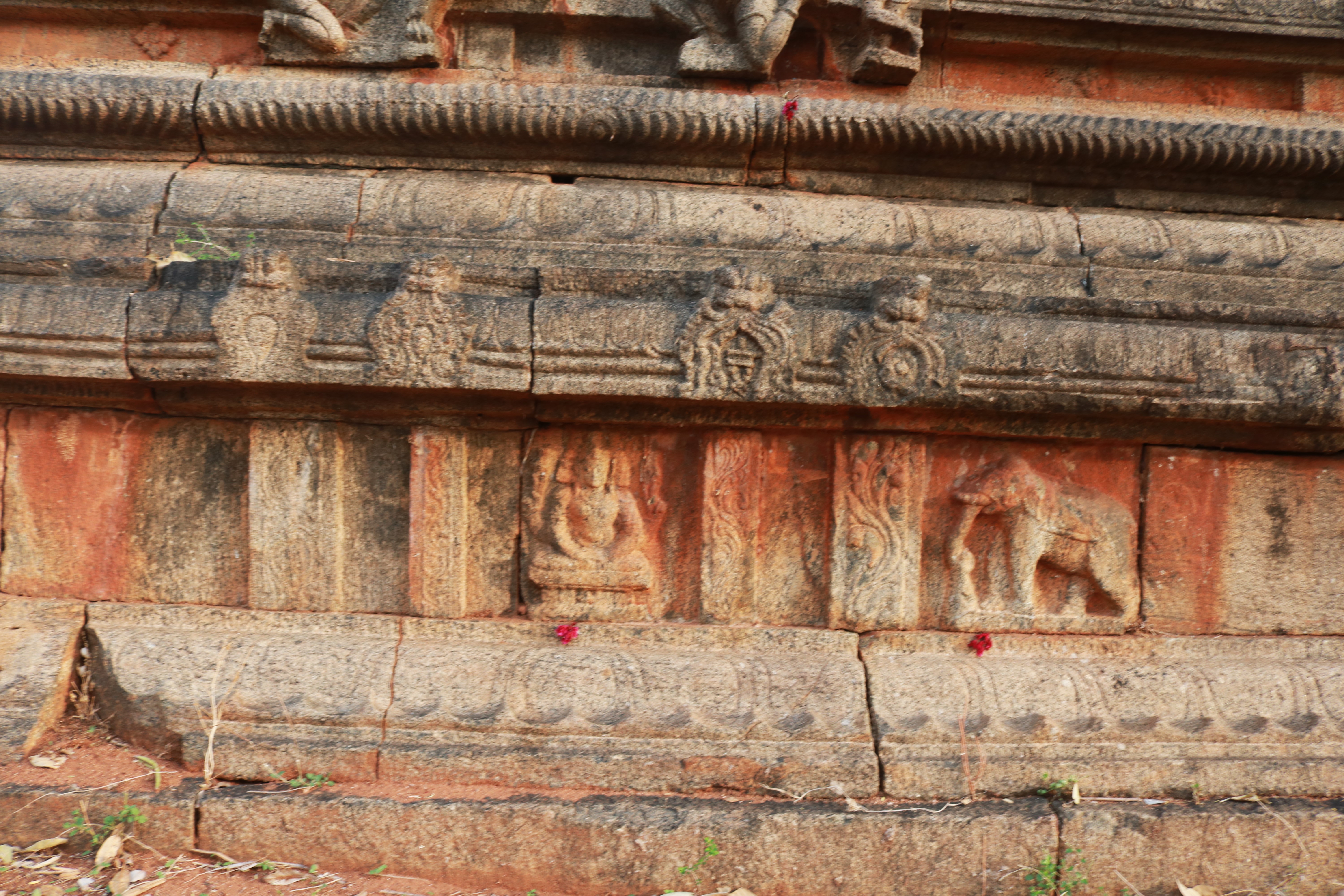 | சிற்பங்கள் | சிவன் கோயிலில் கருவறை புறச் சுவரிலும், அர்த்த மண்டப புறச் சுவரிலும் புடைப்புச் சிற்பங்கள் அமைந்துள்ளன. கிழக்கில் விநாயகர், மயில் மேல் அமர்ந்த முருகன், தெற்கில் கால் மாறி ஆடிய நடராஜர், காளி, மோகினி, ஆனையுரித்த பிரான் ஆகிய சிற்பங்கள் அமைந்துள்ளன. மேற்கில் அக்னி வீரபத்திரரும், அகோர வீரபத்திரரும் உள்ளனர். வடக்கில் காளி, பிட்சாடனர், வீரப் பெண், விஷ்ணு ஆகிய சிற்பங்களும், தாங்குதளத்தில் சிங்கத்துடன் விளையாடும் வீரன் உருவமும், கன்றினை தோளில் போட்டுக் கொண்டு நிற்கும் வீரன் உருவமும், குட்டியை அடிவயிற்றில் தாங்கும் குரங்கும் அமைந்துள்ளன. அம்மன் கோயிலில் வீரபத்திரர், கண்ணப்பர், இலிங்கத்தை வழிபடும் பசு, தேவி, இடபாரூடர், தவம் செய்யும முனிவர், அடியவர், பாம்பாட்டி, மோகினி, விஷ்ணு, திருவரங்கன், இலிங்க பூசை செய்யும் யானை, காளிங்க நர்த்தனம், வாலி-சுக்ரீவன் சண்டை ஆகிய புடைப்புச் சிற்பங்கள் கருவறை புறச் சுவரிலும், அர்த்த மண்டப புறச் சுவரிலும் அமைந்துள்ளன. |