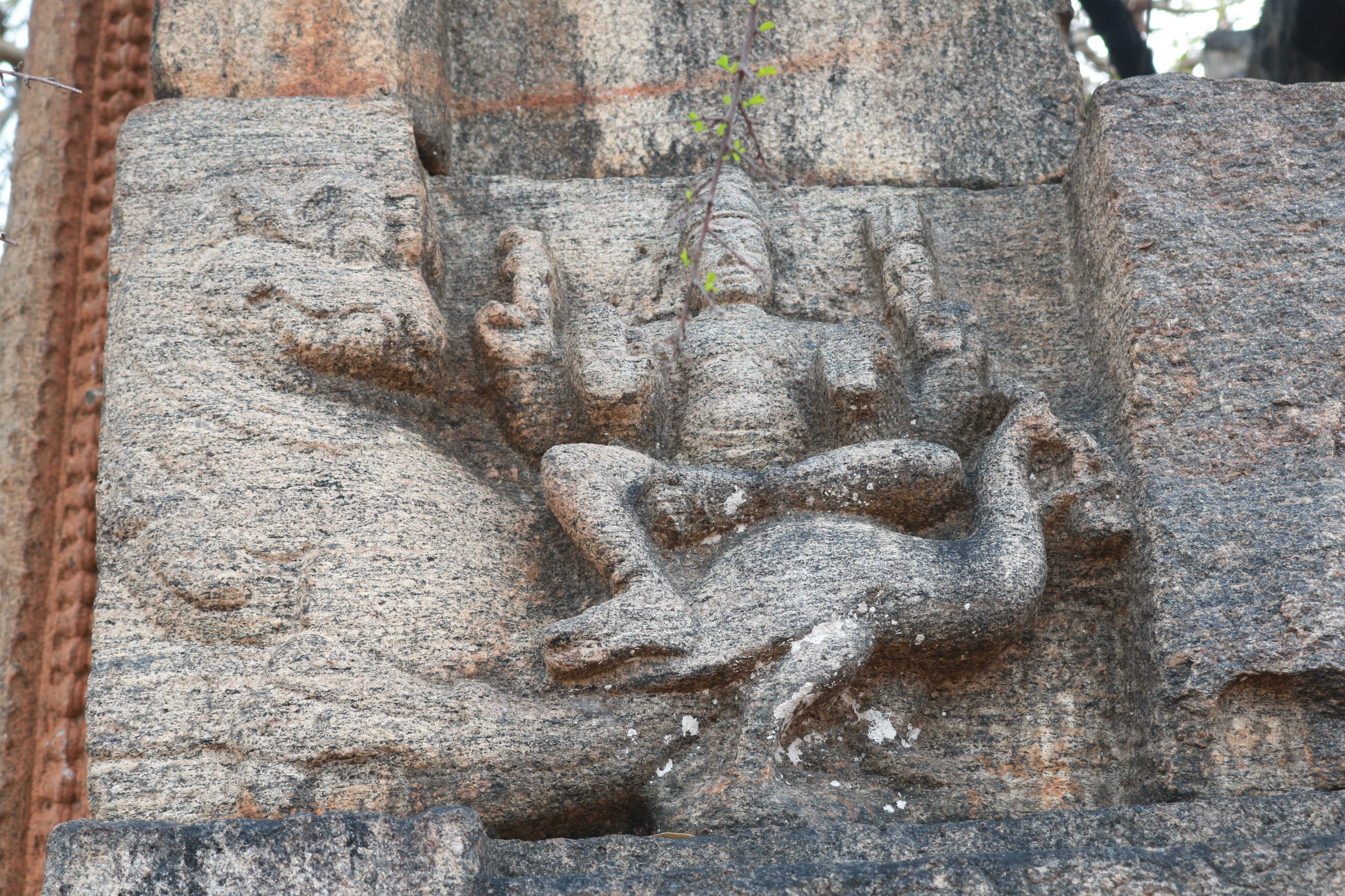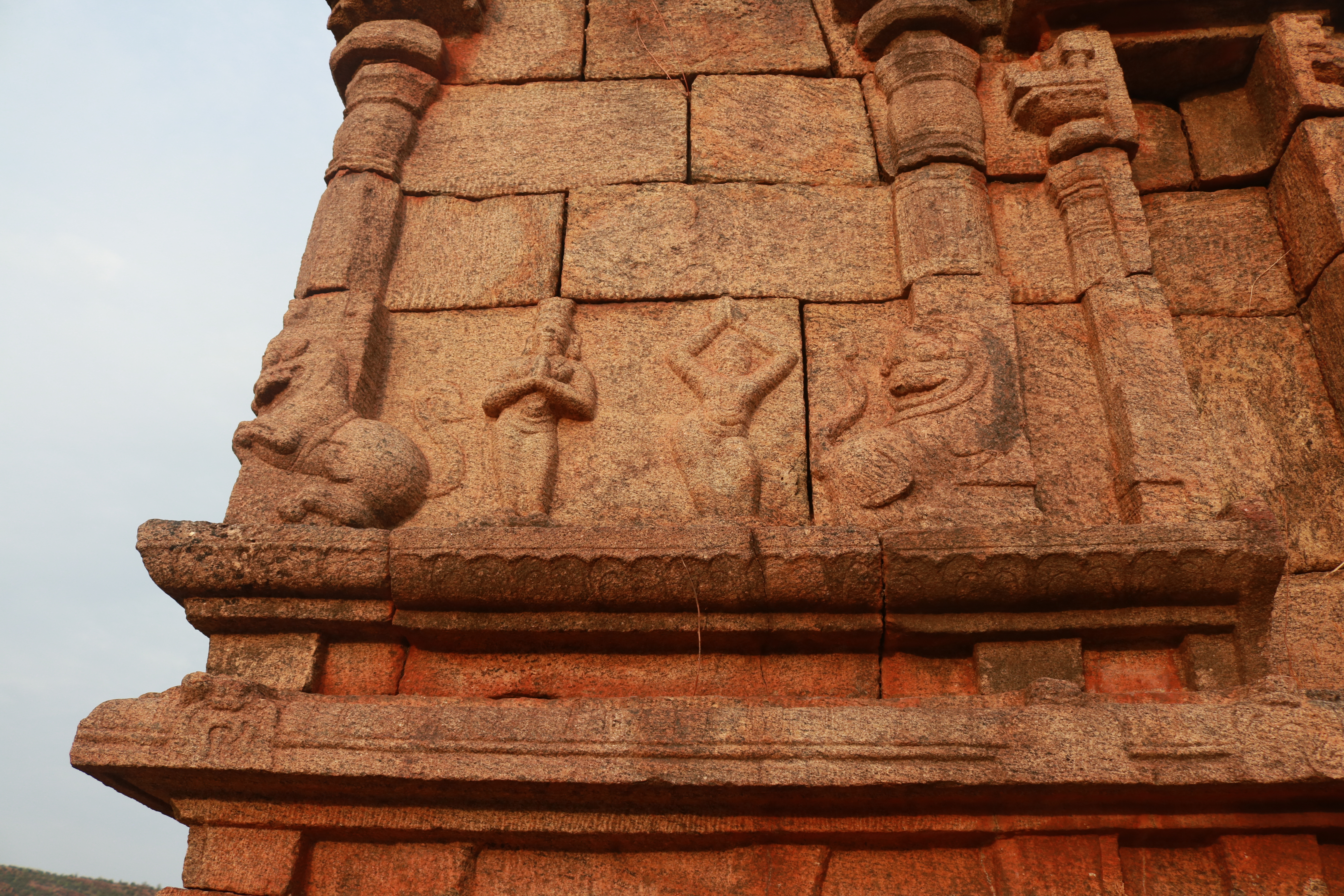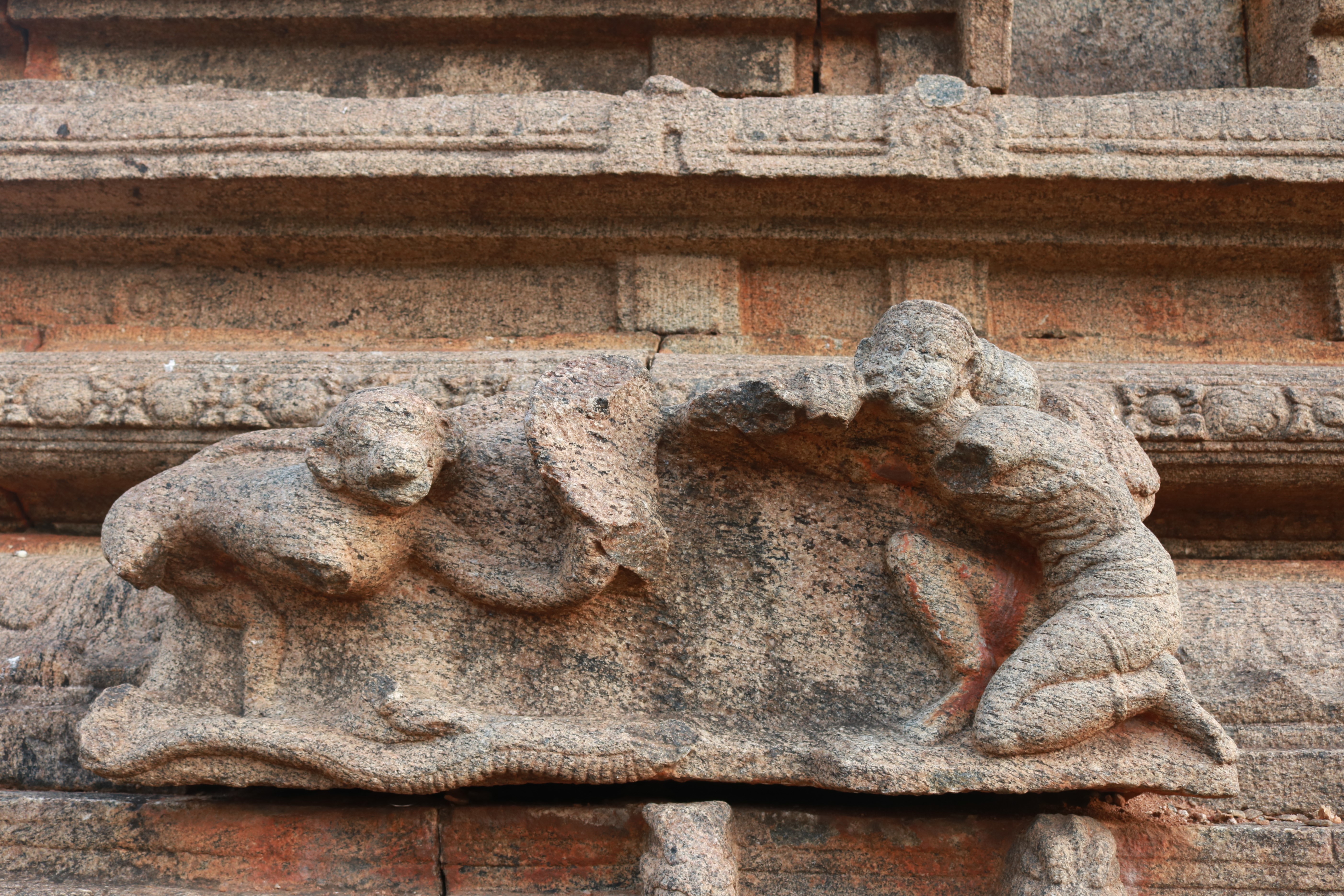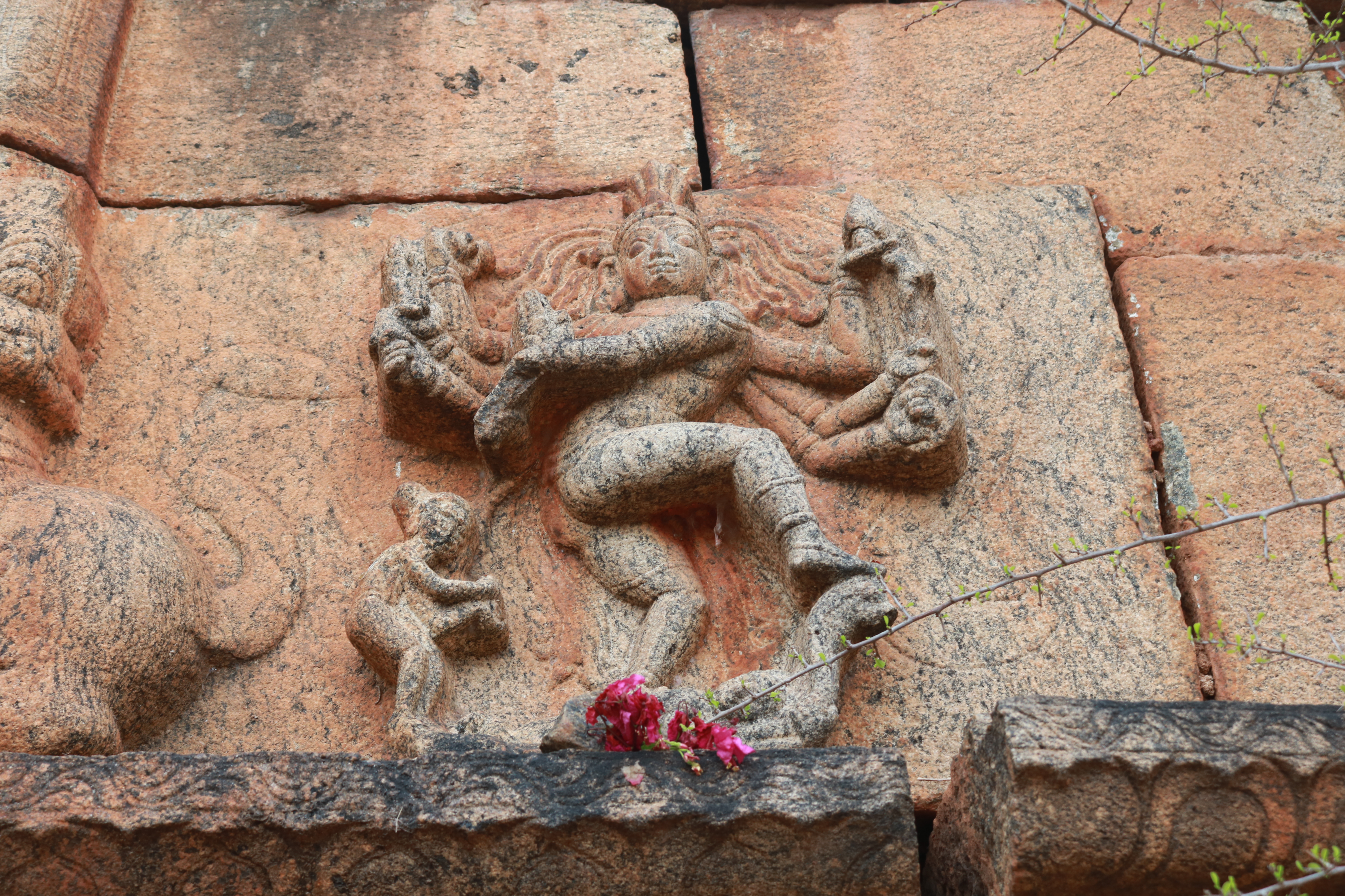 | சிற்பங்கள் | சிவன் கோயிலில் கருவறை புறச் சுவரிலும், அர்த்த மண்டப புறச் சுவரிலும் புடைப்புச் சிற்பங்கள் அமைந்துள்ளன. கிழக்கில் விநாயகர், மயில் மேல் அமர்ந்த முருகன், தெற்கில் கால் மாறி ஆடிய நடராஜர், காளி, மோகினி, ஆனையுரித்த பிரான் ஆகிய சிற்பங்கள் அமைந்துள்ளன. மேற்கில் அக்னி வீரபத்திரரும், அகோர வீரபத்திரரும் உள்ளனர். வடக்கில் காளி, பிட்சாடனர், வீரப் பெண், விஷ்ணு ஆகிய சிற்பங்களும், தாங்குதளத்தில் சிங்கத்துடன் விளையாடும் வீரன் உருவமும், கன்றினை தோளில் போட்டுக் கொண்டு நிற்கும் வீரன் உருவமும், குட்டியை அடிவயிற்றில் தாங்கும் குரங்கும் அமைந்துள்ளன. அம்மன் கோயிலில் வீரபத்திரர், கண்ணப்பர், இலிங்கத்தை வழிபடும் பசு, தேவி, இடபாரூடர், தவம் செய்யும முனிவர், அடியவர், பாம்பாட்டி, மோகினி, விஷ்ணு, திருவரங்கன், இலிங்க பூசை செய்யும் யானை, காளிங்க நர்த்தனம், வாலி-சுக்ரீவன் சண்டை ஆகிய புடைப்புச் சிற்பங்கள் கருவறை புறச் சுவரிலும், அர்த்த மண்டப புறச் சுவரிலும் அமைந்துள்ளன. |