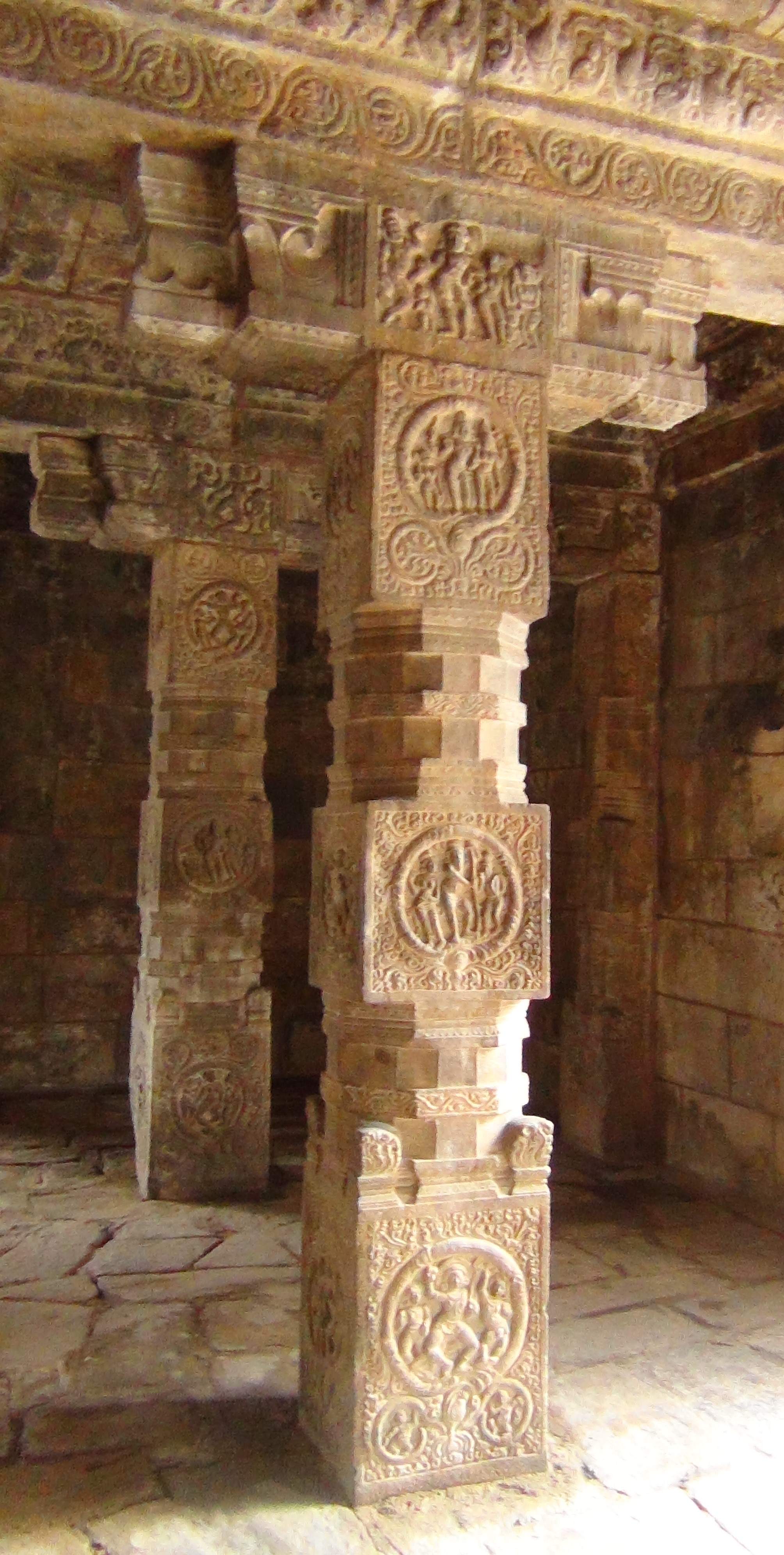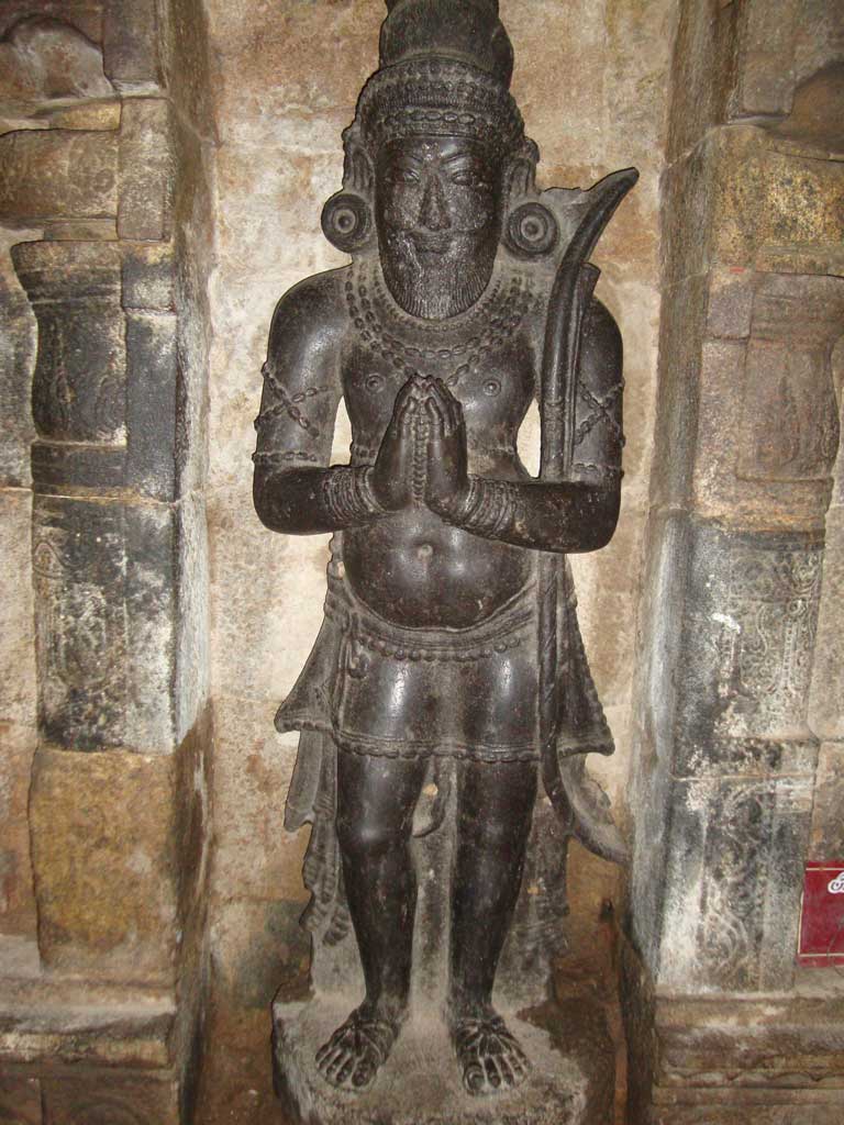 சிற்பங்கள் | கோயிலின் மகாமண்டபத்தின் தூண்கள் ஒவ்வொன்றிலும் நான்கு புறங்களிலும் பல புராணக் கதைகள் பொதுவாக சிவபுராணக் கதைகள் சிற்பங்களாக வடிக்கப்பட்டுள்ளன. மகாமண்டபத்தின் நுழைவாயிலில் காணப்படும் கண்ணப்ப நாயனார் மெல்லிய செருப்பு அணிந்திருக்கிறார். கருவறையில் நுழைவாயிலின் இருபுறமும் துவாரபாலகர்கள் காணப்படுகின்றனர். கையில் வீணையில்லாத சரஸ்வதி, பாம்புகளுக்கு அரசனான நாகராஜன், அன்னபூரணி, கண்ணப்பர் போன்ற சிற்பங்கள் இங்கு அமைக்கப்பட்டுள்ளன. கோயிலின் வெளிச் சுவர்களில் மூன்றுமுகங்கள், எட்டுகைகளுடன் அர்த்தநாரீஸ்வரர், மேல்கரங்களில் சிவனுக்குரிய மானும், மழுவும், கீழ்கரங்களில் அழகான புல்லாங்குழல் ஏந்திய சிவன், சிவனும் குழலூதும் கண்ணனும் இணைந்த சிற்பம் எனப் பல சிற்பங்களும் உண்டு. குழலூதும் சிவன் இங்கு மட்டுமே காணப்படும் அரிய சிற்பம் என்று சரித்திர ஆய்வாளரான குடவாயில் சுப்ரமணியம் கண்டறிந்துள்ளார். மண்டபத்தின் மேல் பிரகாரத்தில் நாயன்மார்கள், 108 சிவனடியார்களின் உருவங்கள் ஆகியவை ராஜகம்பீரம் என்று அழைக்கப்படும் மகா மண்டபம் ஐராவதம் எனப்படும் யானைகளாலும் குதிரைகளாலும் இழுத்துச் செல்லப்படுவது போல் அமைக்கப்பட்டுள்ளது . குதிரைகள், யானைகள் பூட்டப்பட்ட ரதத்தின் அமைப்பில் இருக்கும் மண்டபம், நுணுக்கமான பல சிற்பங்களுடன் கூடிய தூண்களால் நிறைந்தது. தூண்களில் நர்த்தன கணபதியின் உள்ளங்கை அகல சிற்பம் உள்ளது. நடன முத்திரைகள் காட்டும் ஆடல் மகளிர் சிற்பங்களும், இசைக் கலைஞர்களின் குழுக்களும், புராணக் கதைகளும் சில சென்டிமீட்டர் அளவிலேயே மிகவும் தெளிவாகச் செதுக்கப்பட்டுள்ளன. கருவறை, மற்றும் மண்டபங்களின் புறச்சுவர்ப் பகுதியில் உள்ள வேதிகை கண்டப்படையில் 63 நாயன்மார்களின் வரலாற்றைக் கூறும் சிற்பங்கள் புடைப்பு வடிவங்களாக செதுக்கப்பட்டுள்ளன. மேலும் அட்ட திக்கு பாலகர்களின் புடைப்புச் சிற்பங்களும் காணப்படுகின்றன. |