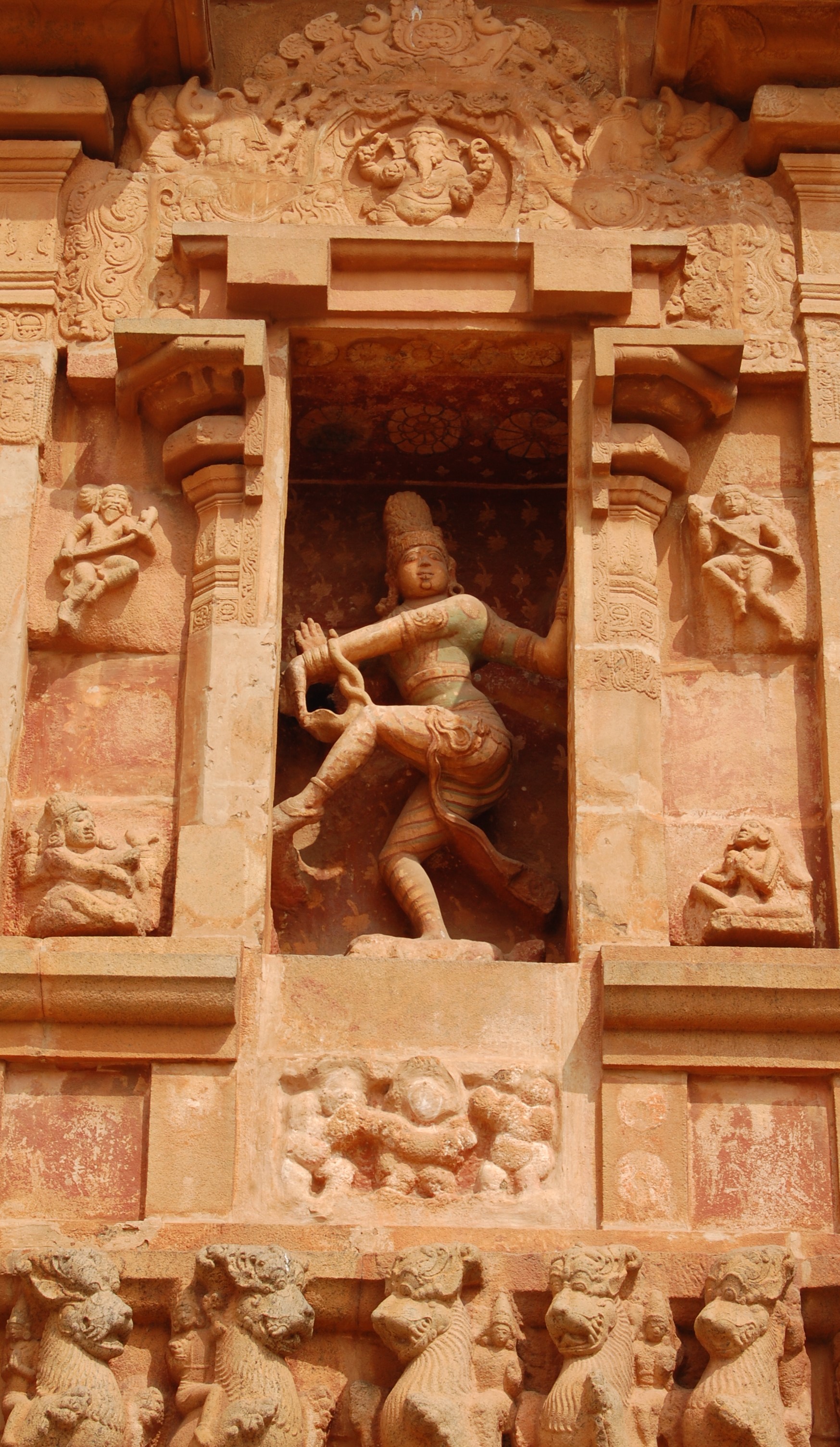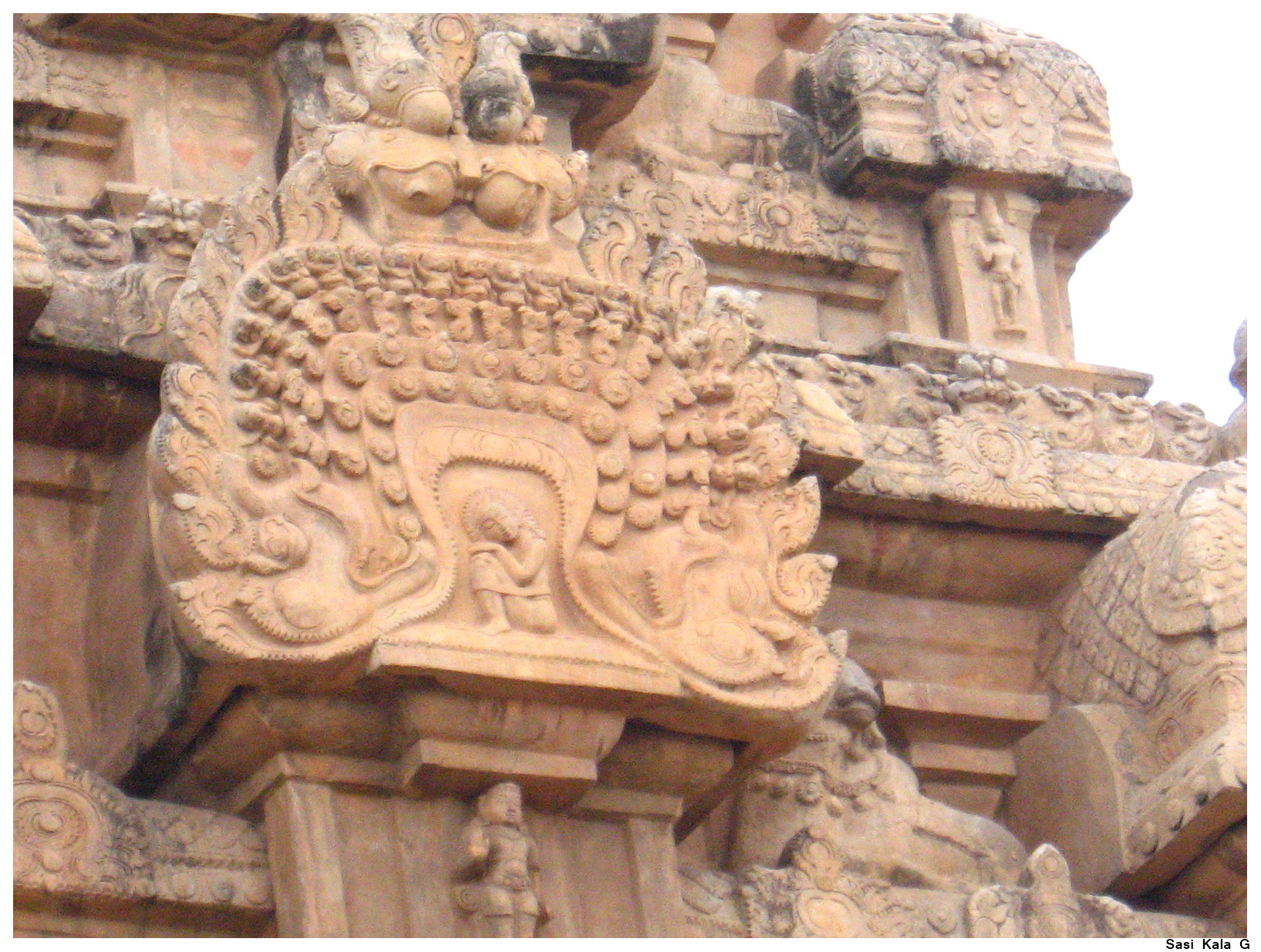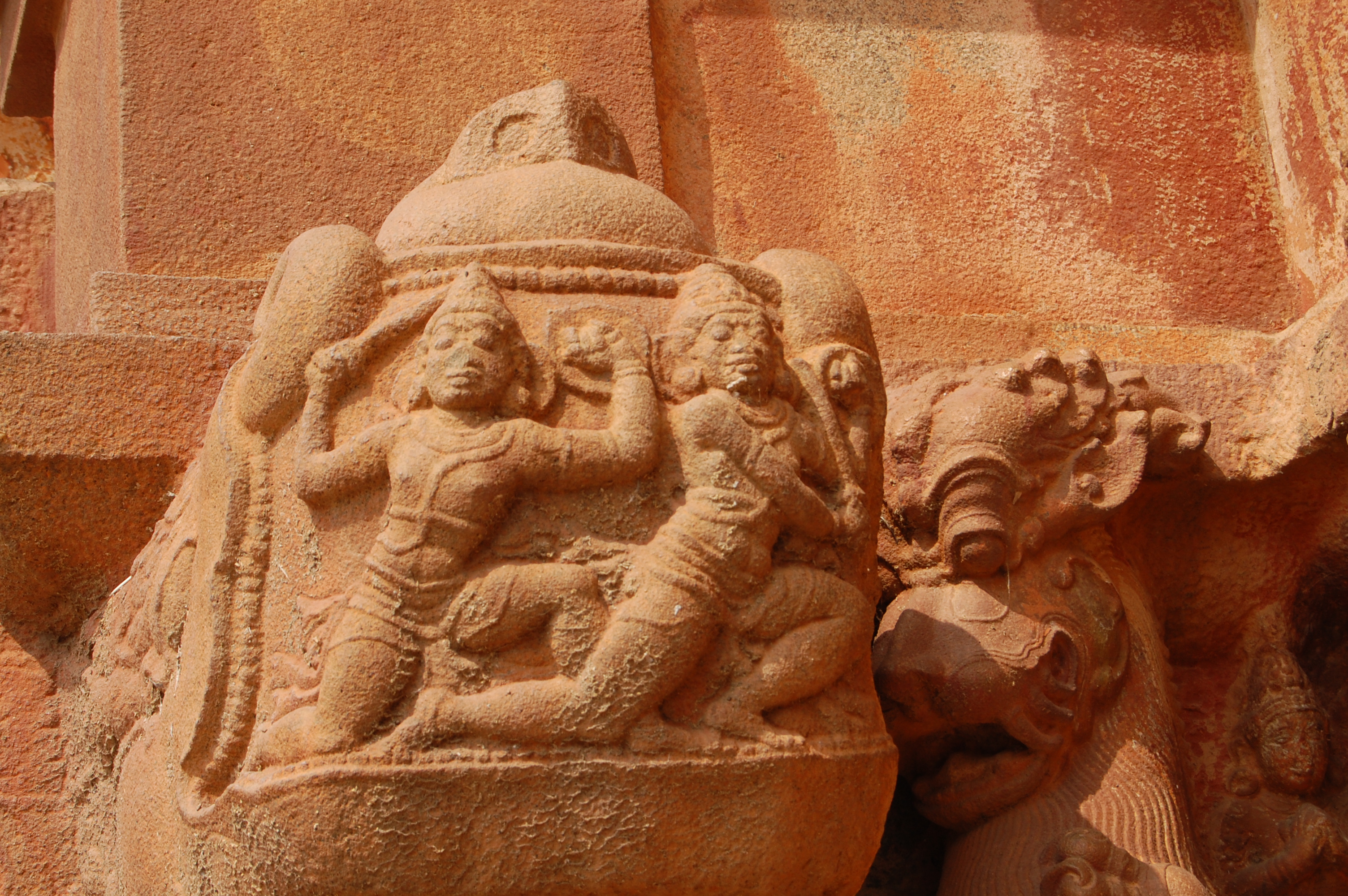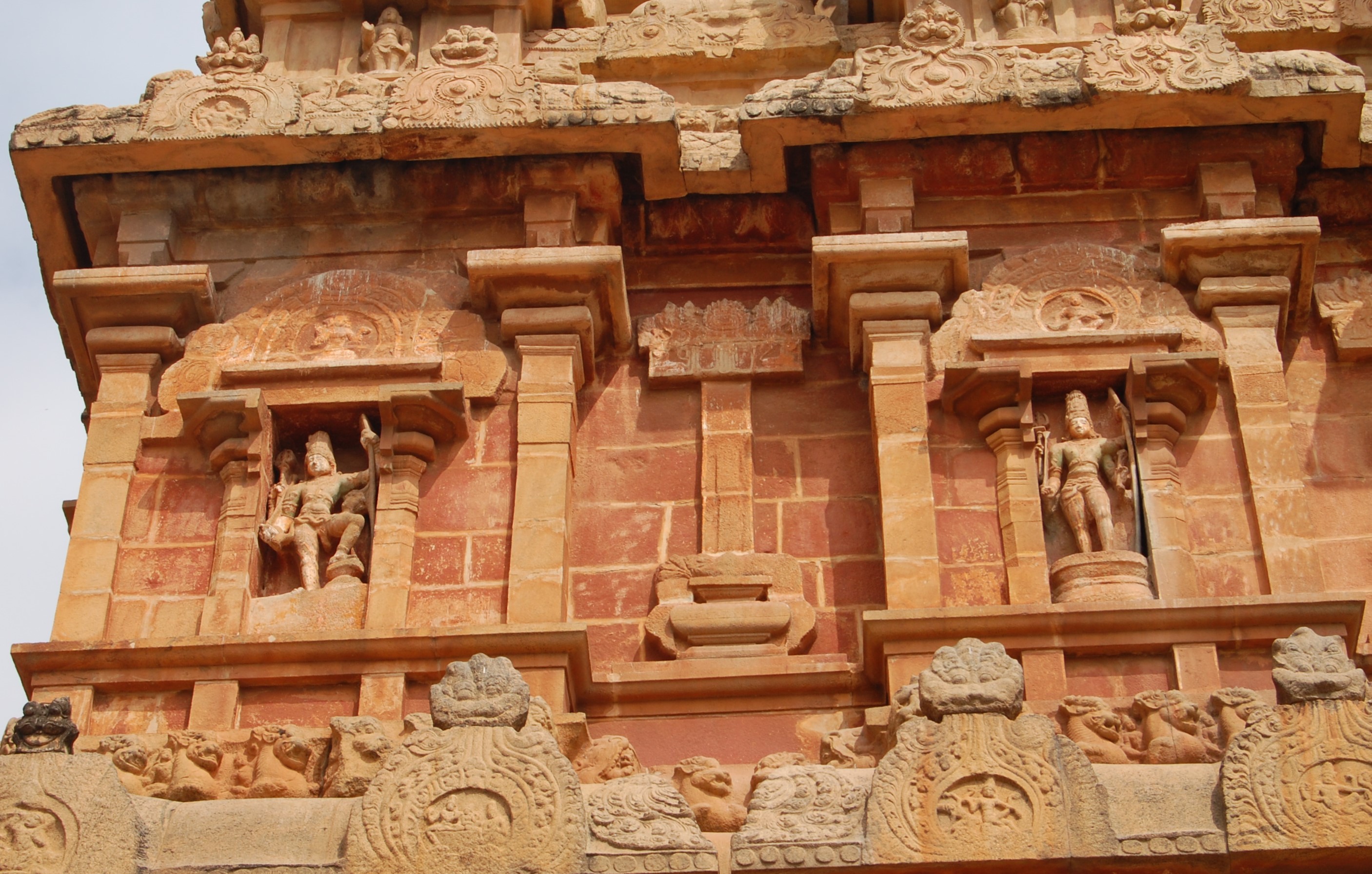 | சிற்பங்கள் | தஞ்சை பெரிய கோயிலில் உள்ள இரண்டு கோபுரங்களான கேரளாந்தகன் திருவாயில், இராஜராஜன் திருவாயில் இரண்டிலும் சிற்பங்கள் இடம் பெற்றுள்ளன. கோபுரத்தின் உட்புறம் அமைந்த புடைவில் இந்திரன், நாகராஜன் ஆகியோருடைய சிற்பங்கள் காணப்படுகின்றன. மேலும் புத்தர் மாயாவாதத்தை அசுரர்க்கு போதிக்கும் காட்சி செவ்வையாக காட்டப்பட்டுள்ளது. கருவறை விமானத்தில் திரிபுராந்தகர் சிற்பங்கள் வரிசையாக அமைந்துள்ளன. மேலும் பெரிய கோயிலில் காணப்படும் யாளி வீரர் சிற்பங்கள் மிகவும் எழில் வாய்ந்தவை. கணபதி, திருமகள், நிலமகளுடன் திருமால், இலிங்கபுராண தேவர், தாமரை மேல் அமர்ந்திருக்கு திருமகள், கபால மூர்த்தி, காலசம்ஹார மூர்த்தி, ஆடல் வல்லான், பிச்சதேவர், சங்கர நாராயணன், சந்திரசேகரர், உமாமகேசுவரர், திரிபுராந்தகர் ஆகிய சிற்பங்கள் கருவறையின் கோட்டச் சிற்பங்களாக அமைந்துள்ளன. பெரிய கோயிலில் அமைந்துள்ள வாயிற்காவலர் சிற்பங்கள் மிகவும் அளவில் பெரியவை. வியக்கத்தக்கவை. கருவறையில் உள்ள சிவலிங்கம் உலகிலேயே மிக பெரியதாகும். ஆறு அடி உயரமும், 54 அடி சுற்றளவும் கொண்ட ஆவுடையார், 13 அடி உயரமும், 23 அரை அடி சுற்றளவும் உள்ள லிங்கம் எனத் தனிதனித் கருங்களனால் செதுக்கப்பட்டு இணைக்கப்பட்டுள்ளது. சிவலிங்கத்தின் உயரம் கருதி கருவறை இரண்டு தளங்களாகக் காட்டப்பட்டுள்ளது. அவற்றுள் ஒரு தளச் சுற்றில் ஆடல்வல்லானின் 108 ஆடல் கரணங்களுள் 88 கரணங்கள் புடைப்புச் சிற்பங்களாக வடிக்கப்பட்டுள்ளன. |