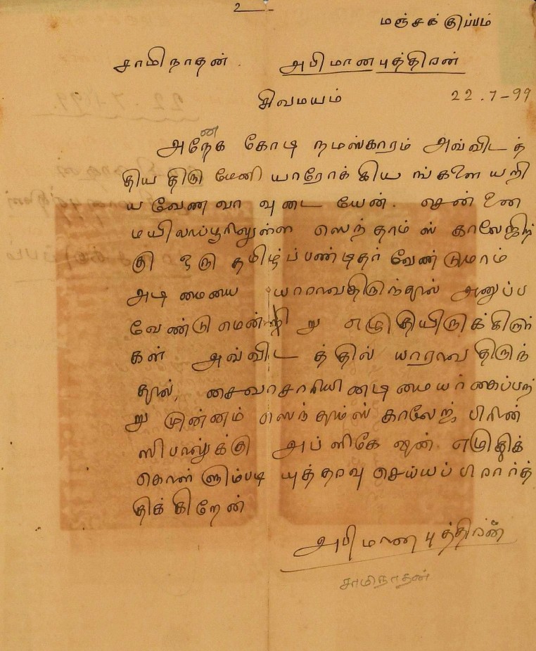 பண்டிதர் பணி நியமனம் : உ.வே.சா. பரிந்துரைத்த பண்டிதருக்குப் பணியமர்த்தம் பற்றிய மடல் பிப்ரவரி 8, 1889