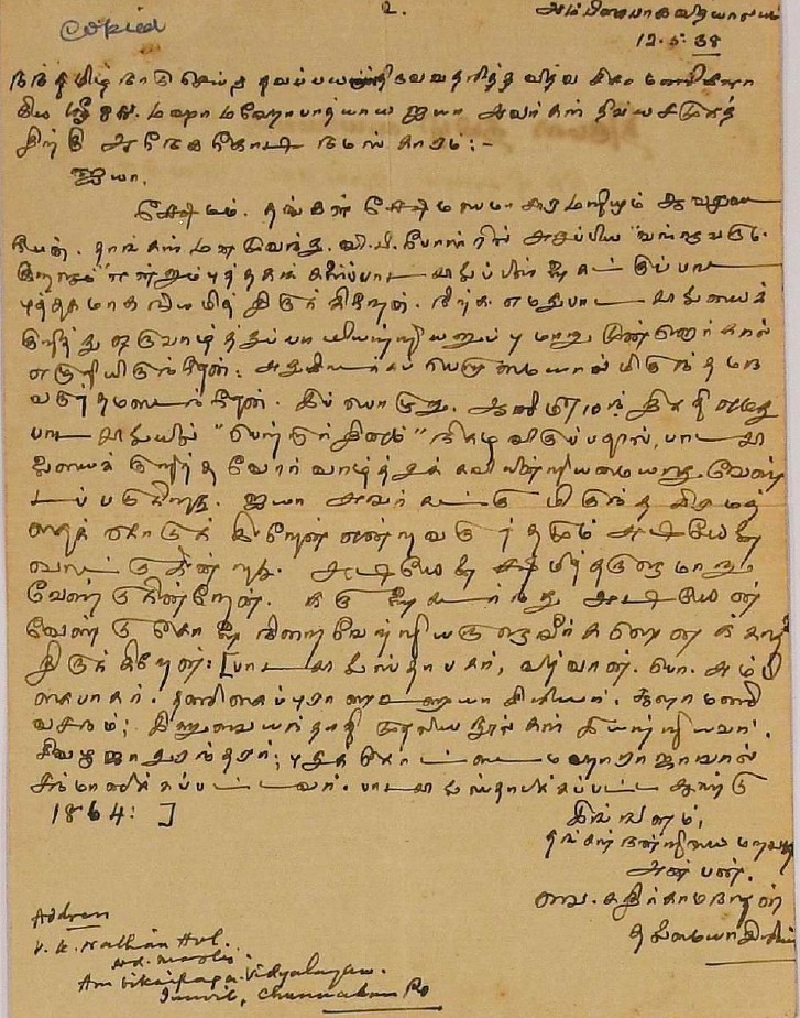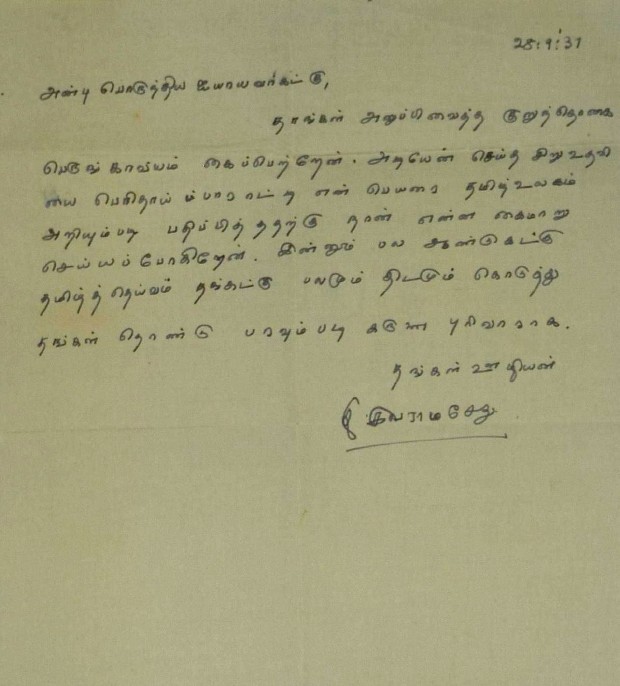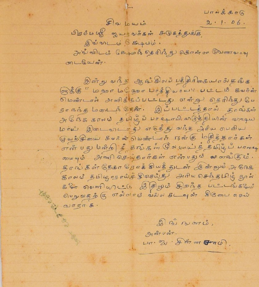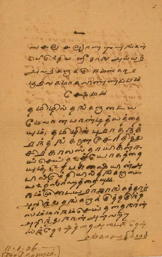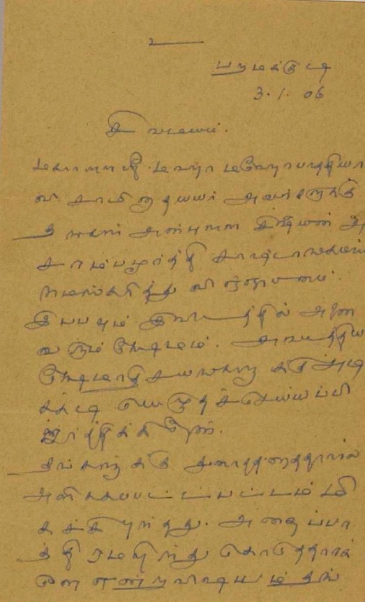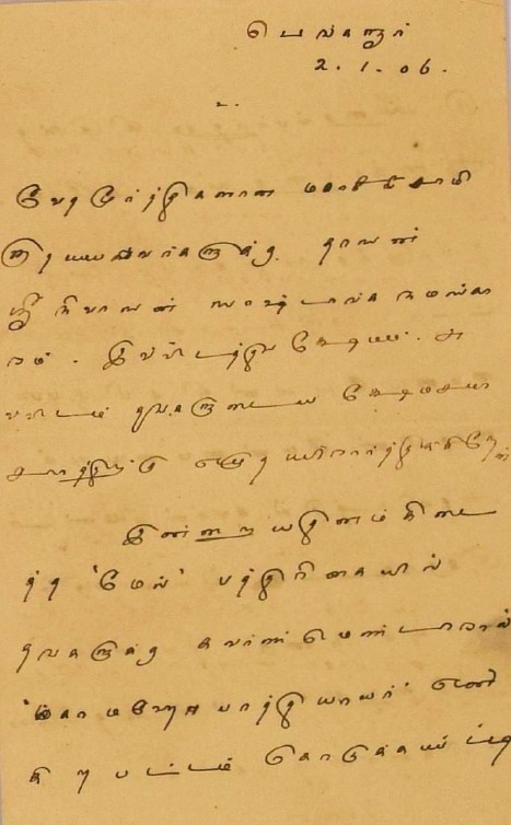 வாழ்த்து மடல் : மகாமகோபாத்தியாய விருது பெற்றதற்குப் பாராட்டு சனவரி 6, 1906