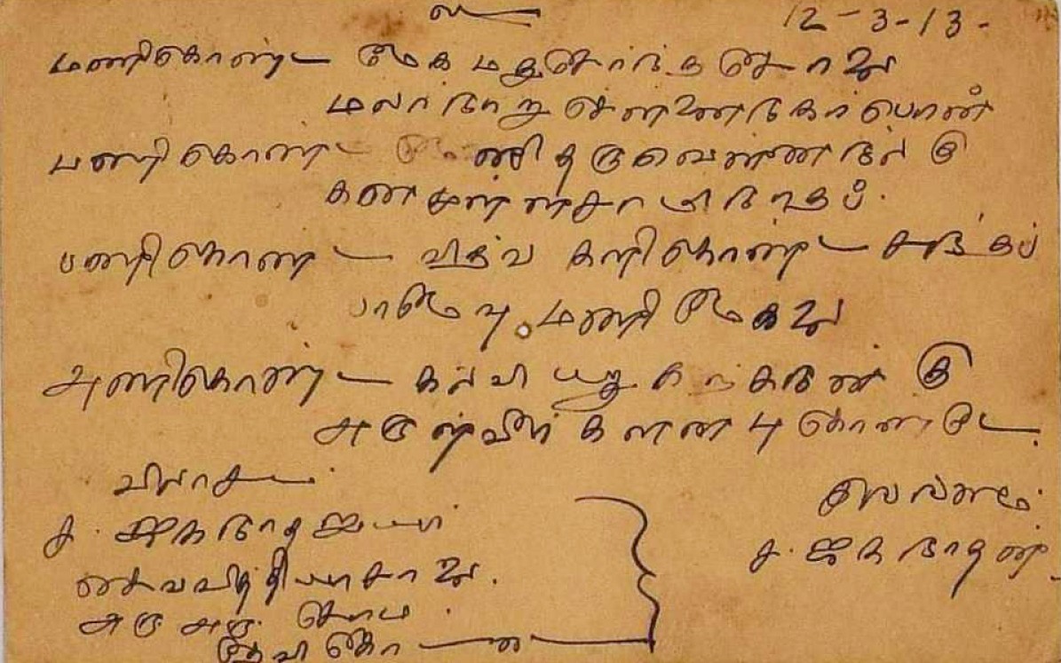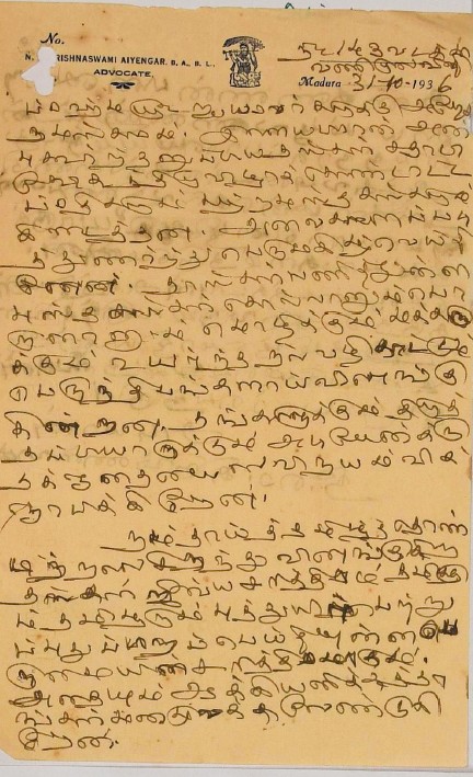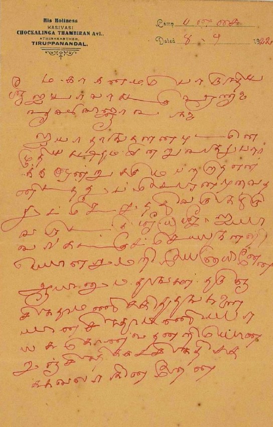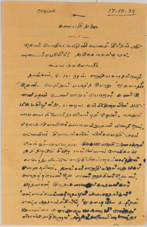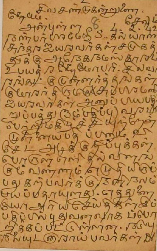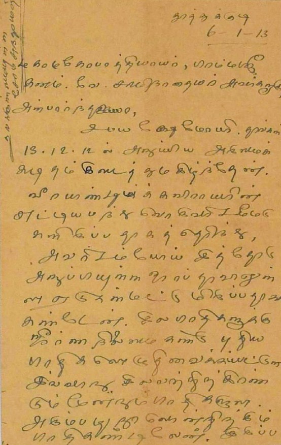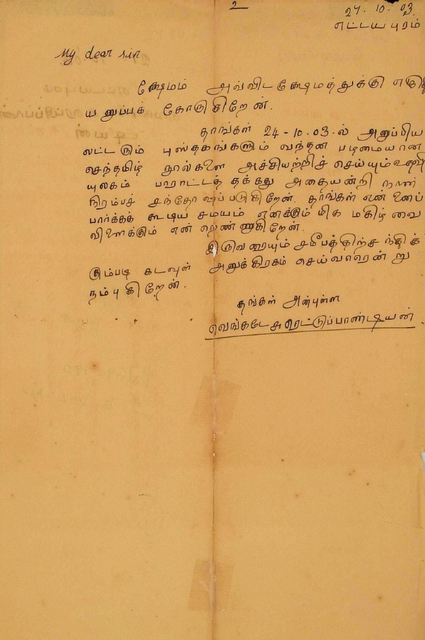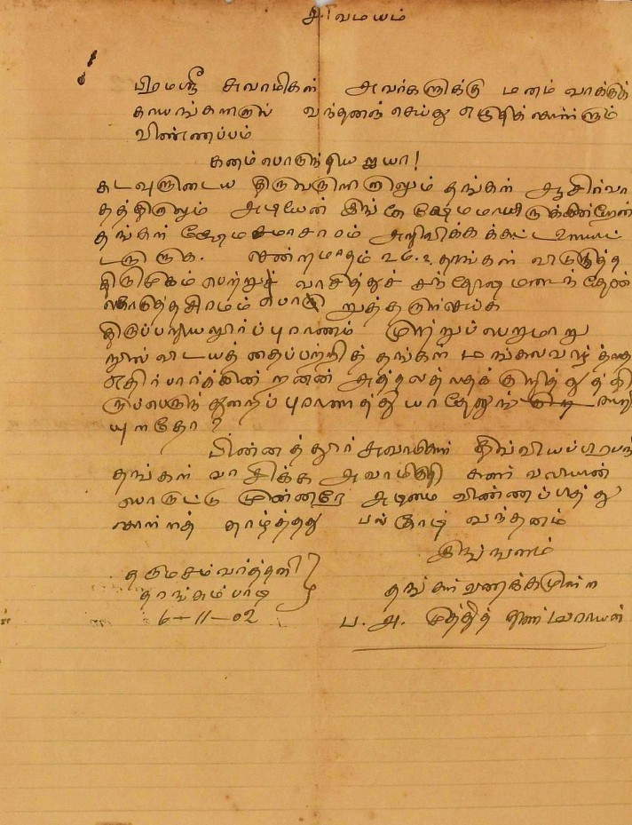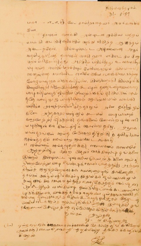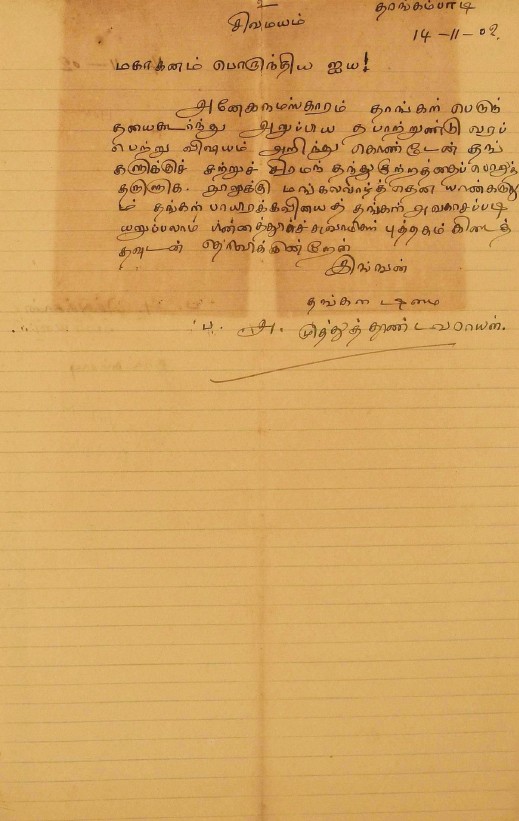 பாராட்டுக் கடிதம் : உ.வே.சாமிநாதையரின் பதிப்புப் பணிக்குப் பாராட்டு மே 19, 1919