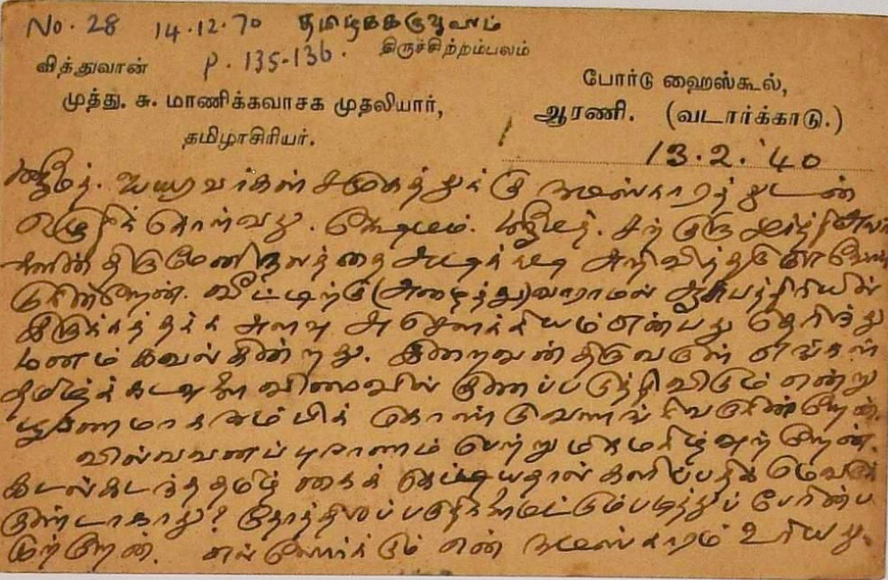 சாமிநாதையரின் 84ஆம் பிறந்தநாள் விழா : உ.வே.சாமிநாதையர் 84ஆம் ஆண்டு பிறந்தநாள் கொண்டாட்டம் பற்றிய மடல் மார்ச்சு 8, 1938