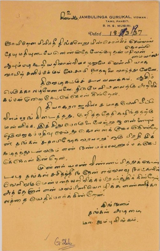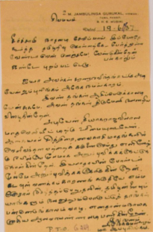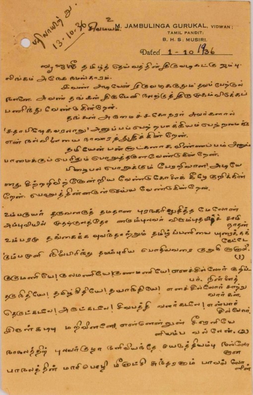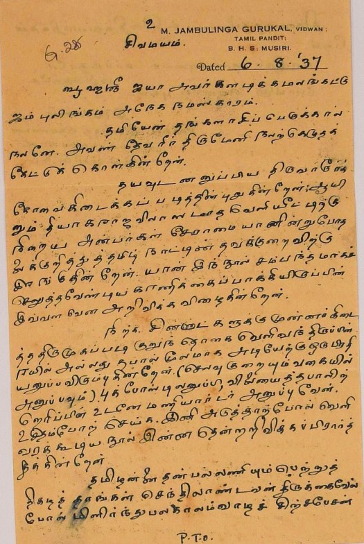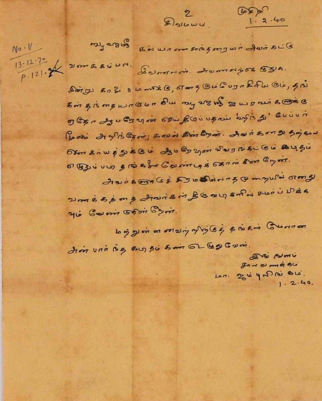 உ.வே.சாமிநாதையர் வாழ்க்கை வரலாறு : உ.வே.சாமிநாதையர் வாழ்க்கை வரலாறு எப்போது வெளிவரும் என்பதை அறிய வேண்டி மடல் அக்டோபர் 16, 1939