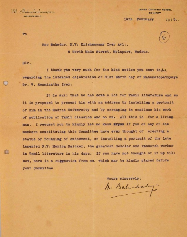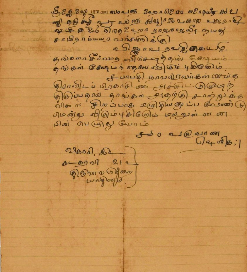 உபகார நிதி தொடர்பாக : மீனாட்சி சுந்தரம்பிள்ளையின் குடும்பத்துக்கு உபகார நிதி திரட்டியது பற்றிய மடல் அக்டோபர் 23, 1915