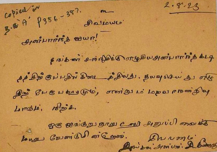 ஐங்குறுநூறு : ஐங்குறுநூற்றுக்கு ஐயரின் உரையைப் பதிப்பிக்க வேண்டி மடல் செப்டம்பர் 17, 1903