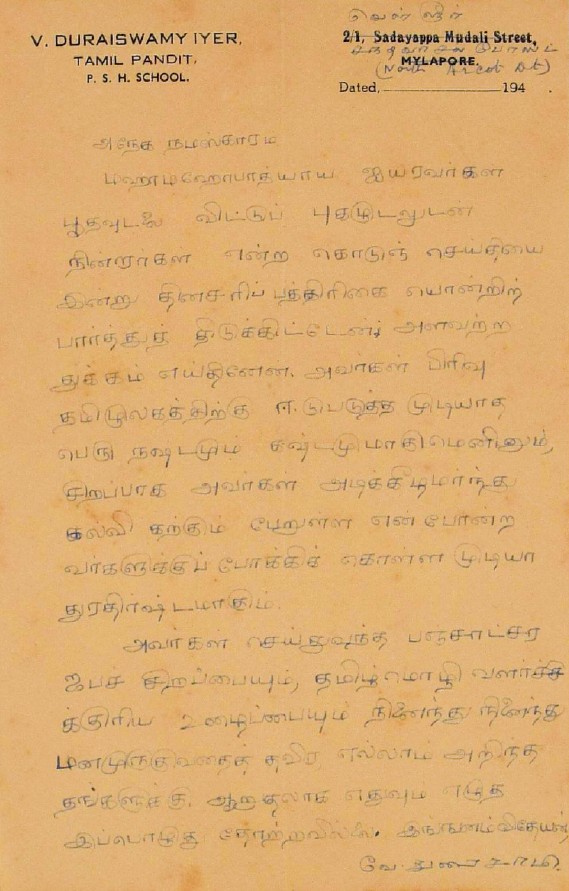 இரங்கல் மடல் : உ.வே.சாமிநாதையரின் மனைவியும் கலியாண சுந்தரம் ஐயரின் தாயுமான மதுராம்பாளின் மறைவுக்கு இரங்கல் மே 11, 1917
